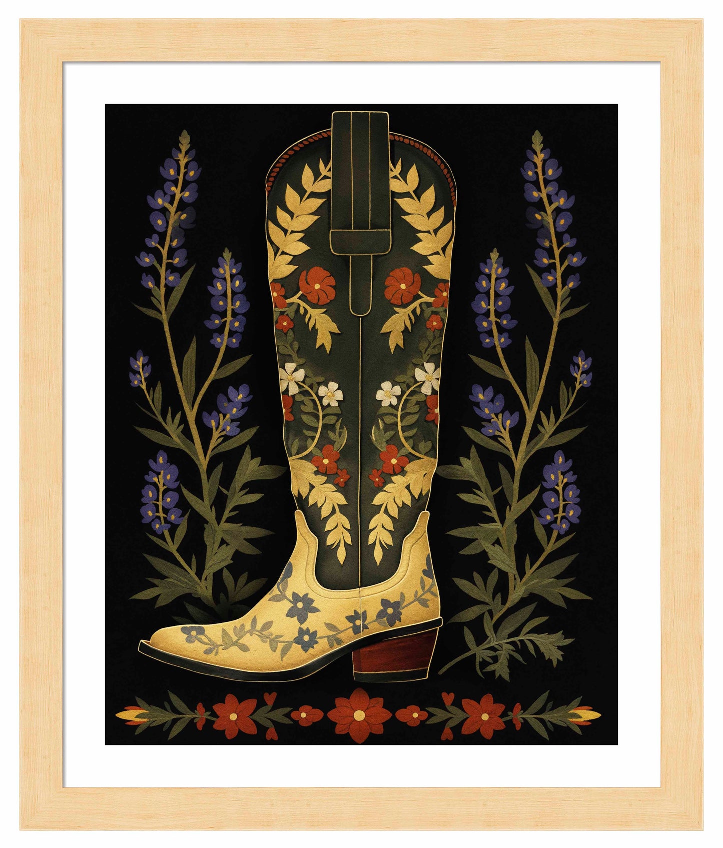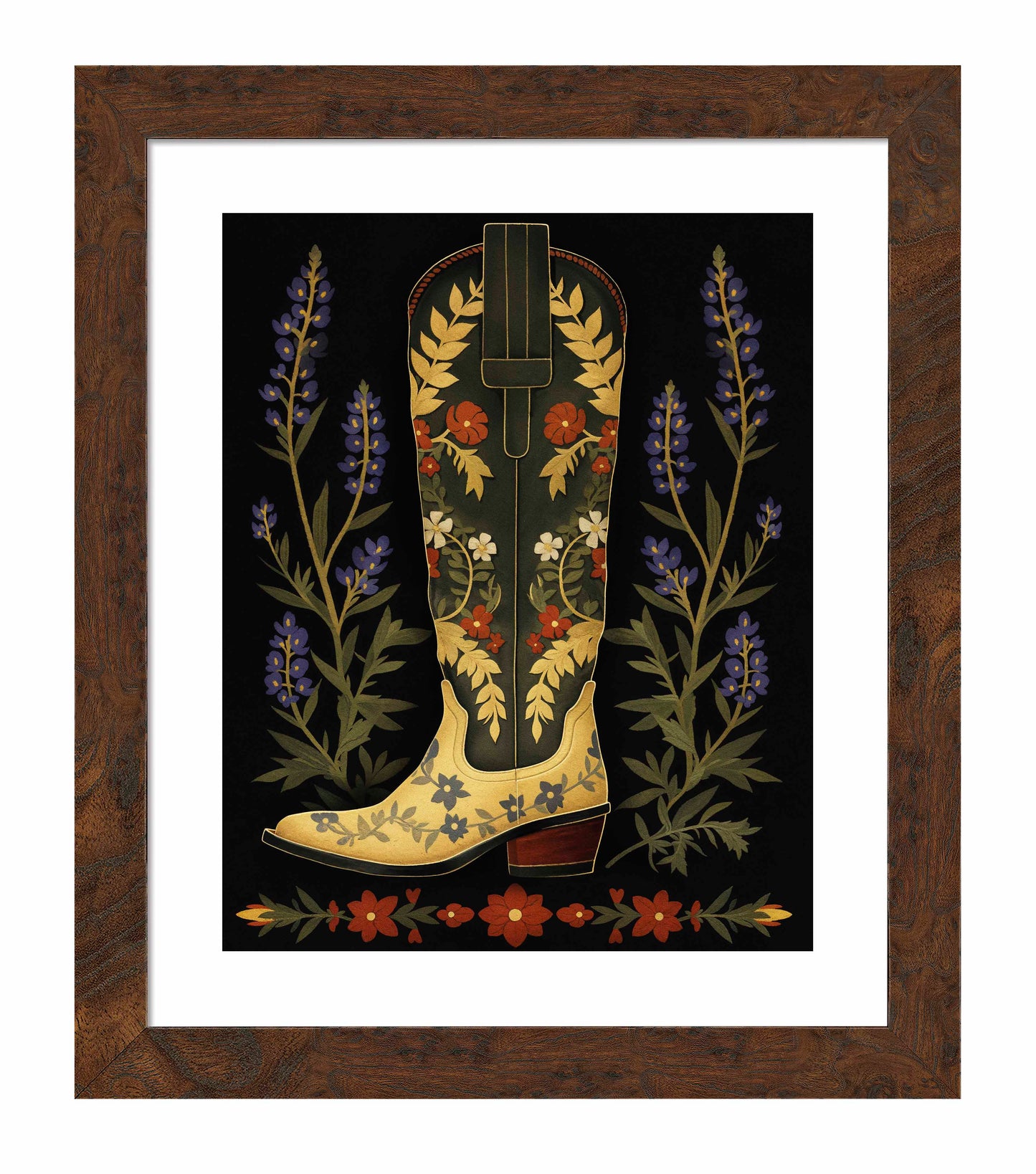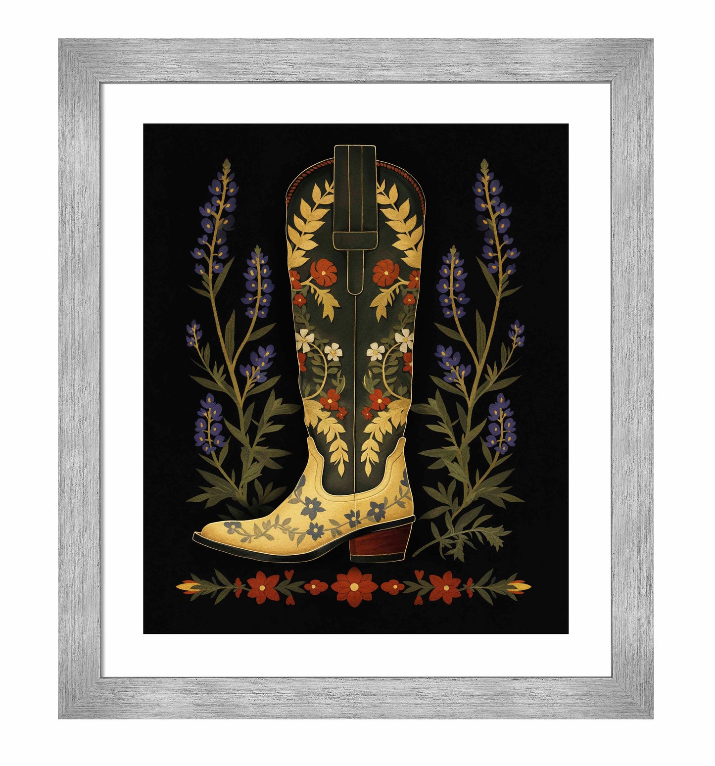 On either side of the boot, tall stalks of bluebonnets frame the central figure, adding a touch of nature’s charm and further enhancing the painting’s theme of Western flora. Below the boot, a series of red and green floral elements form a horizontal border, grounding the composition and adding symmetry to the overall design. The dark background serves to amplify the colors and intricate details of the boot and flowers, making them the focal points of the piece.
