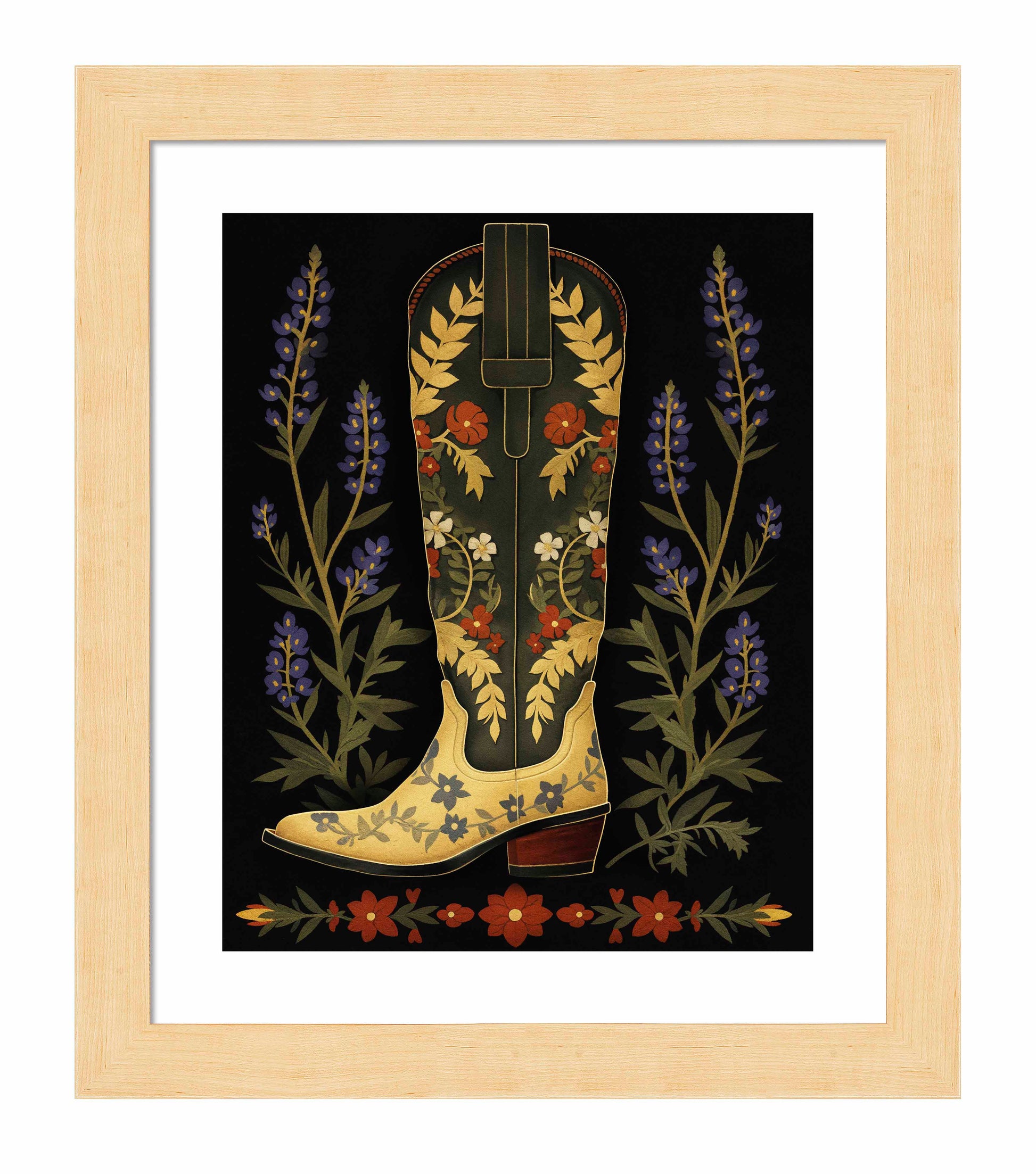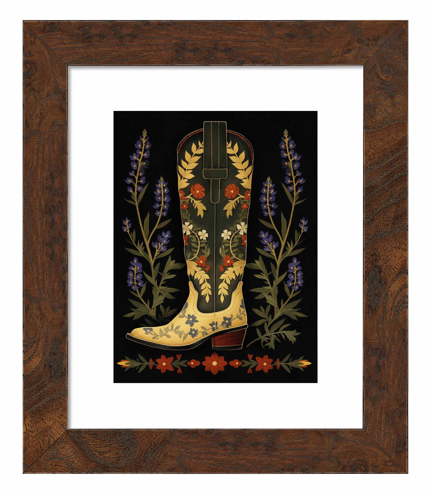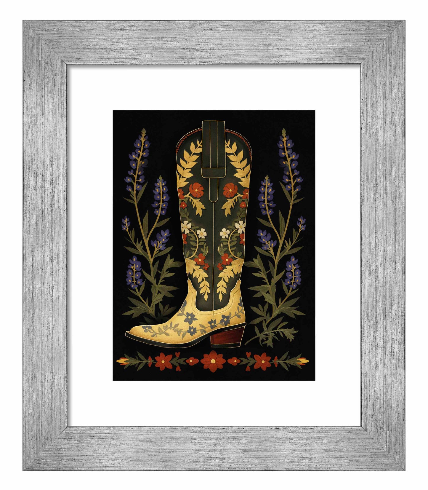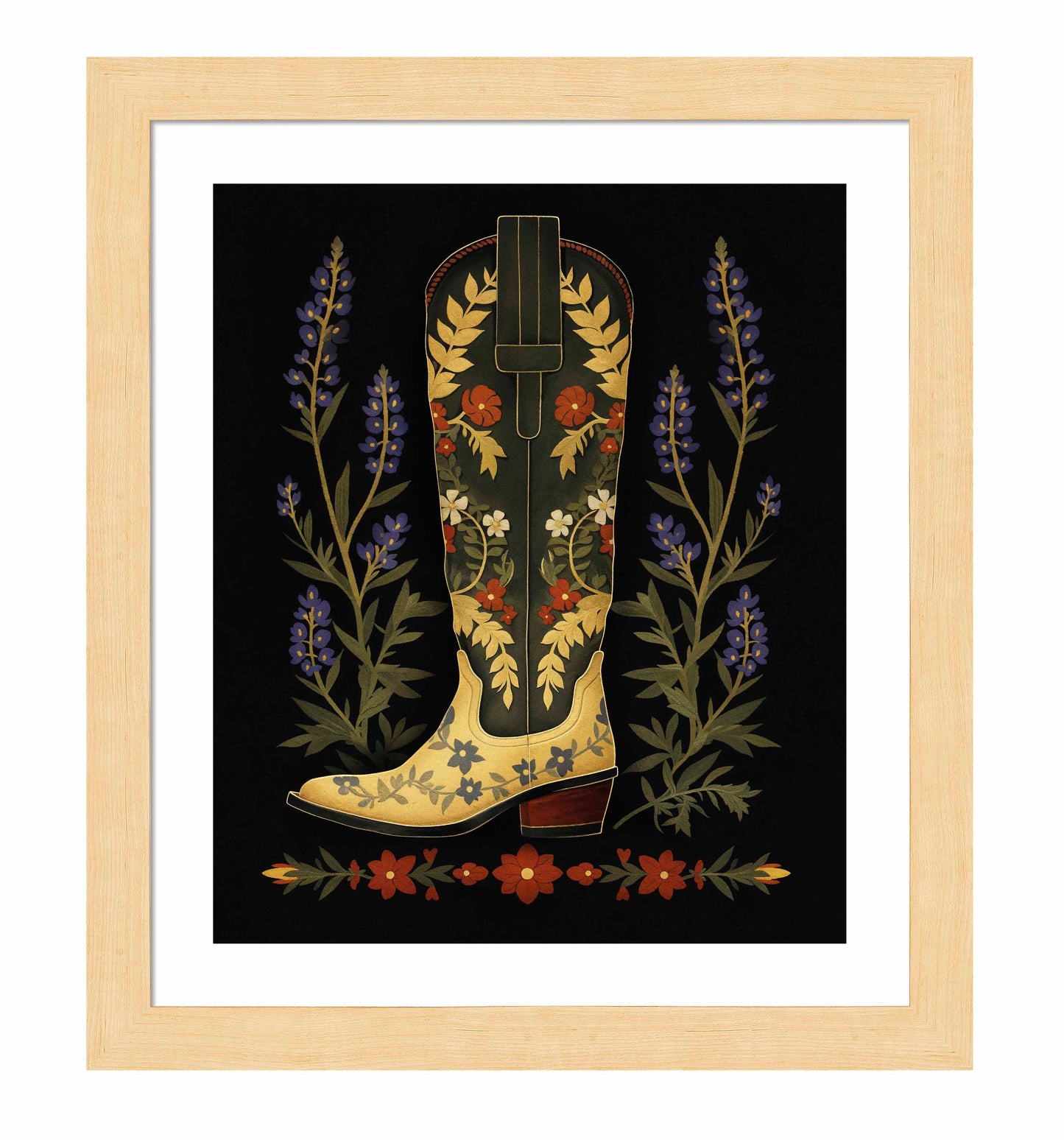 On either side of the boot, tall stalks of bluebonnets frame the central figure, adding a touch of nature’s charm and further enhancing the painting’s theme of Western flora. Below the boot, a series of red and green floral elements form a horizontal border, grounding the composition and adding symmetry to the overall design. The dark background serves to amplify the colors and intricate details of the boot and flowers, making them the focal points of the piece.
