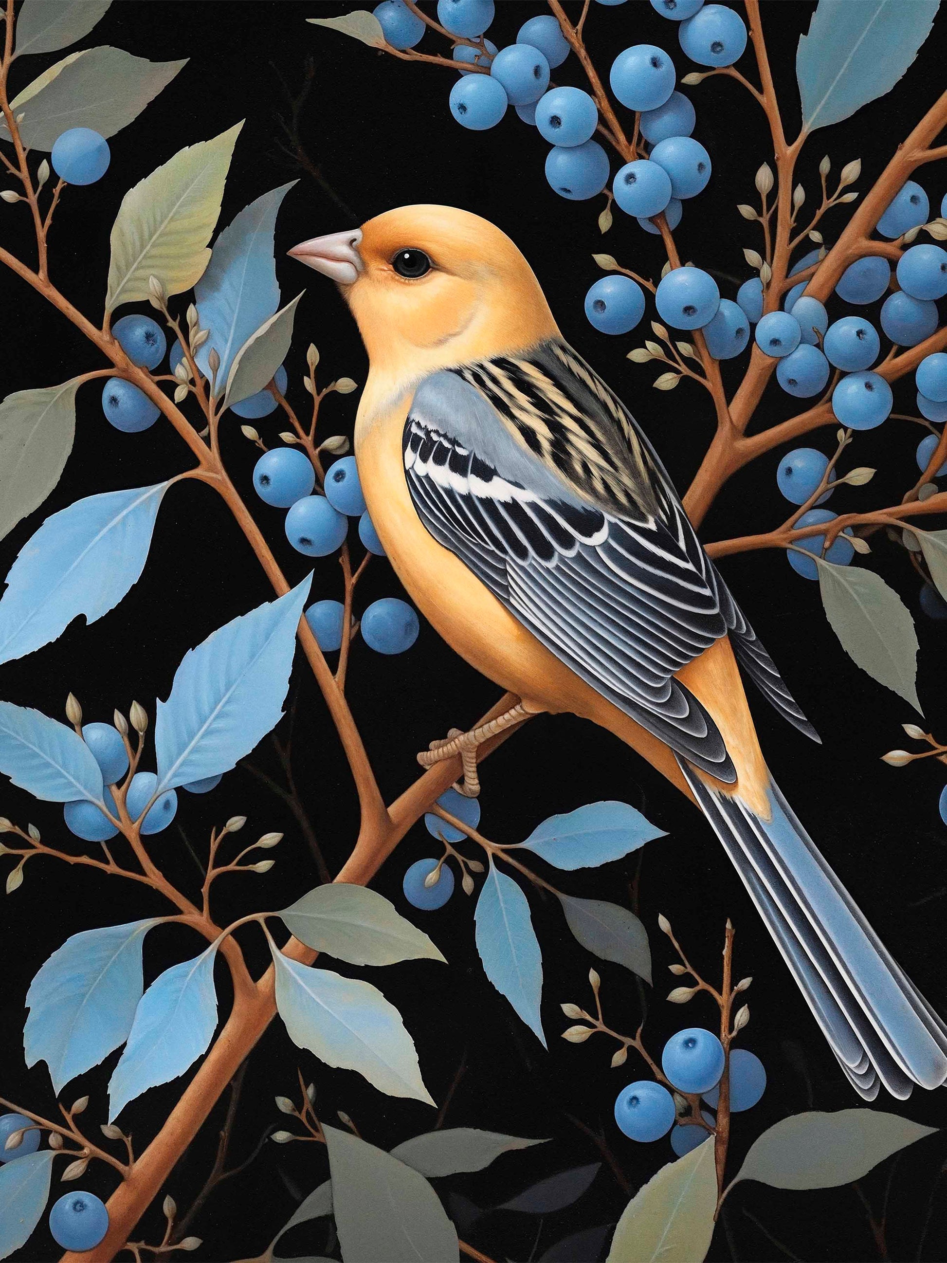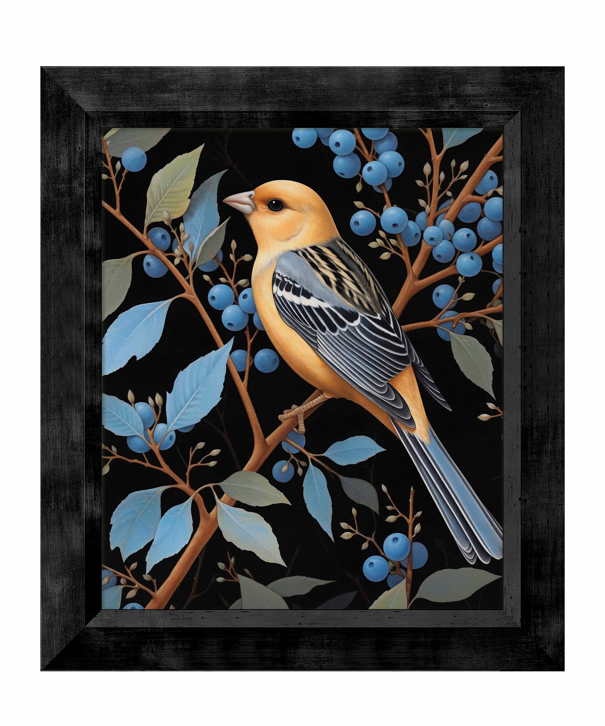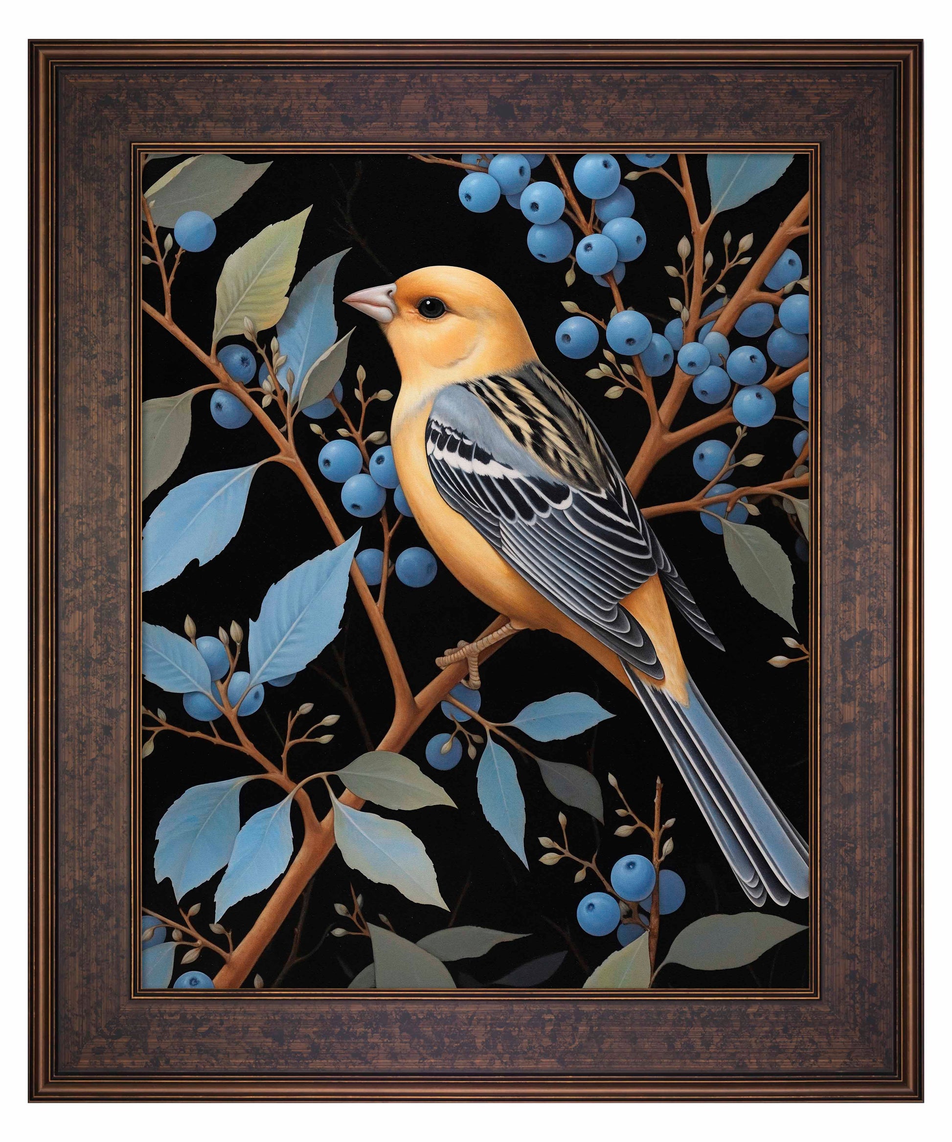Bounty of Blue - Oriole Amidst Berries is a captivating piece from the Backyard Sanctuary Collection, depicting a vibrant oriole perched gracefully amidst a lush array of blue berries and foliage. The oriole's bright yellow and black plumage stands out beautifully against the deep blue berries and the contrasting dark background, creating a visually striking composition.