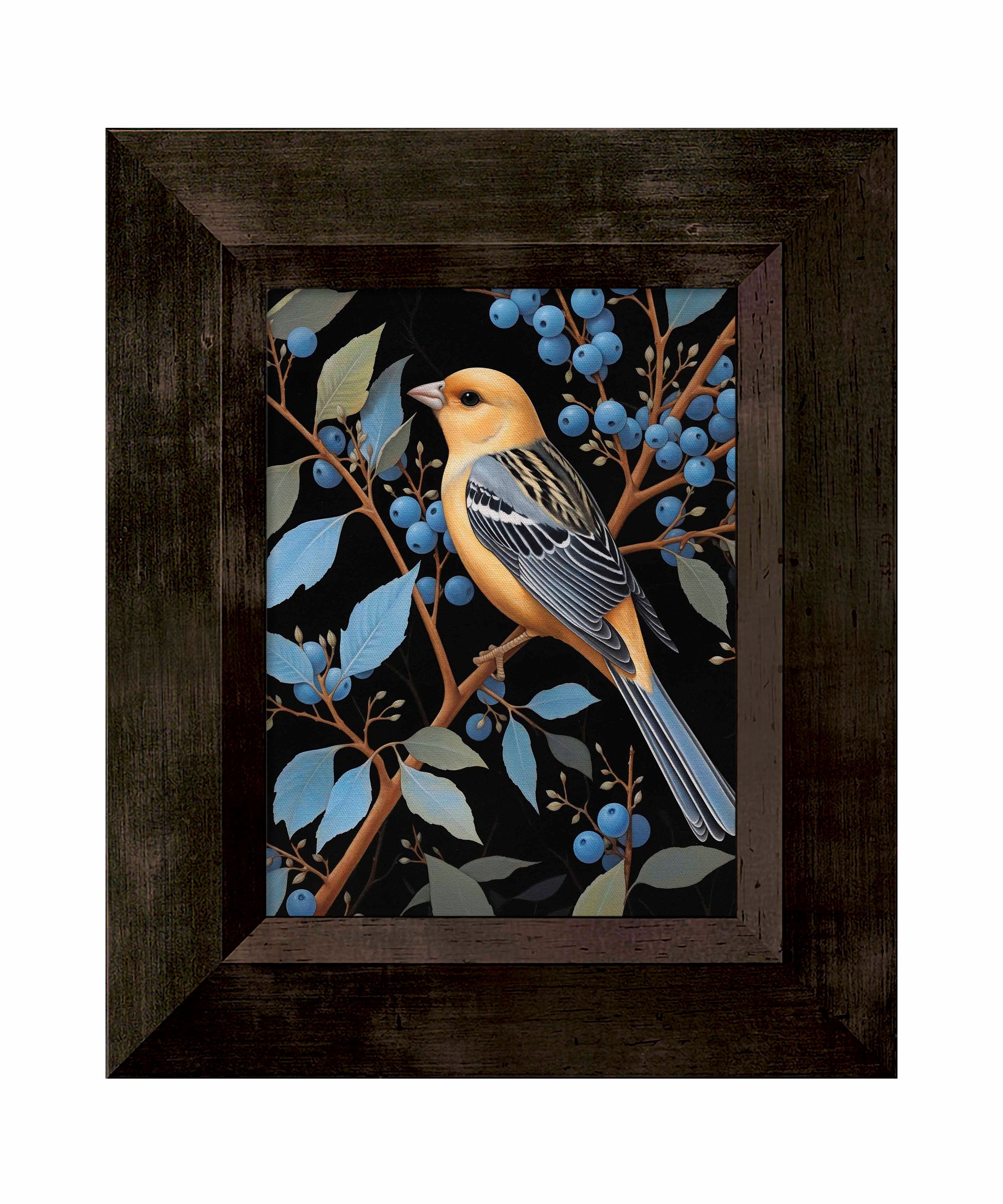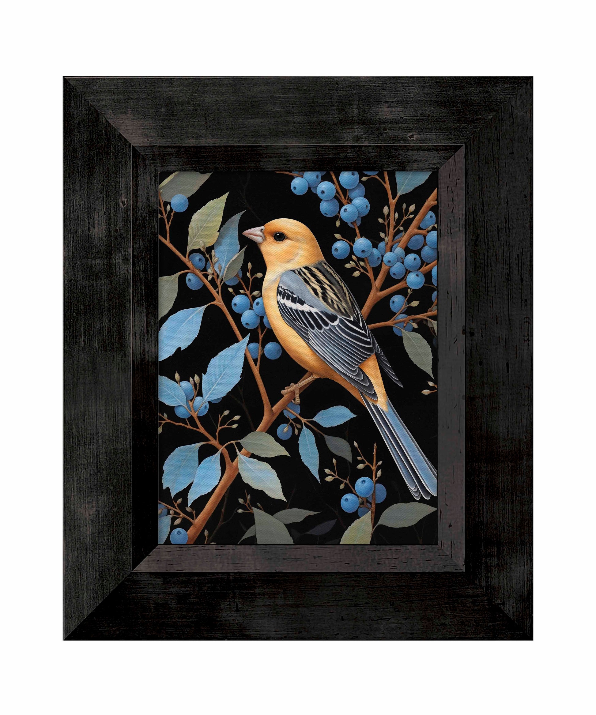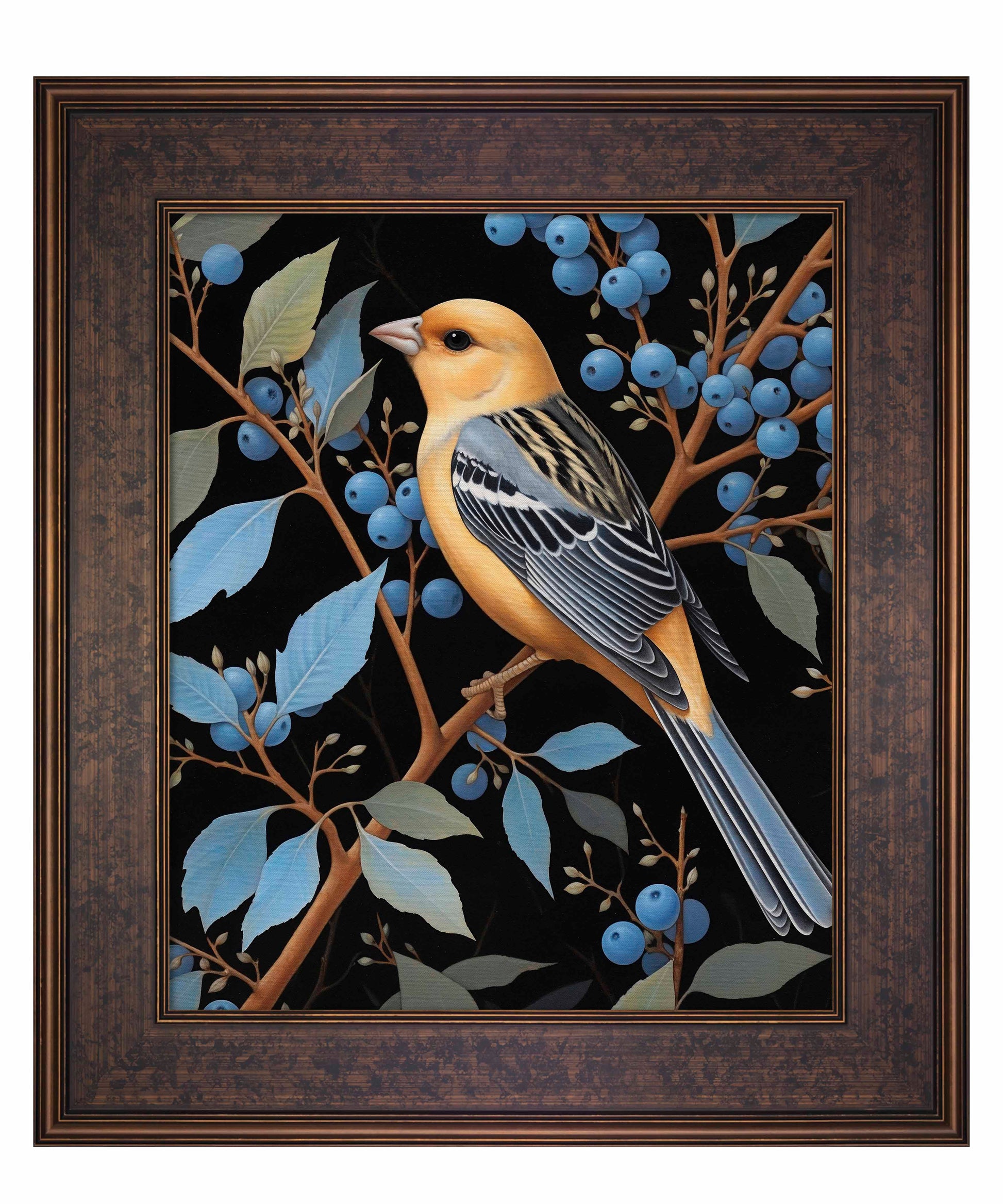 Bounty of Blue - Oriole Amidst Berries is a captivating piece from the Backyard Sanctuary Collection, depicting a vibrant oriole perched gracefully amidst a lush array of blue berries and foliage. The oriole's bright yellow and black plumage stands out beautifully against the deep blue berries and the contrasting dark background, creating a visually striking composition.