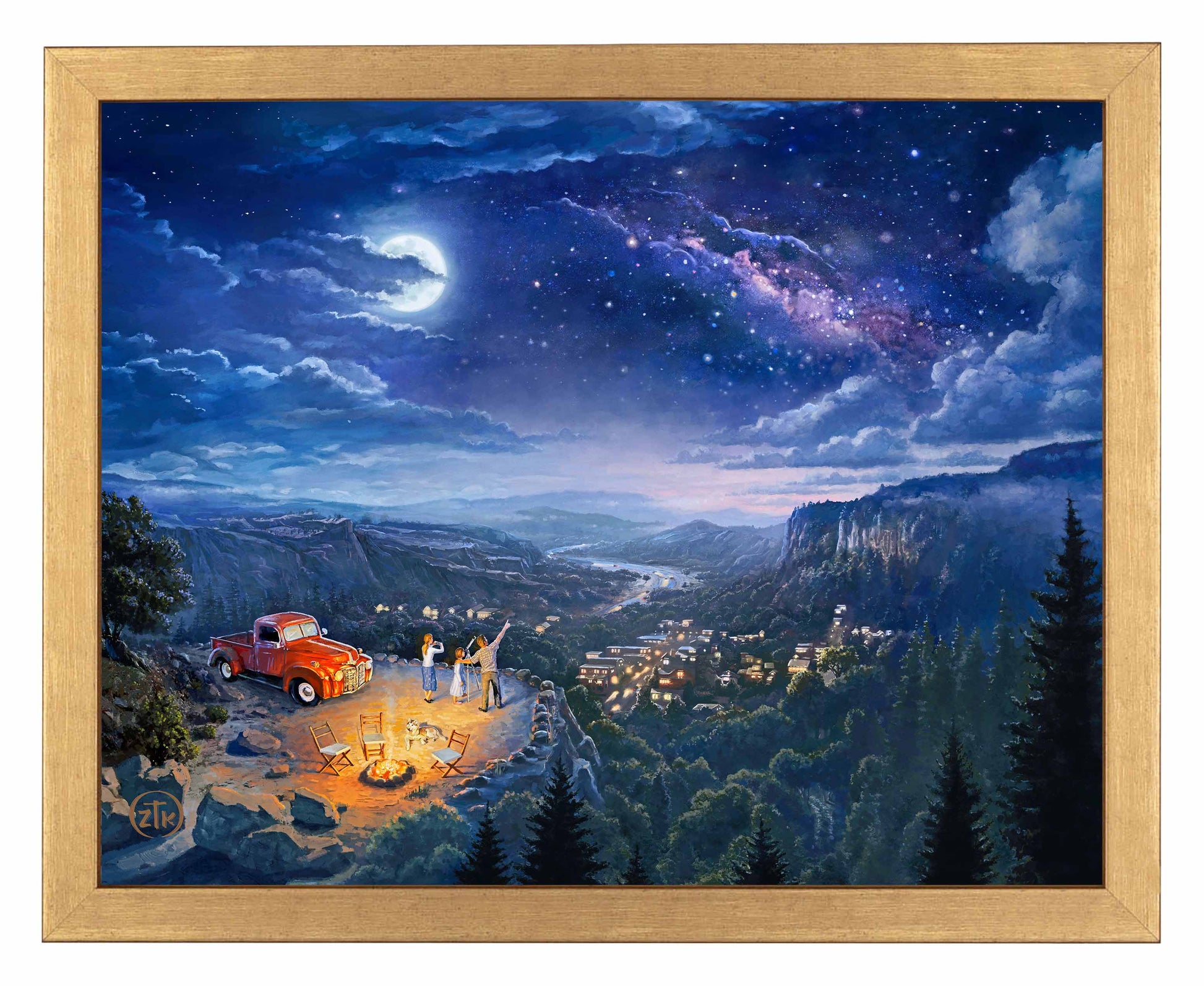 Thomas Kinkade, my brother, was privileged to see Beyond the Farthest Star prior to its release and was immediately moved. The above verse from Isaiah came to his mind during its viewing and in relation to the themes portrayed in this magnificent film. Thom cried thinking of the Lord's capacity to restore, redeem and reconcile even in what may appear to be the most hopeless of circumstances. He truly came to appreciate the meaning of "beauty for ashes". To say the experience stayed with him does not fully capture its impact. As he often did, Thom wished to take brush to canvas and express his heart in oil. He wanted others to know what the film made him feel about the rebirth we are promised in the Bible and that the story depicted. Sadly, we are only allowed a glimmer of what that masterpiece may have been. The painting planned was only realized through sketch work and color study, the oil work would never come to be. Thom was called home before its completion. The passing of my brother profoundly affected all who knew him and for time this project was, as were many others, lost in our collective grief. We simply set it aside thinking the work could not be finished. Then Thom's initial work caught the eye of Zachary Thomas Kinkade, my son and Thom's nephew. He, like his uncle, is an artist of accomplishment and a prodigious talent. As Zac had opportunity to see the film and thought of what his Uncle Thom had started he picked up the mantle and asked to be allowed to finish the painting. And so, Zachary and all of us involved in this work are allowed to give beauty for ashes. A small family gathers at an overlook to their small town. Above them stretches the infinite heavens and a singular question. What lies beyond the farthest star? We all miss you Thom. We know you have found the answer to that question and wait there to share it with us all. To those who knew him, to those who cared about him and to all those who will come to see him in and love him through his work, God bless and thank you for sharing the light. - Patrick Kinkade