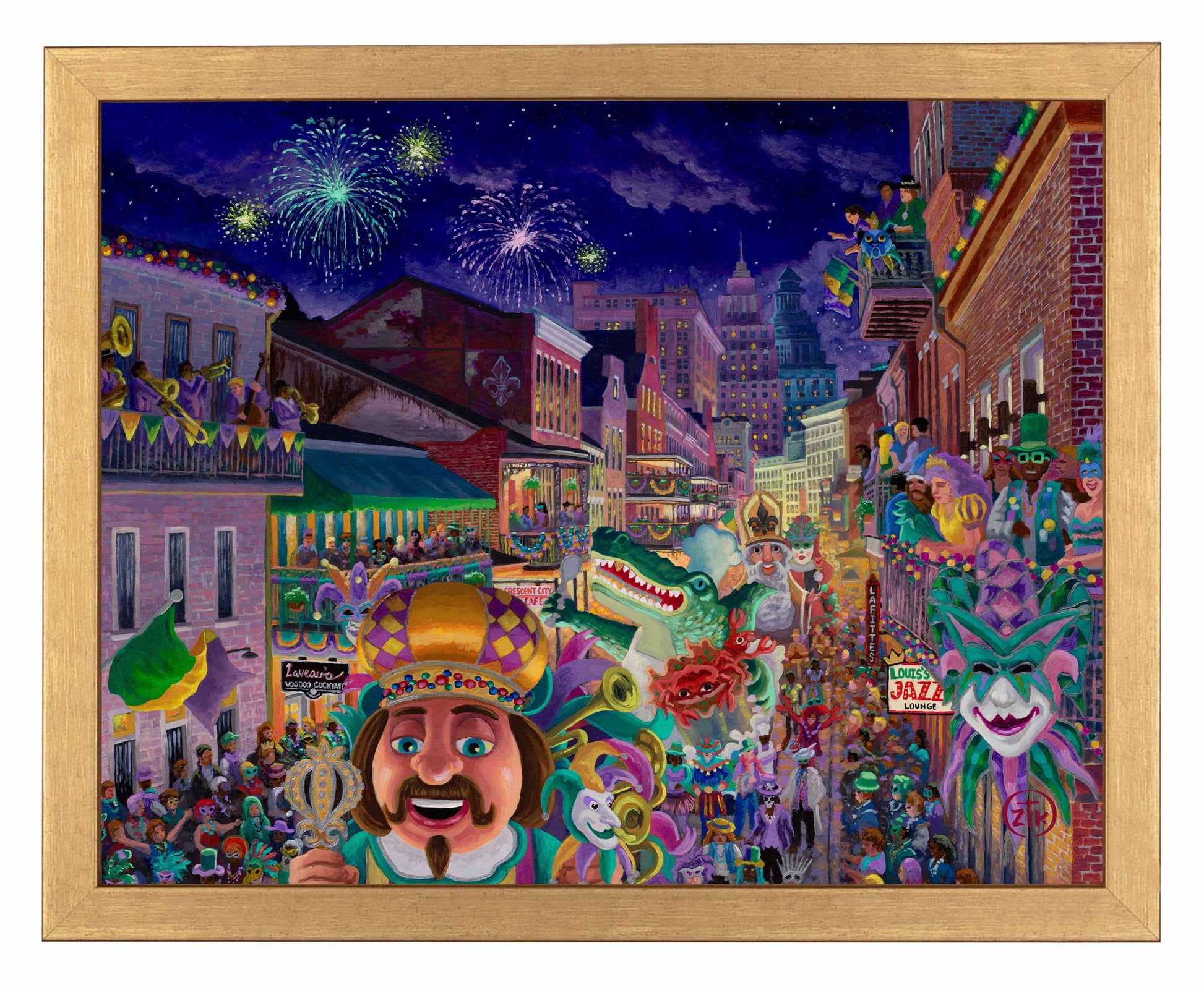 In my latest painting, The Big Easy, revelers fill the streets as a Mardi Gras parade dances by the city's famous balconies. The sound of jazz wafts through the crowds as beads are thrown, and concoctions of good cheer are hoisted in observance of Fat Tuesday. I smile, thinking of the thrill felt while being swept along in that wave of humanity. Look closely at the gathering and discover allusions to the Crescent City's most notable and notorious denizens. From pirates to piano players, they are all there as part of the envisioned festival and adding to the cacophony of sound it might create. I hope you all enjoy this visit to one of my favorite places, and thank you for sharing my adventure in art.