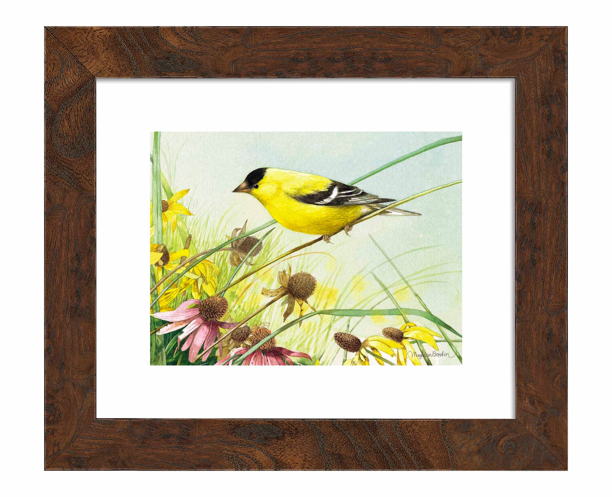 While I was taking a moment to take it all in an American Goldfinch landed on a stem right in front of me. The beauty of it took my breath away: a bright yellow bird in the middle of a sea of yellow flowers. Then slowly, very slowly, the stem bent down under the weight of the finch and the inspiration for my painting was complete. I immediately knew I had to make this painting to capture that sense of enchantment forever.