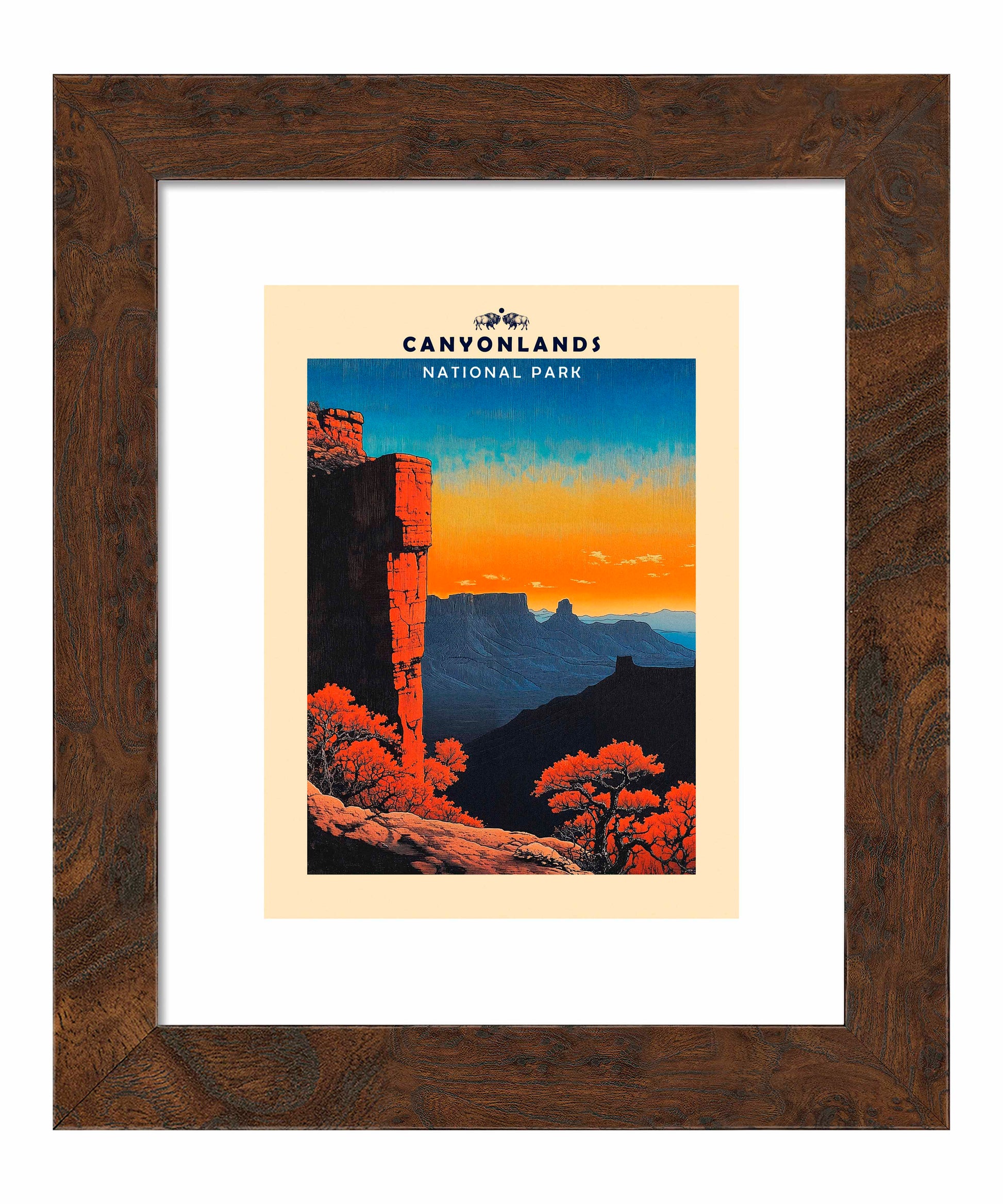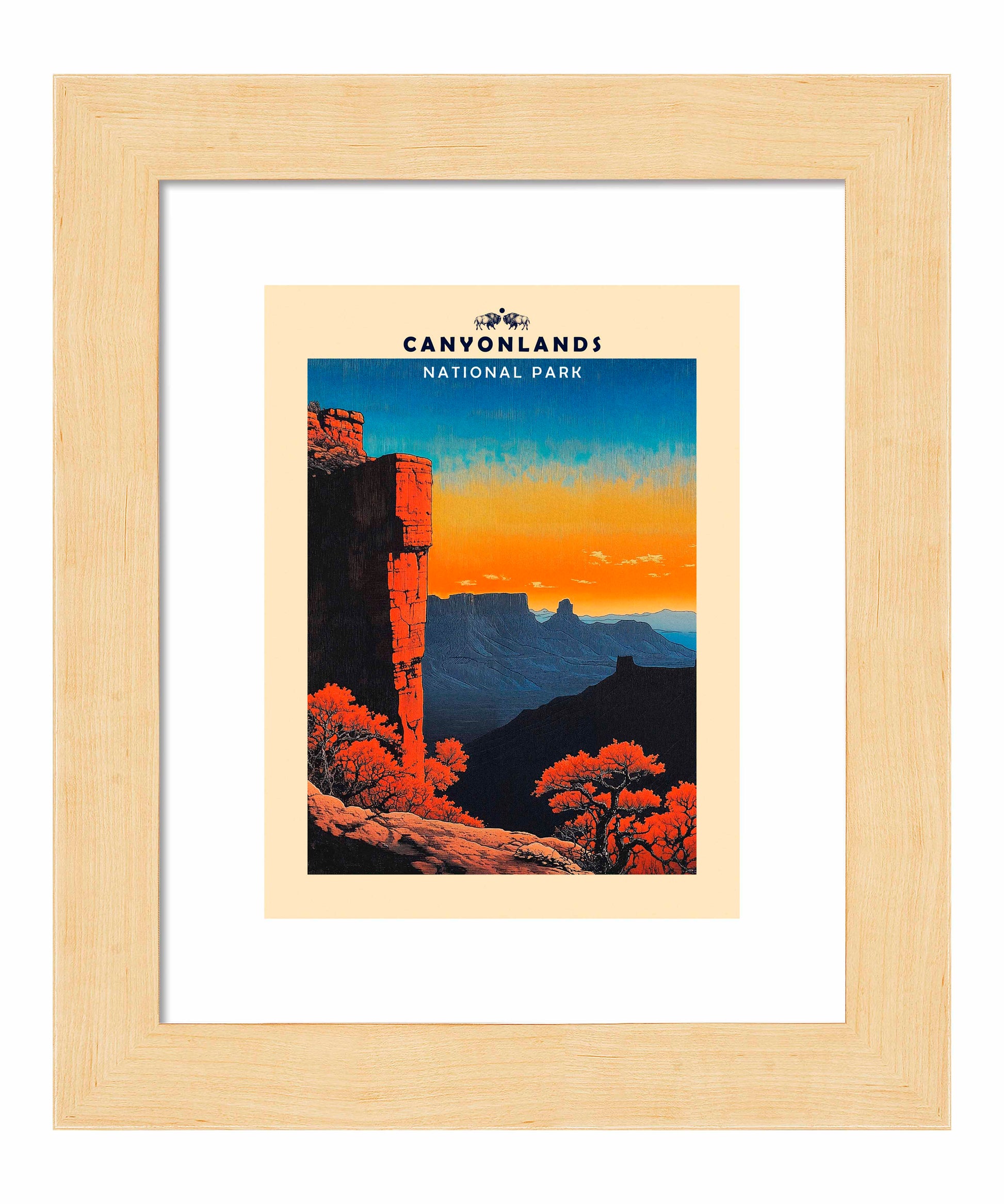 This vintage-style poster art of Canyonlands National Park captures the park's dramatic landscape in a striking composition. The foreground features a towering red rock formation, likely one of the park's iconic mesas or buttes, set against a vibrant sunset sky that transitions from deep blue to orange. The stark contrast between the illuminated rock face and the shadowed canyons creates a sense of depth and grandeur. In the mid-ground, vibrant orange trees add a pop of color and life to the rugged terrain. The background reveals silhouettes of distant mesas and canyons, emphasizing the vast expanse of the park. The limited color palette and simplified shapes are characteristic of mid-20th century travel poster aesthetics, effectively conveying the park's majestic beauty and enticing viewers to experience its awe-inspiring vistas firsthand.