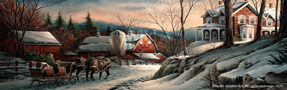 In this nostalgic scene 'coming home' becomes a place and a feeling. It speaks to us of a tradition we share, if not in actual fact, then in the values it represents. The Christmas tree has been cut from just down the road. We can imagine the fresh smells of baking bread in the kitchen. The farm house will soon be alive with the joyful sounds of children from two generations. And the pole signs in front of the barn tell us there are other farms nearby where similar preparations are underway.