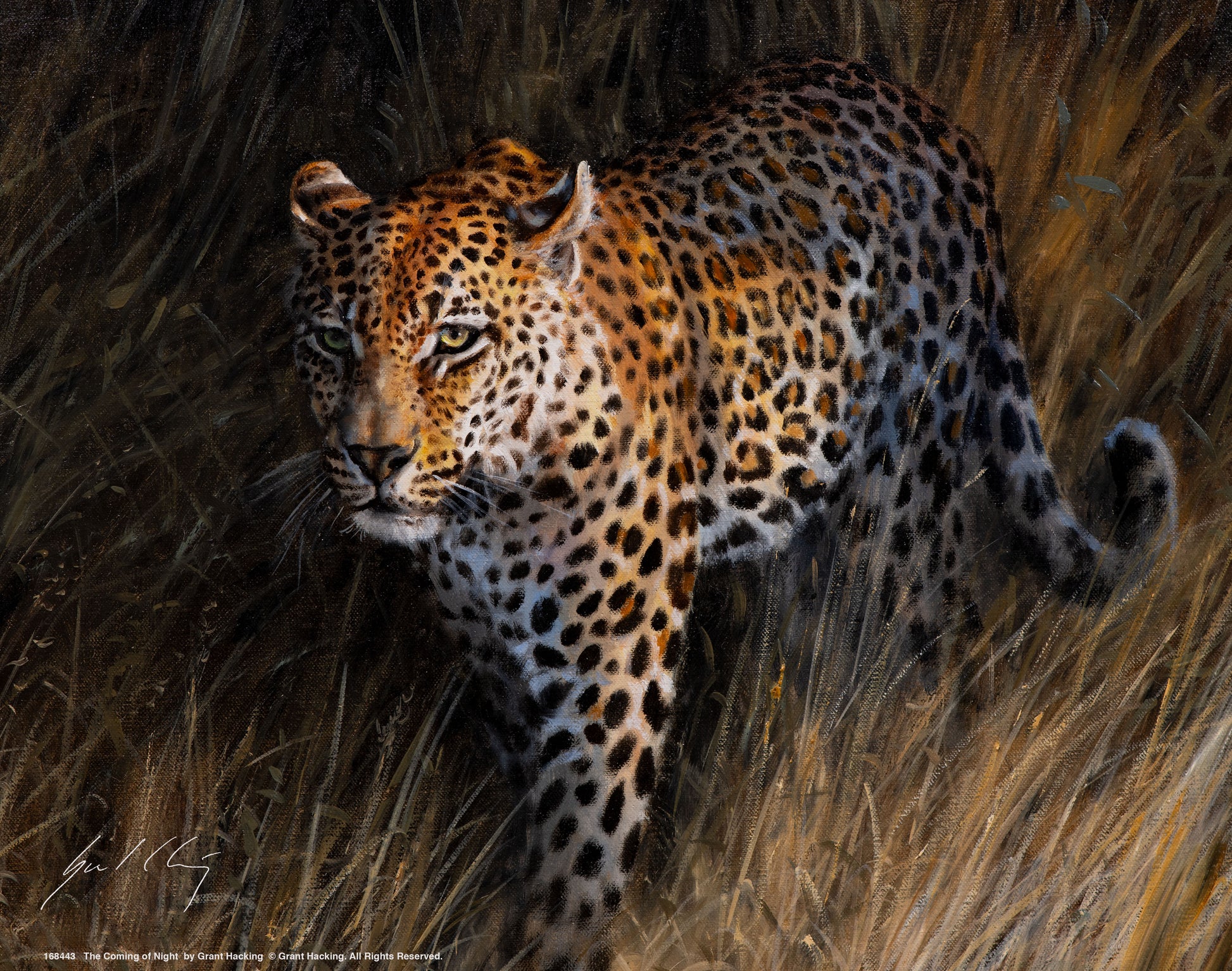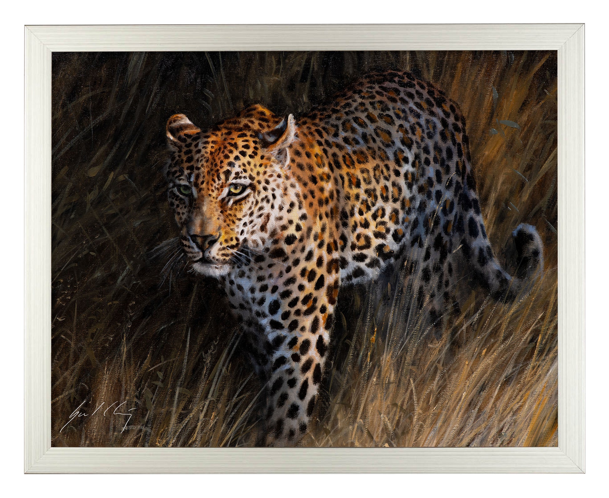 I wanted to paint this leopard for some time, but I just couldn’t get a good picture in my mind. I knew I wanted the long dark shadows and that last bit of late afternoon light illuminating his face. Then I found this dark moody frame. I painted the black details on each corner, and it was a perfect match for what I wanted to create. This is another example of how a frame inspired my painting.