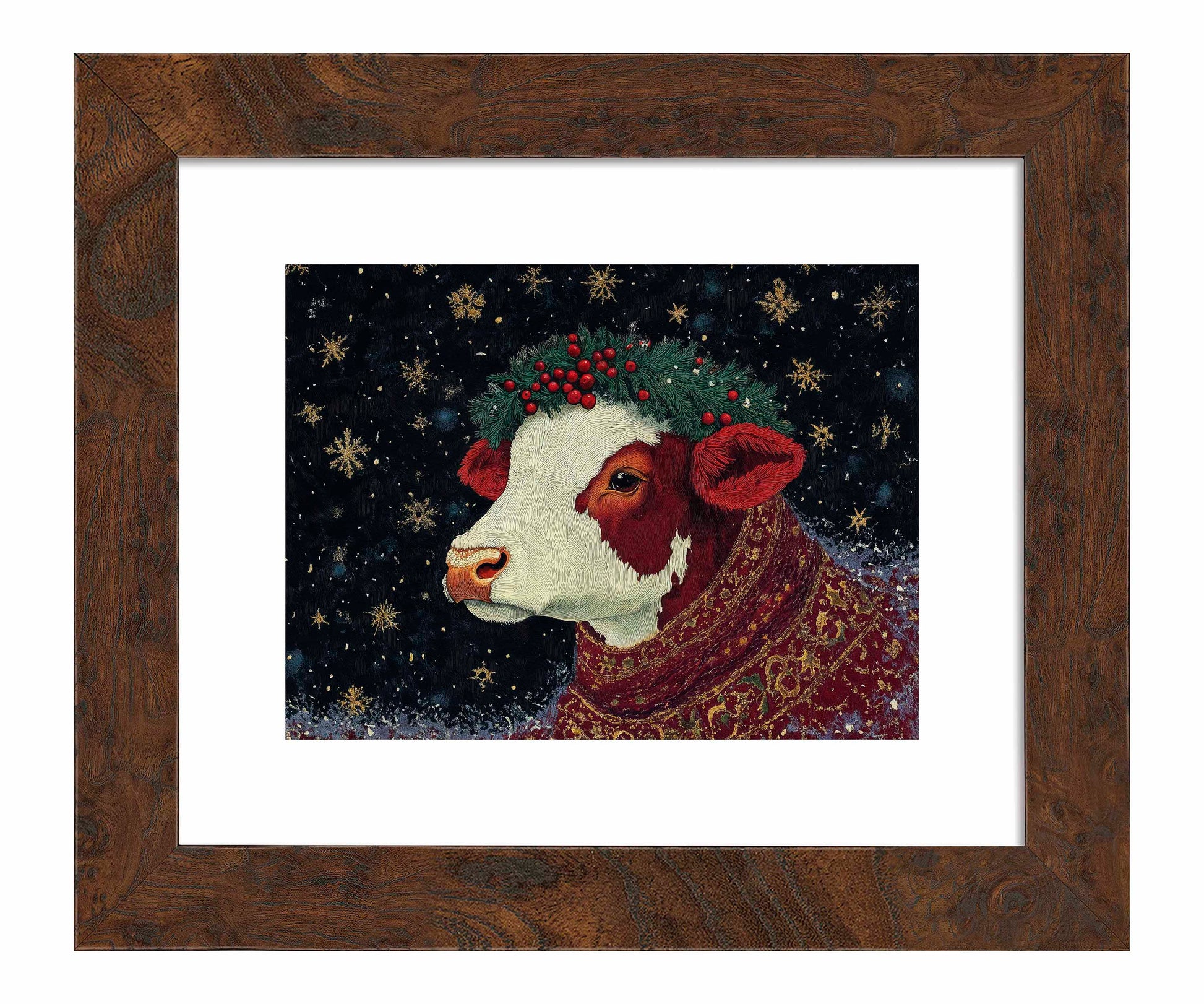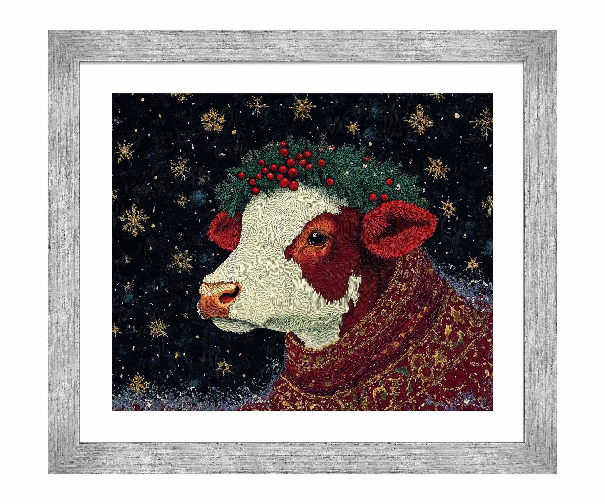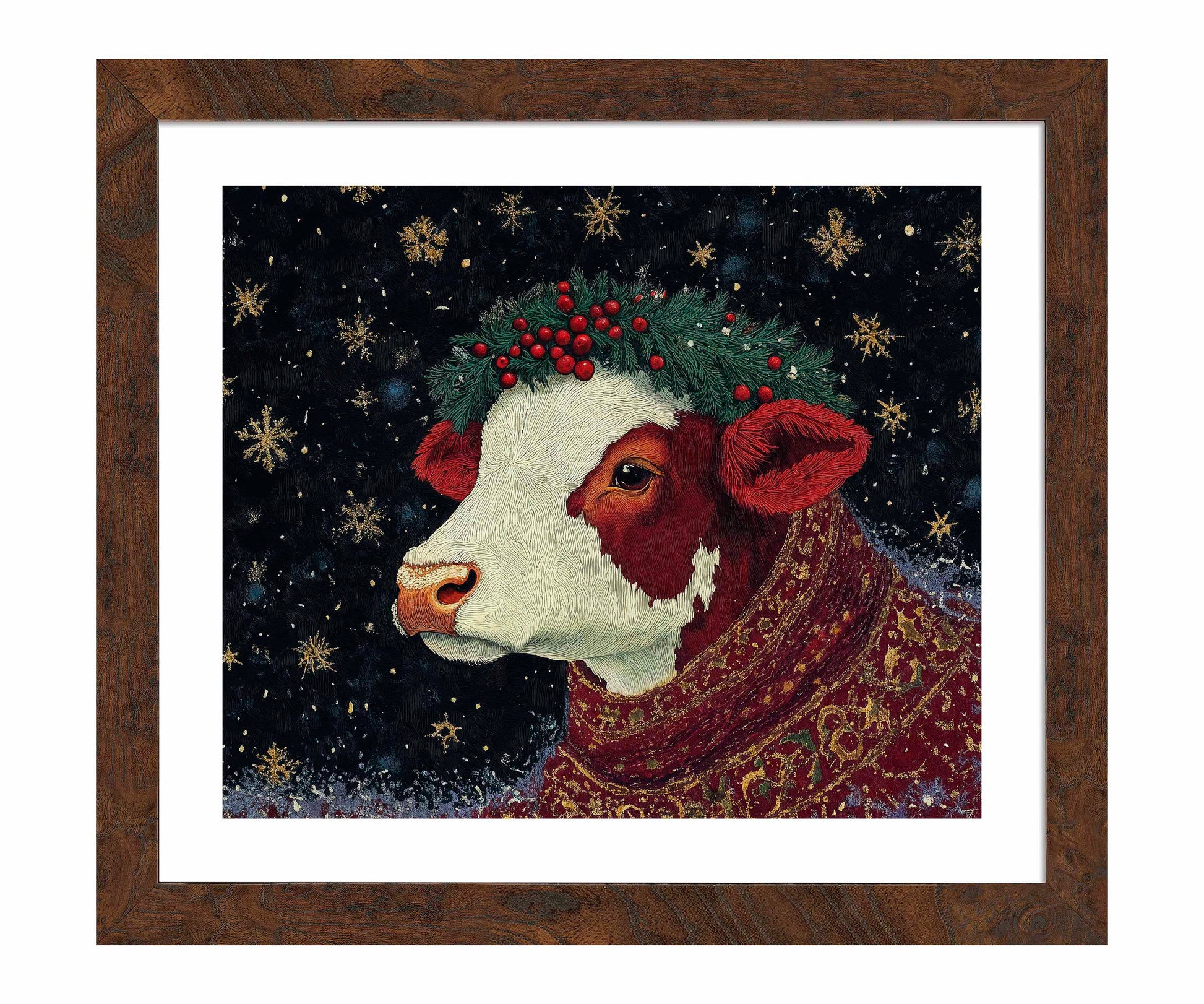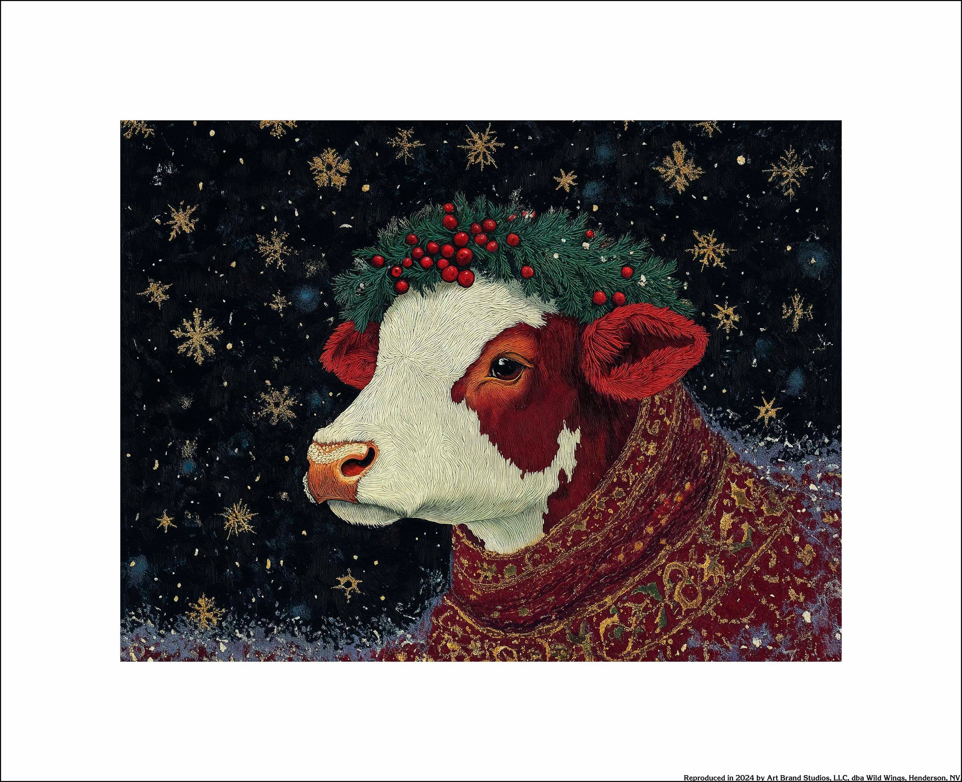 "Cowbell Carol" presents a whimsical and charming fusion of pastoral imagery and holiday spirit. The focal point of this artwork is a beautifully rendered portrait of a Hereford cow, its red and white face depicted with remarkable detail and warmth. The cow is adorned with a festive crown of evergreen boughs and bright red berries, reminiscent of a traditional Christmas wreath. Adding to the holiday theme, the animal wears an ornate red and gold scarf or blanket, its intricate patterns suggesting both regal elegance and cozy comfort. Set against a deep, starry night sky scattered with golden snowflakes, the piece captures a magical winter atmosphere. The artist's technique appears to blend elements of realism with a folk art sensibility, resulting in a texture-rich surface that invites close inspection. The color palette, dominated by the rich reds and creamy whites of the cow, contrasted with the deep blue-black of the night sky and accented with gold, creates a visually striking and festive composition. This unique interpretation of holiday imagery celebrates the charm of rural life while infusing it with the wonder and warmth of the Christmas season, elevating a humble farm animal to a position of endearing majesty.