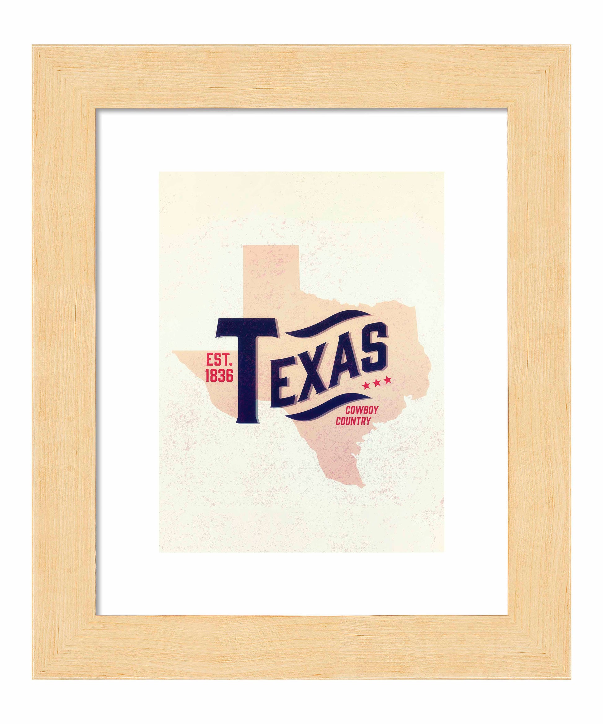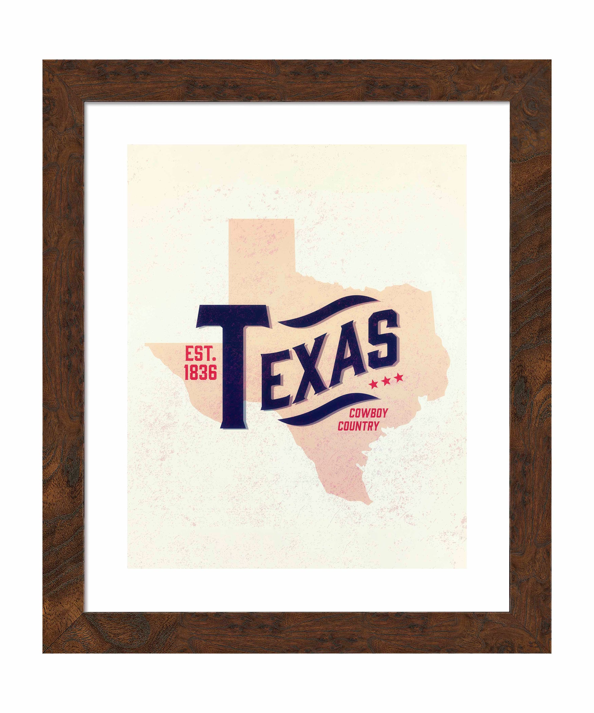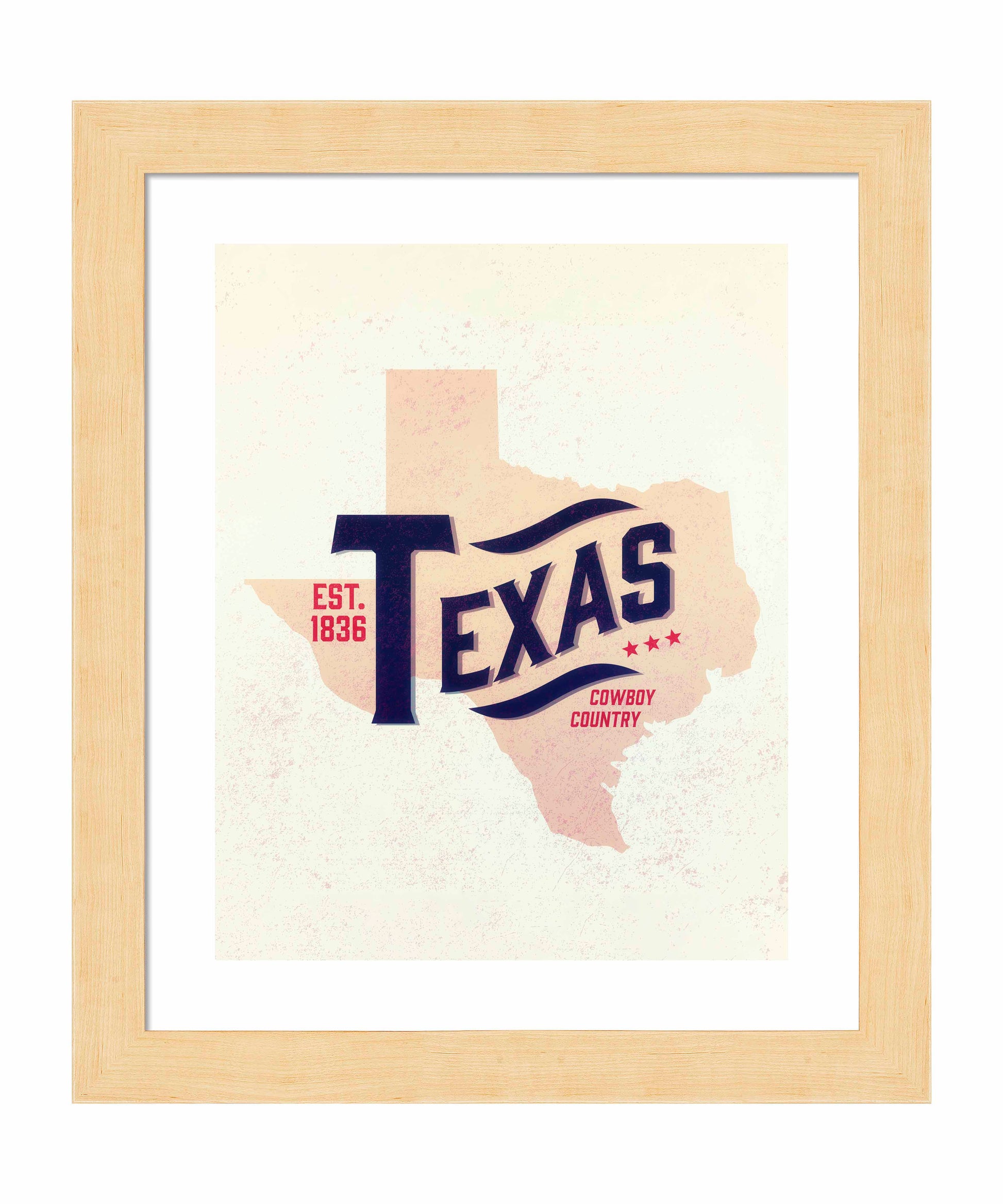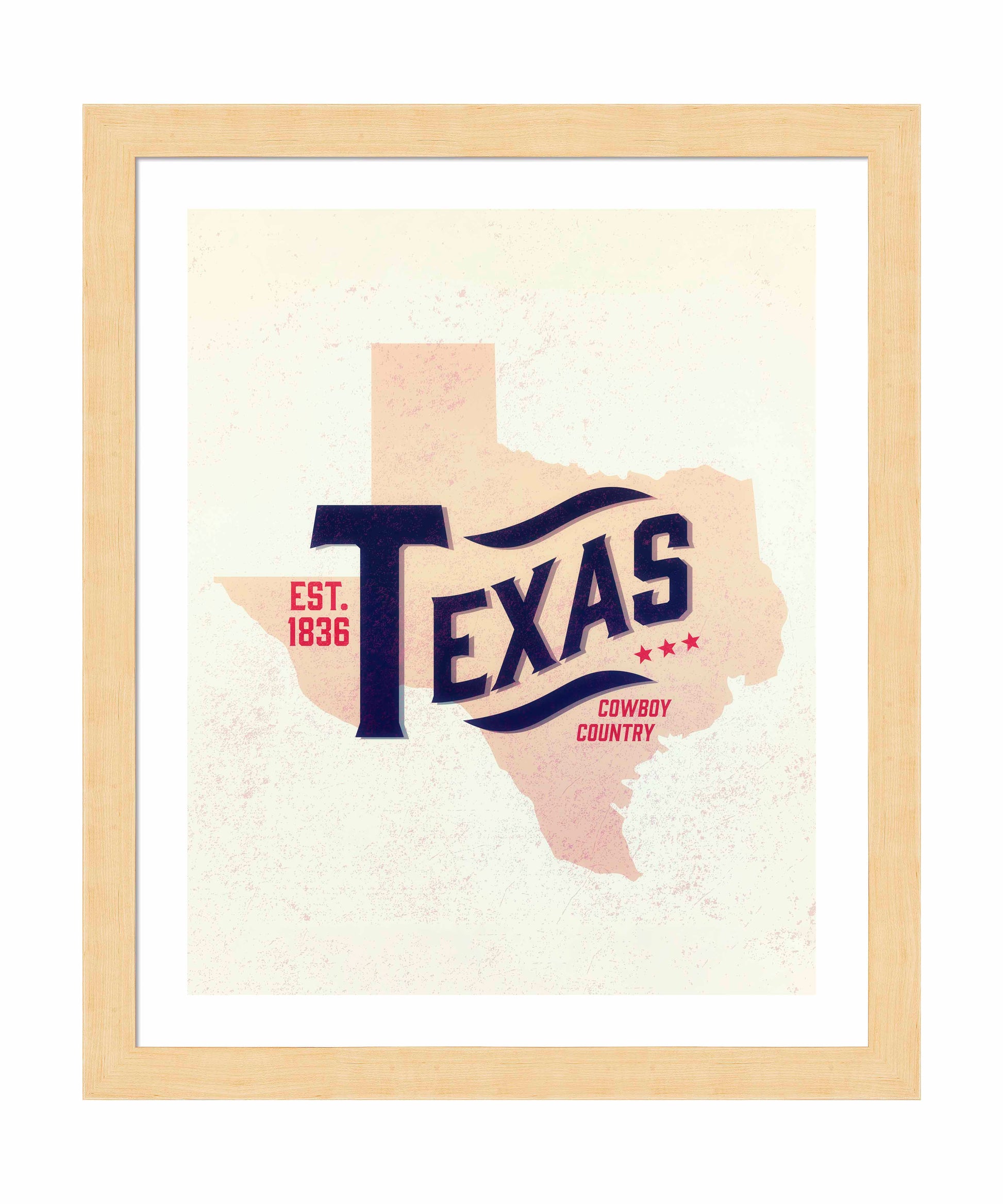 Cowboy Country is a bold and proud homage to the state of Texas and its deep-rooted cowboy culture. The composition features the unmistakable outline of Texas, anchored by strong typography and retro-inspired design elements. The word ""TEXAS"" dominates the piece, set in a rugged, Western-style font that evokes the strength and independence associated with the Lone Star State.