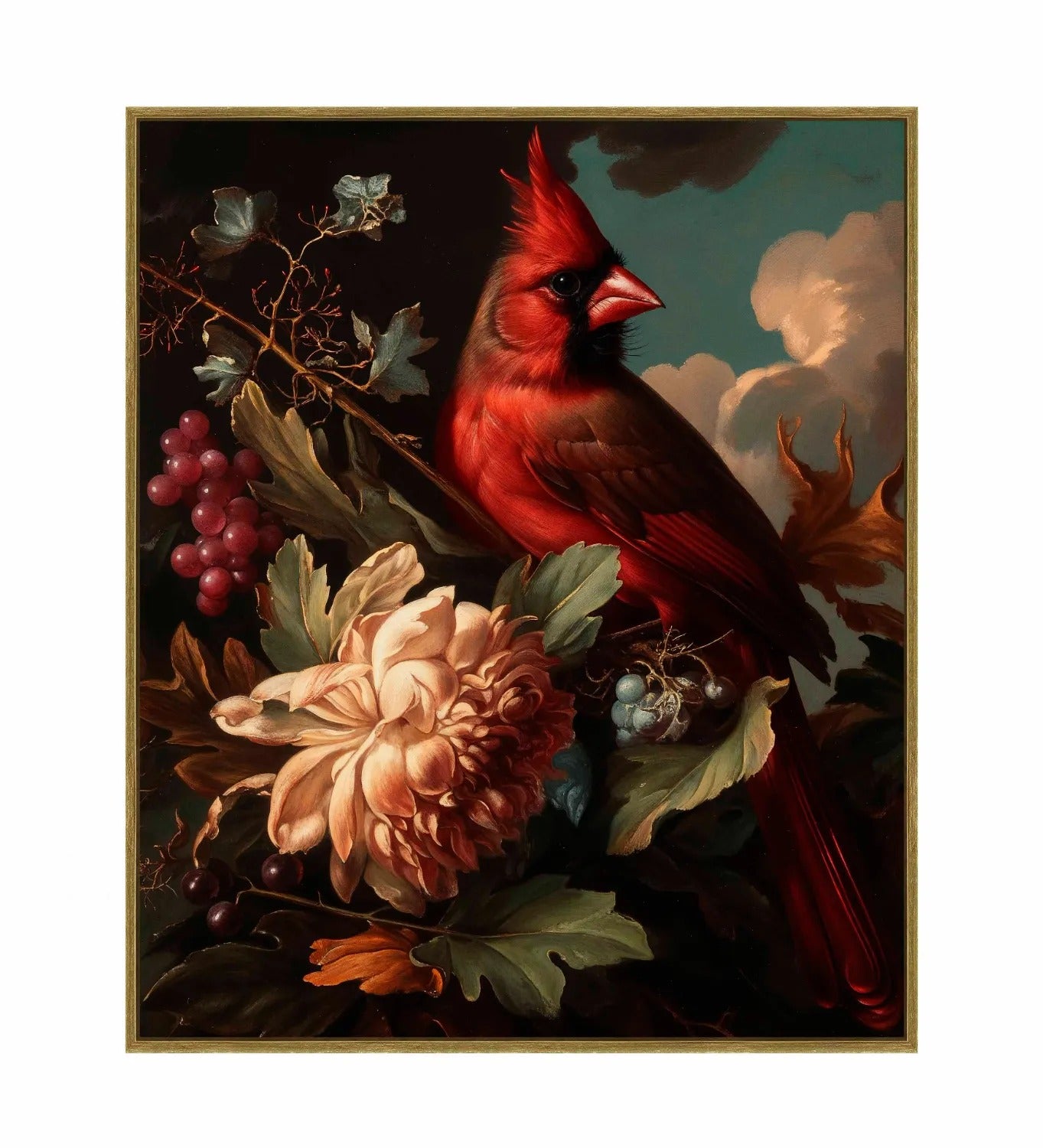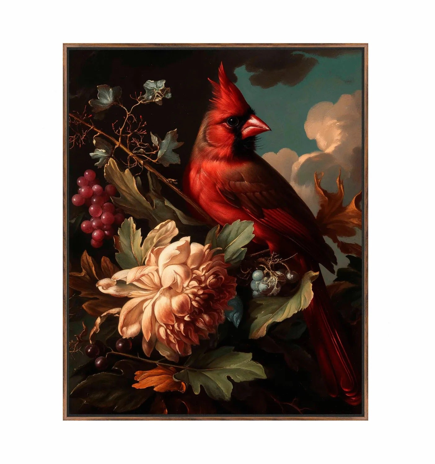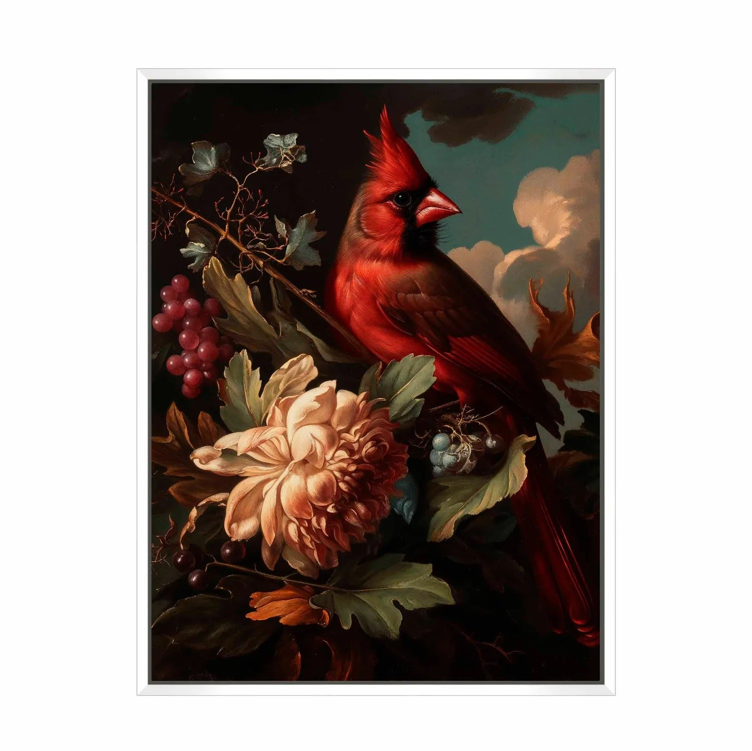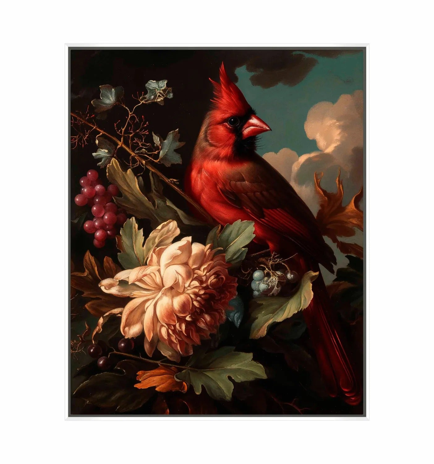 Crimson Majesty - Cardinal Amongst Blooms is an exquisite piece in the Dutch Floral Collection, masterfully blending the vibrant beauty of avian life with the delicate elegance of floral art. This painting showcases a magnificent Cardinal, perched regally amidst an array of lush foliage and blooming flowers. The Cardinal's striking red plumage contrasts beautifully with the rich greens and subtle hues of the surrounding flora, creating a captivating visual feast.