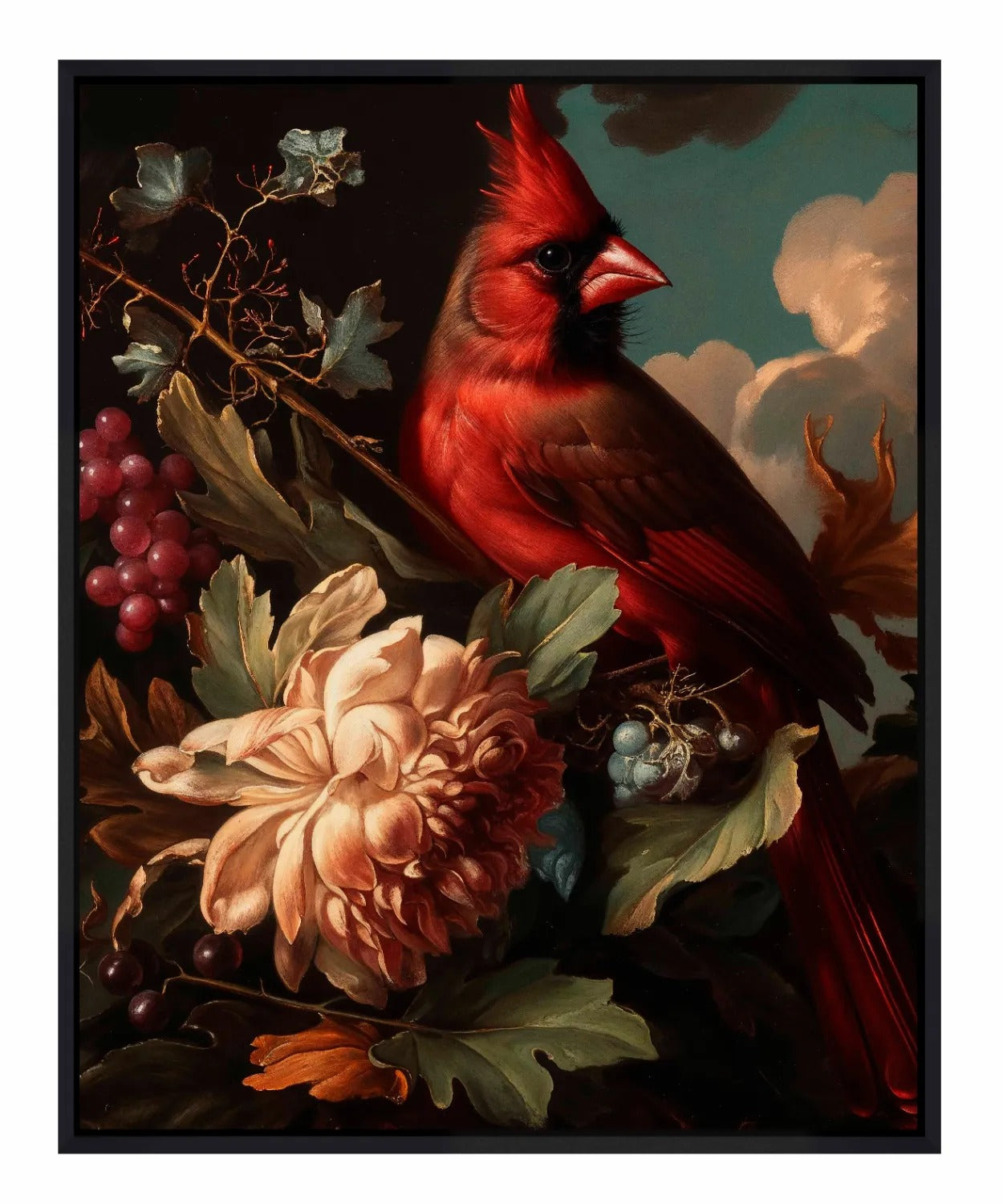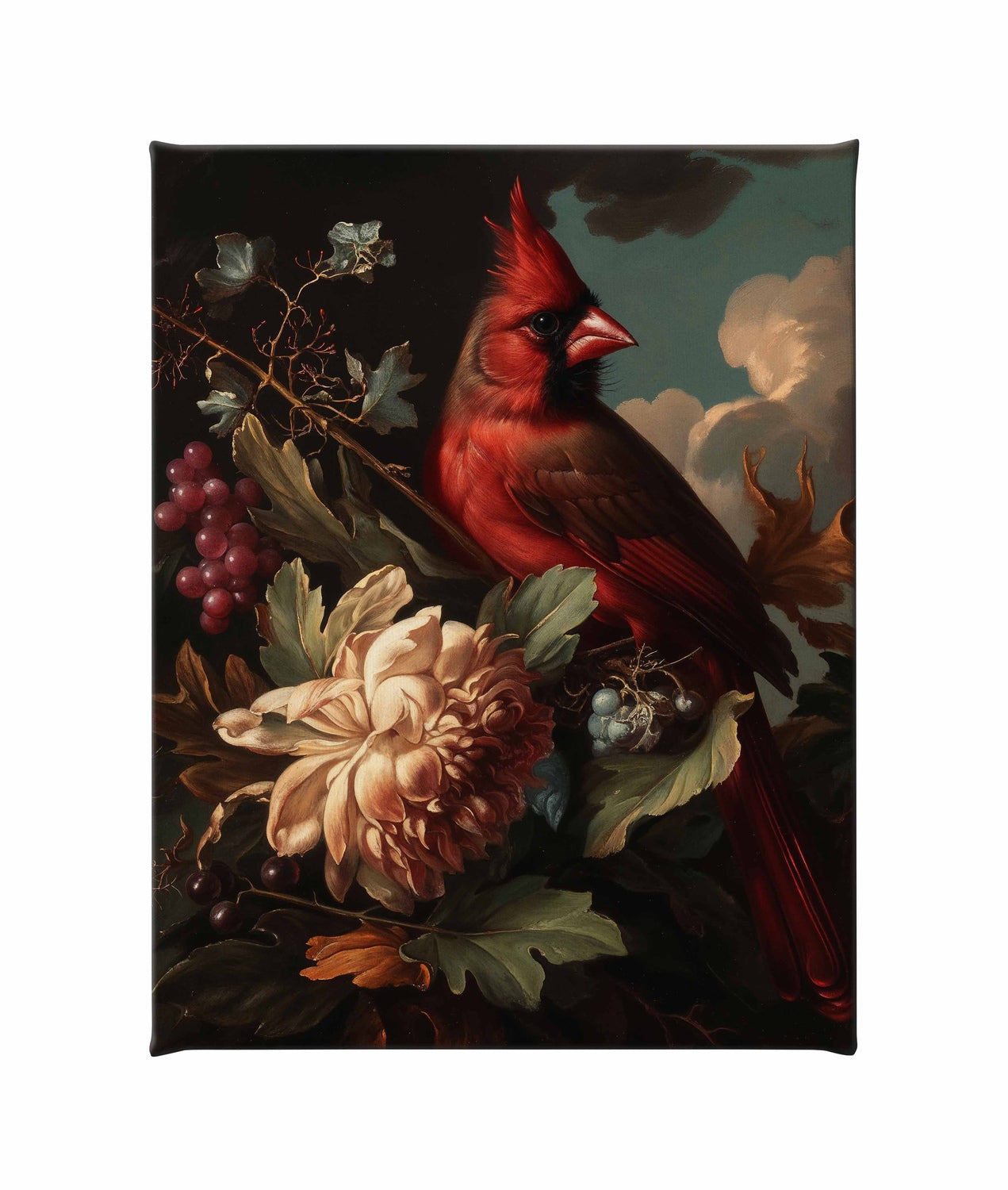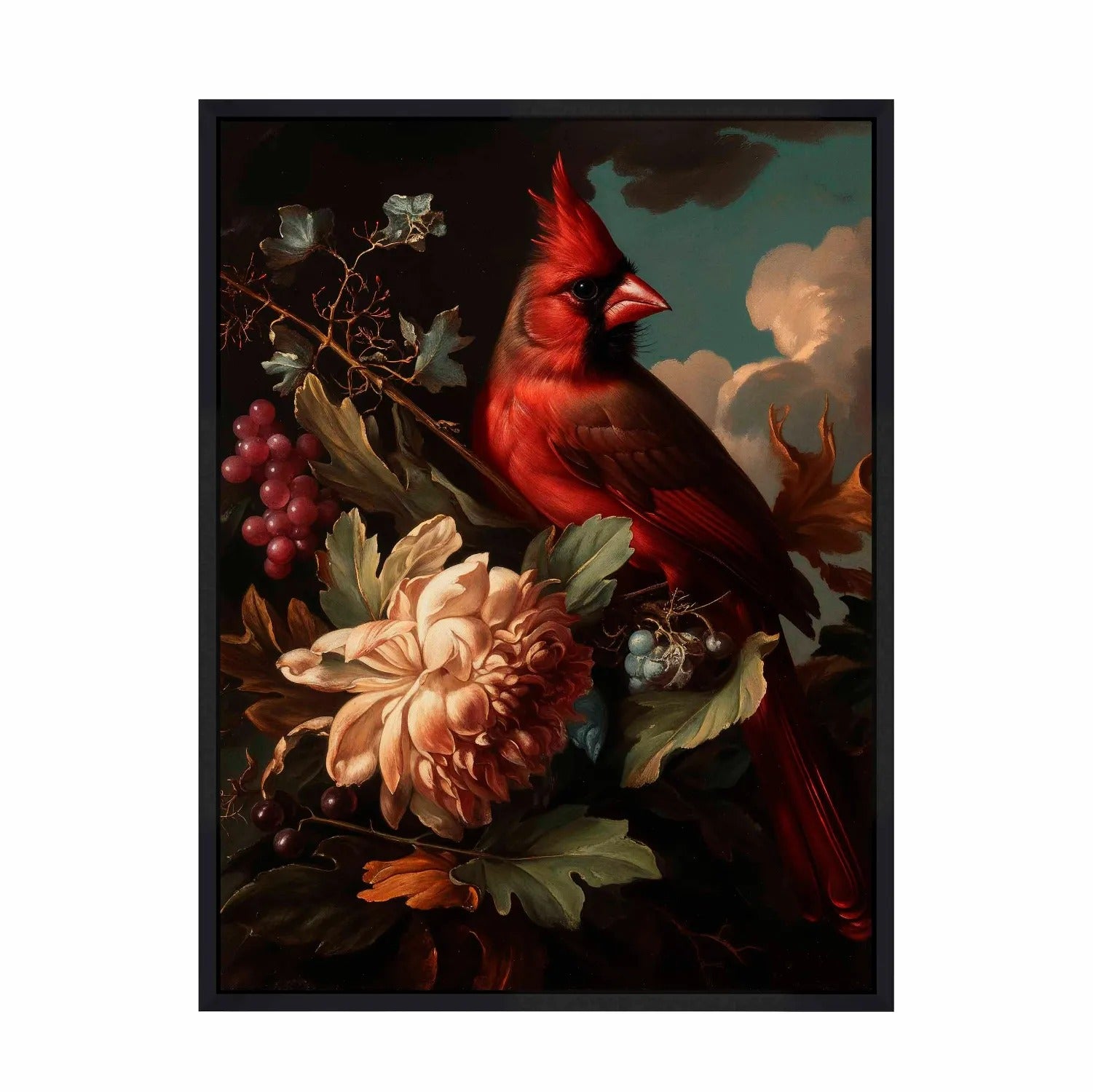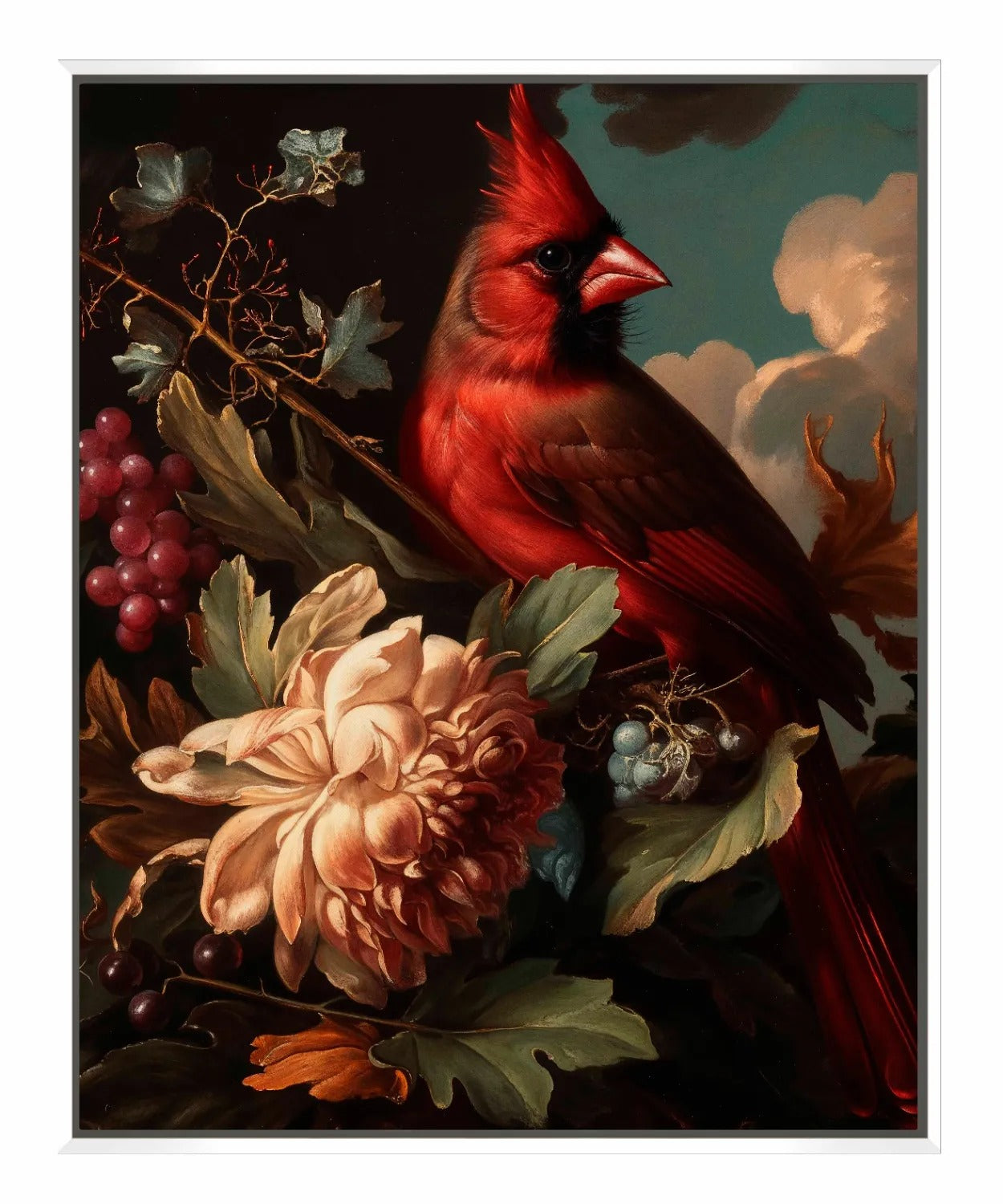 Crimson Majesty - Cardinal Amongst Blooms is an exquisite piece in the Dutch Floral Collection, masterfully blending the vibrant beauty of avian life with the delicate elegance of floral art. This painting showcases a magnificent Cardinal, perched regally amidst an array of lush foliage and blooming flowers. The Cardinal's striking red plumage contrasts beautifully with the rich greens and subtle hues of the surrounding flora, creating a captivating visual feast.