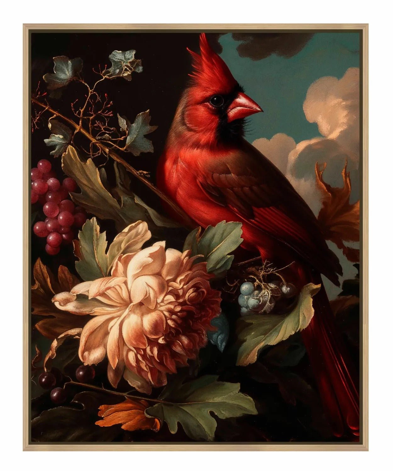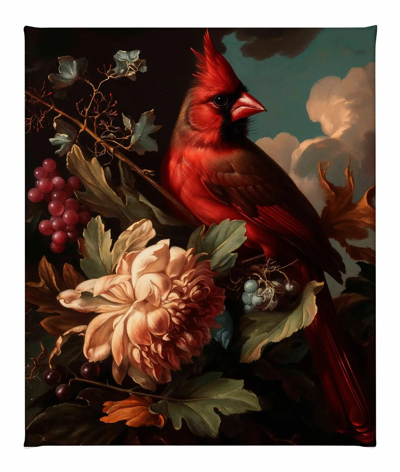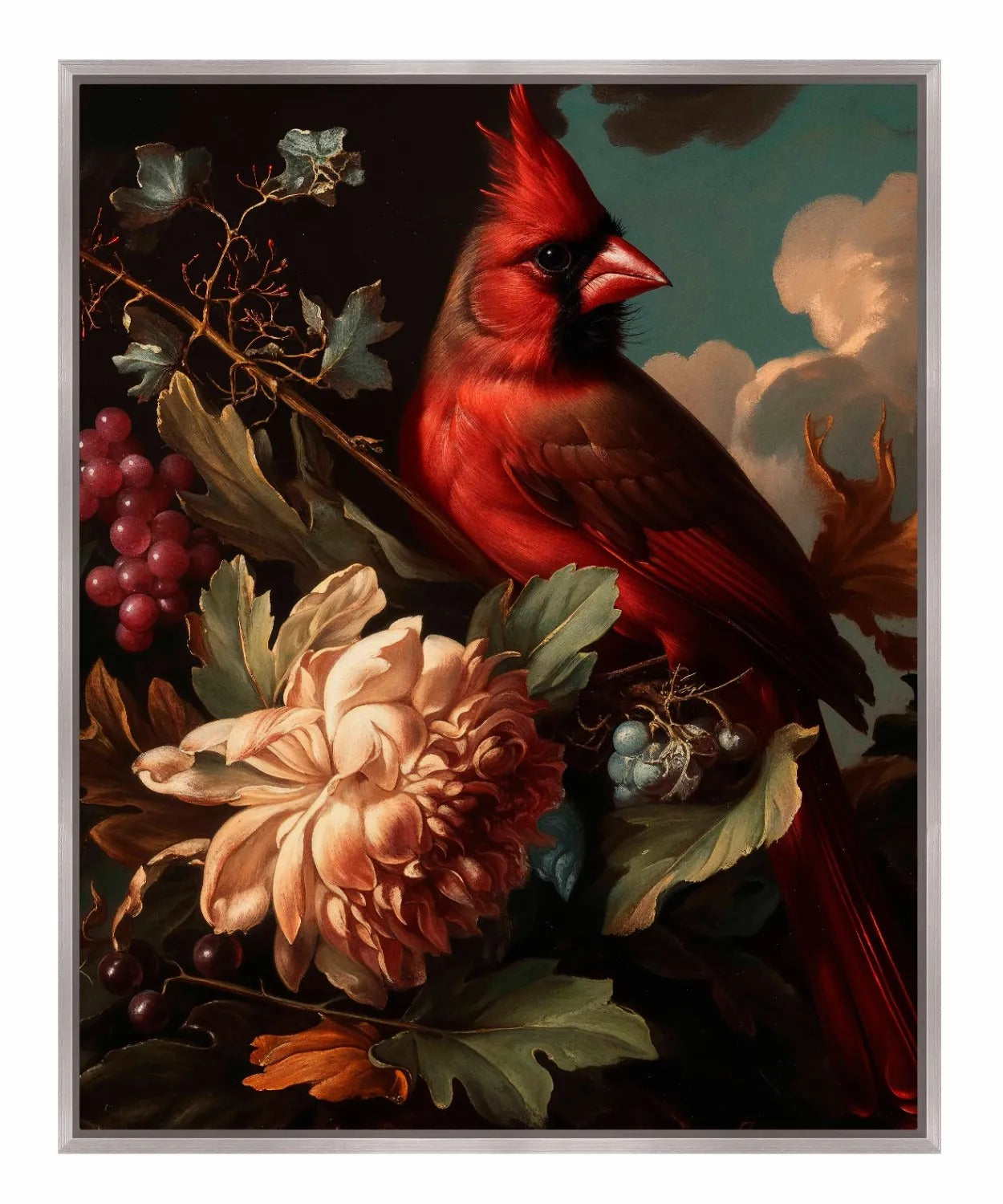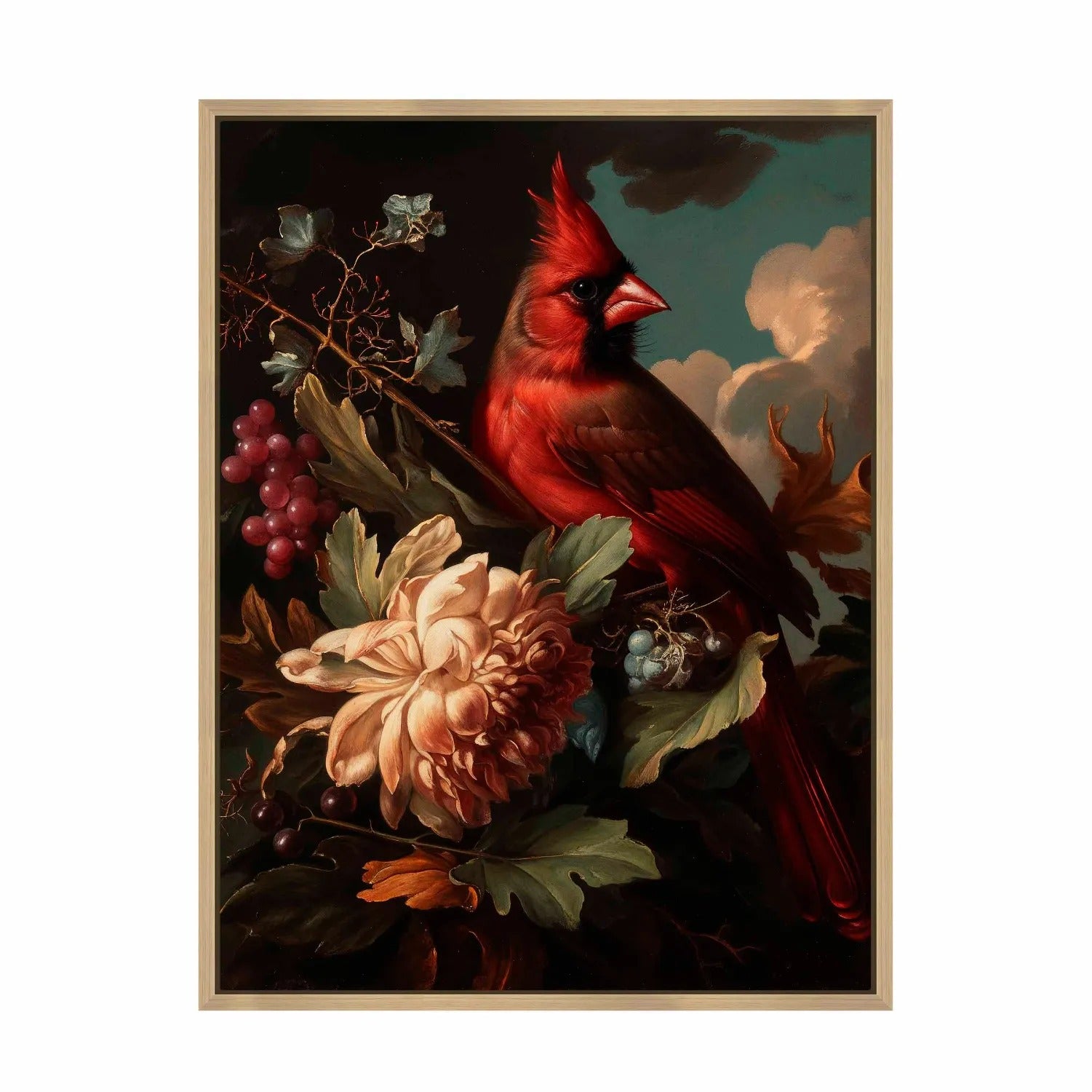 Crimson Majesty - Cardinal Amongst Blooms is an exquisite piece in the Dutch Floral Collection, masterfully blending the vibrant beauty of avian life with the delicate elegance of floral art. This painting showcases a magnificent Cardinal, perched regally amidst an array of lush foliage and blooming flowers. The Cardinal's striking red plumage contrasts beautifully with the rich greens and subtle hues of the surrounding flora, creating a captivating visual feast.