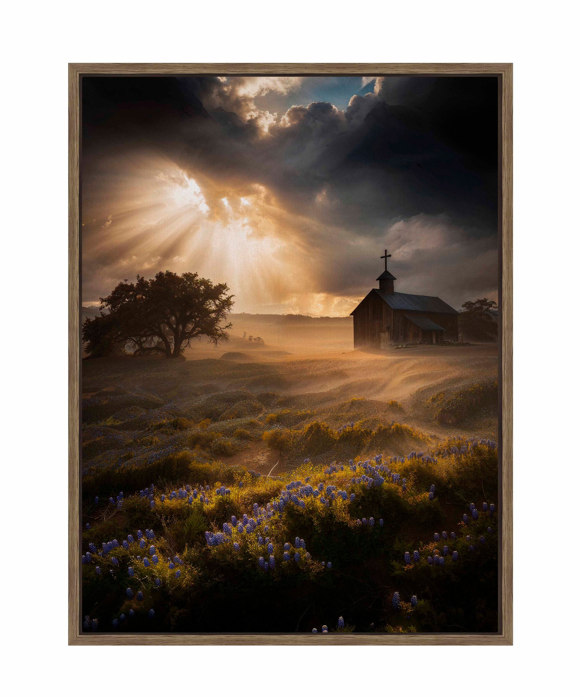 The composition is anchored by the dramatic sky, where the sun's rays burst through the clouds, casting a heavenly light across the rolling fields of bluebonnets. The play of light and shadow is masterfully rendered, with the sunlight illuminating the contours of the land and the chapel, creating a halo effect that enhances the sense of divine presence.