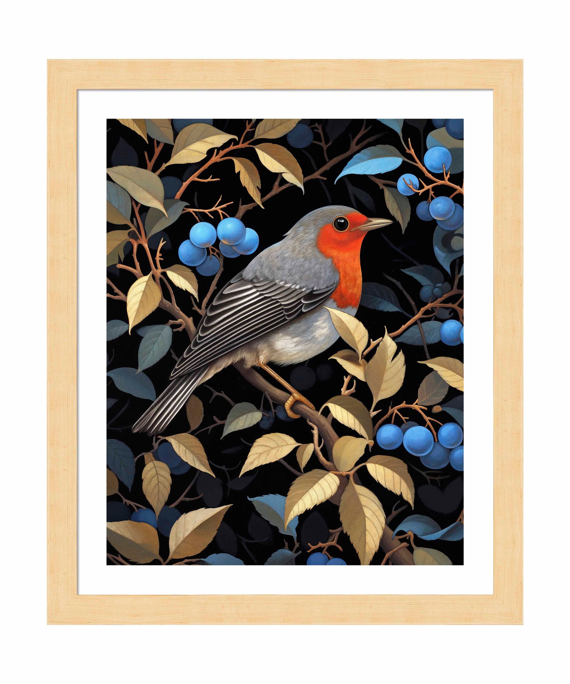 Crimson Song - Robin Among Blueberries is a captivating addition to the Backyard Sanctuary Collection, showcasing the vibrant beauty of a robin perched amidst a bounty of ripe blueberries. The robin's bright red breast and soft grey plumage stand out strikingly against the deep blue berries and the rich, dark background, creating a harmonious and visually appealing composition. The contrast between the warm tones of the bird and the cool hues of the berries and foliage adds depth and dimension to the scene, inviting viewers to appreciate the serene and colorful interplay of nature.