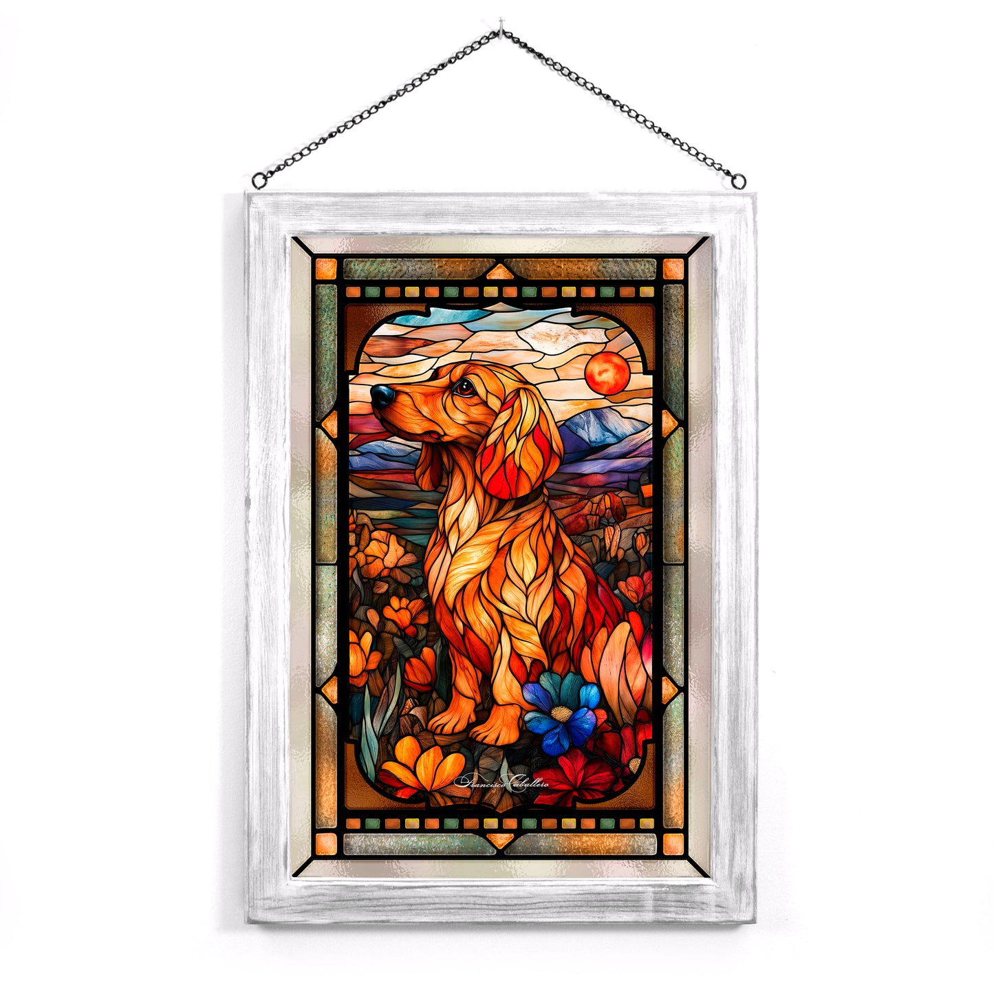 "Dachshund" beautifully showcases the charm and elegance of this beloved breed through the intricate and luminous style of stained glass. Set amidst a vibrant field of blooming flowers in fiery reds, oranges, and yellows, the dachshund gazes upward, exuding a sense of curiosity and serenity. The vivid composition is enriched by the warm glow of a setting sun and a tranquil mountain backdrop, blending earthy and celestial elements. The dog's elongated form and soulful eyes are highlighted by intricate patterns and radiant colors, celebrating the dachshund’s unique spirit and the beauty of nature in harmonious unity.