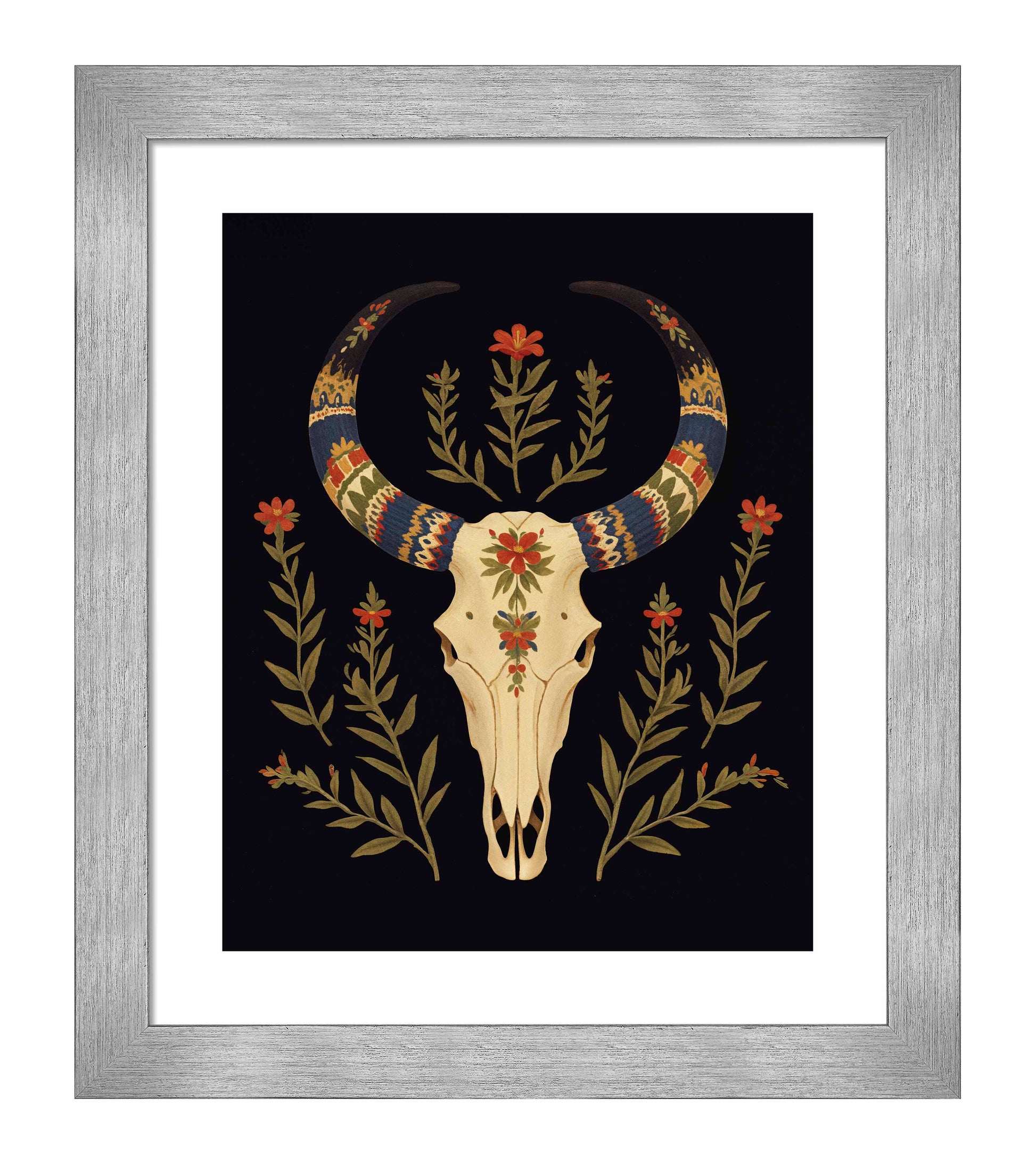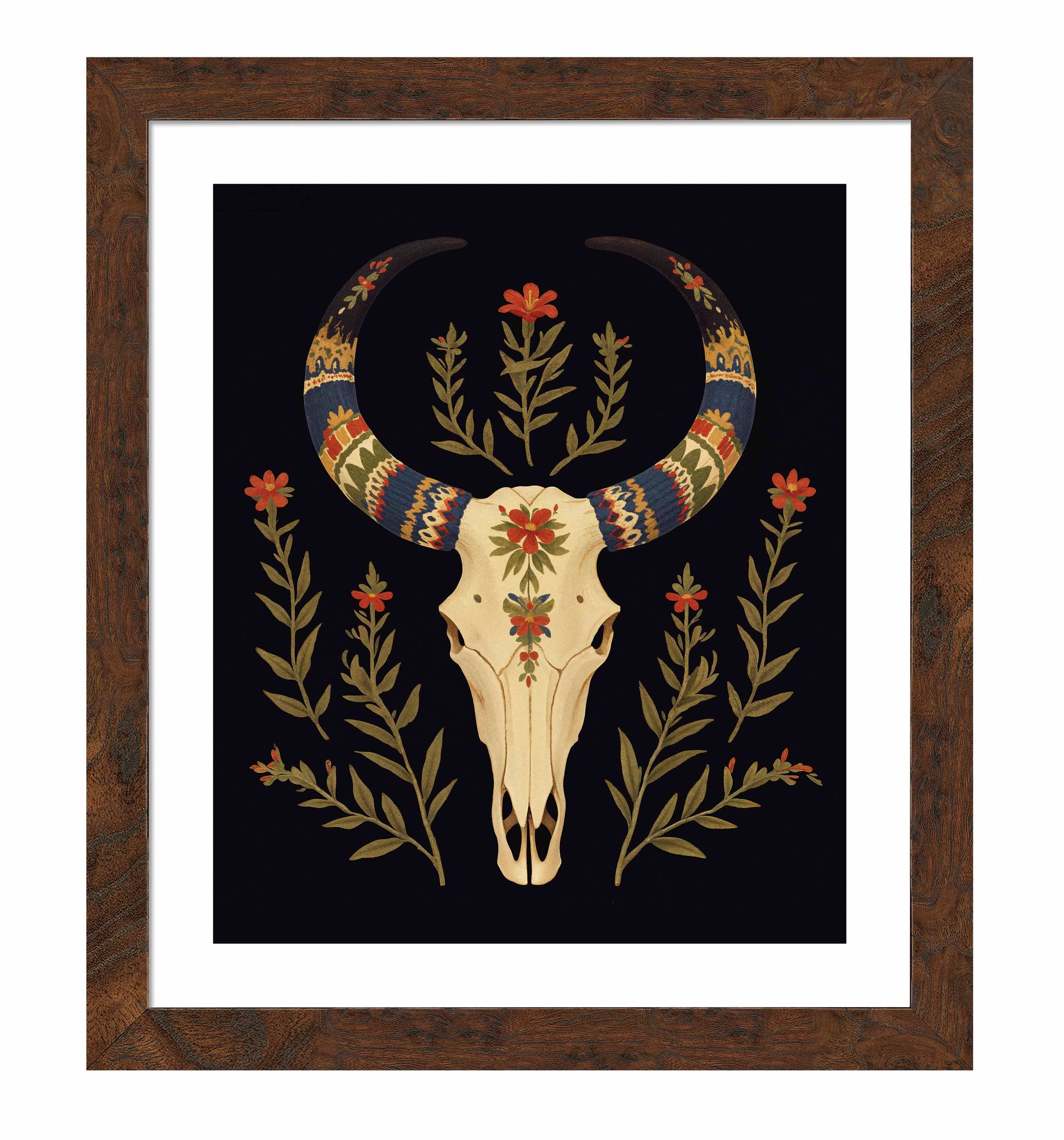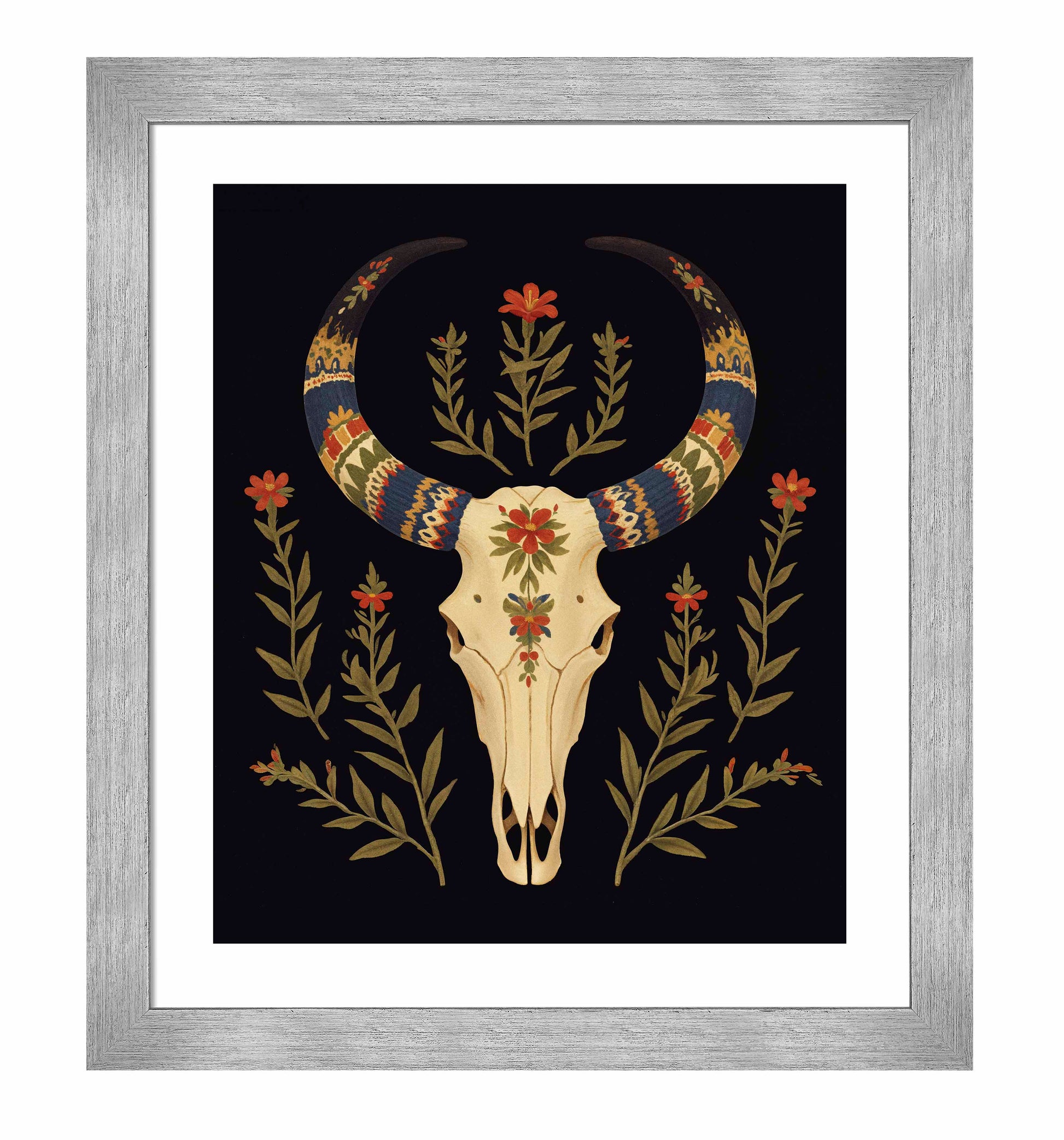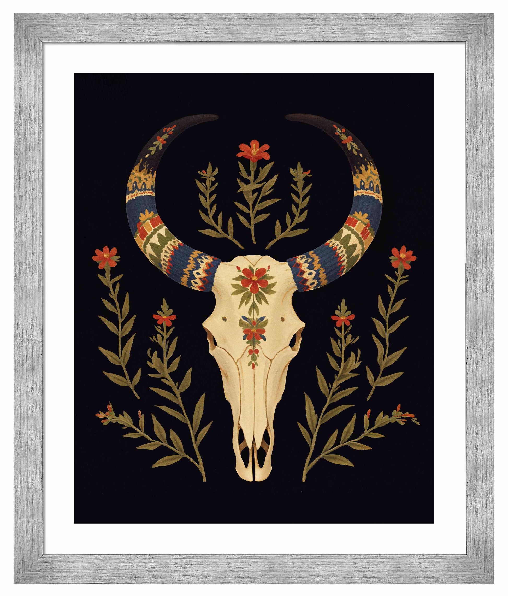 "Desert Sentinel" is a powerful depiction of Western resilience, blending the strength of nature with the spirit of the American Southwest. The centerpiece of this artwork is a beautifully detailed cow skull, its smooth cream tones standing in stark contrast to the deep black background. The skull is intricately adorned with vibrant patterns along its horns, which are painted in bold shades of blue, red, gold, and cream, evoking traditional Southwestern textile designs. These vivid patterns give the horns a regal and protective quality, transforming the skull into a guardian-like figure watching over the desert landscape.
