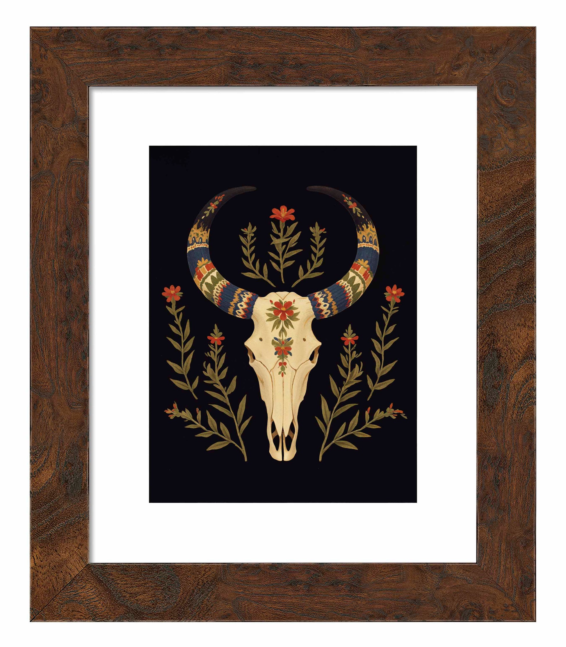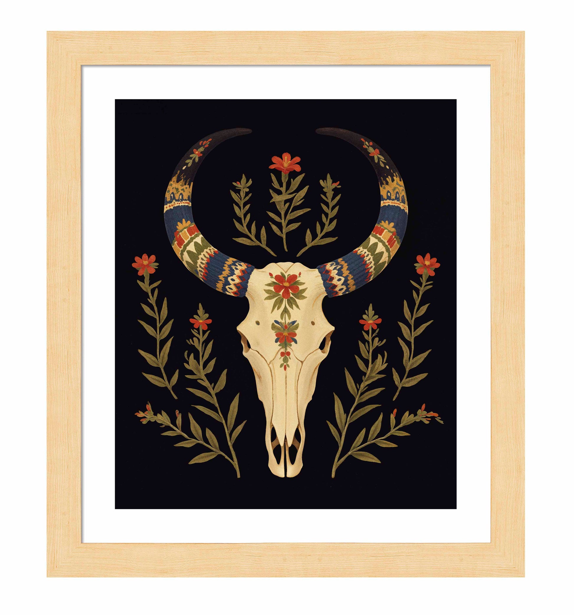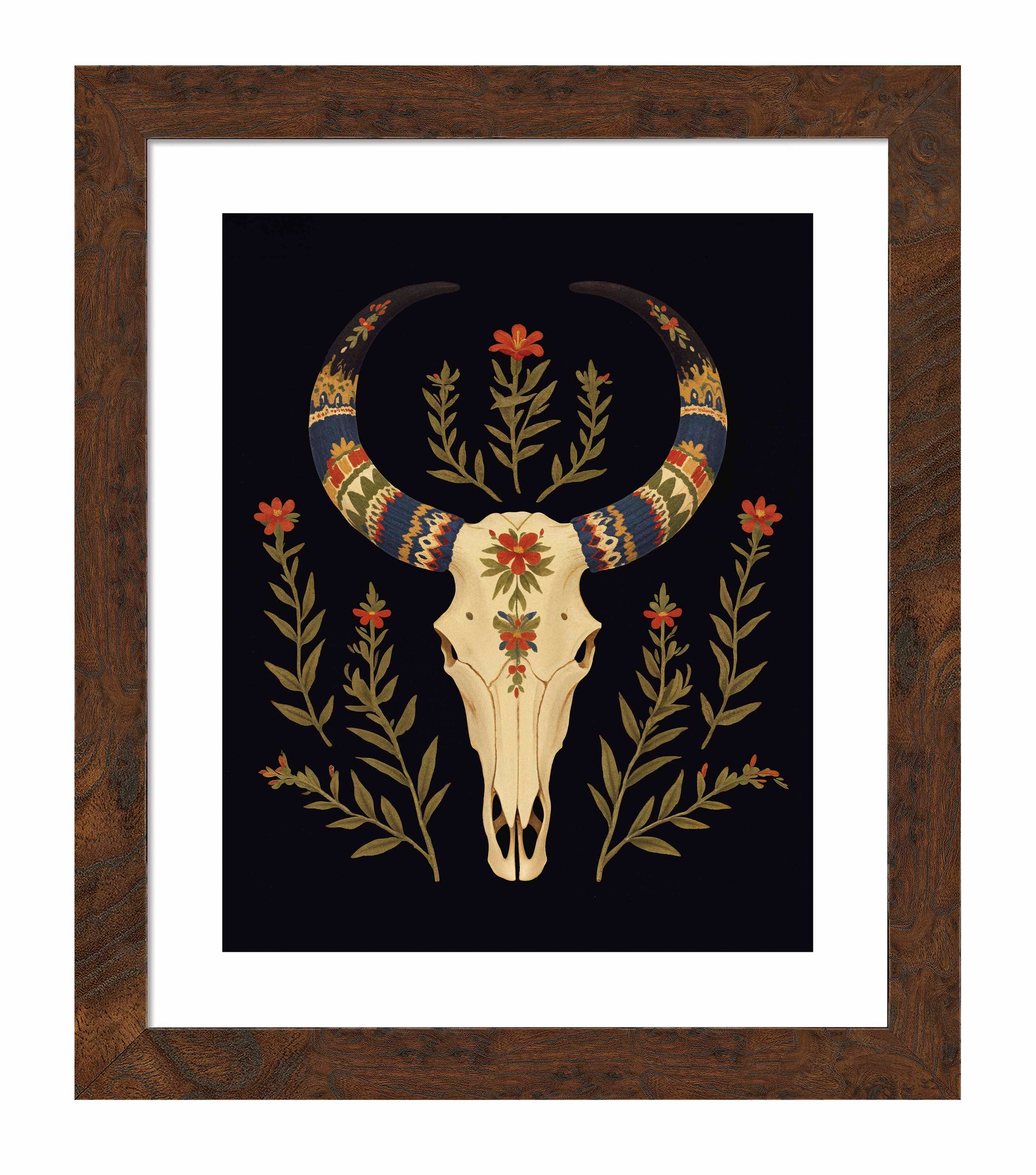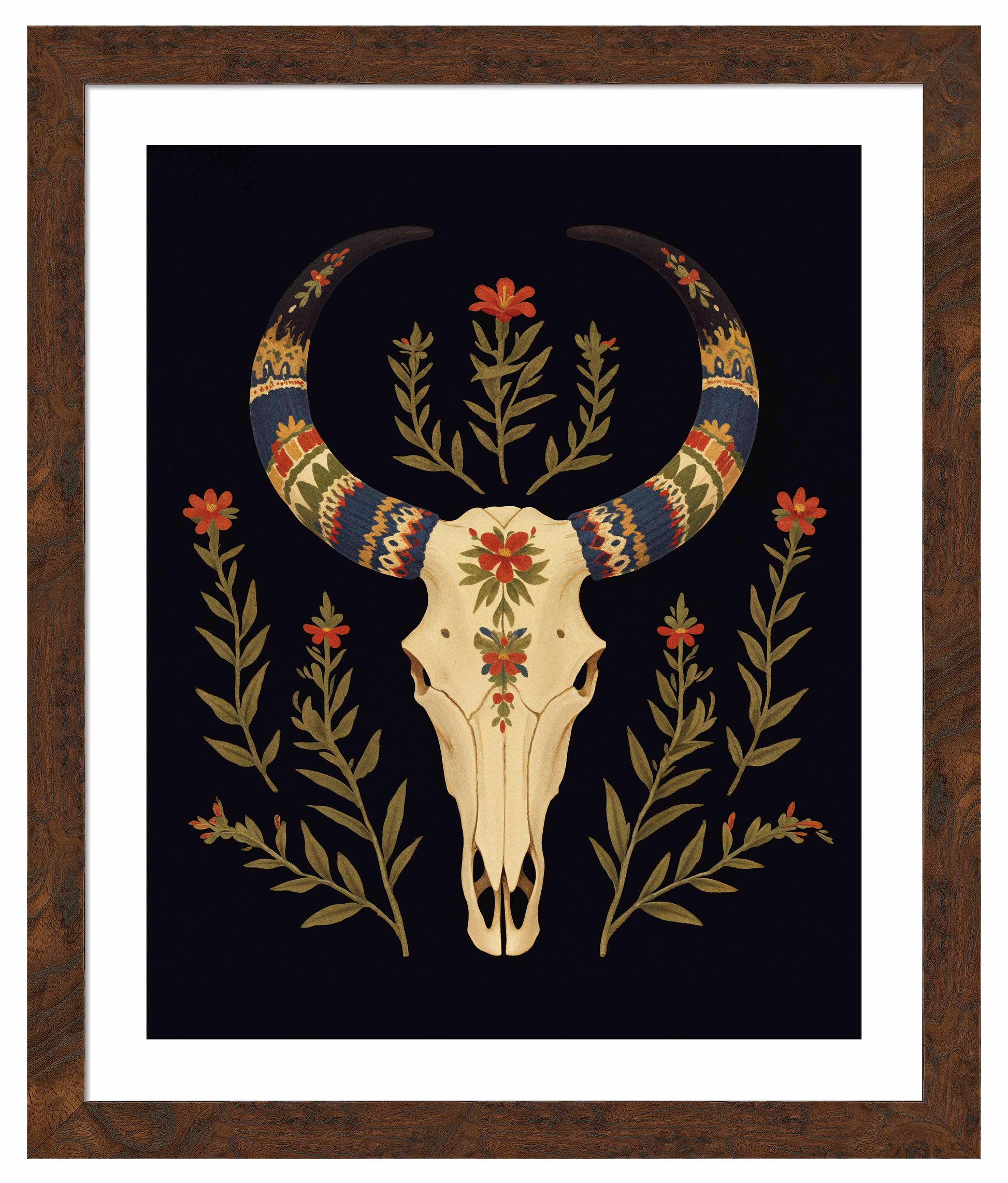 "Desert Sentinel" is a powerful depiction of Western resilience, blending the strength of nature with the spirit of the American Southwest. The centerpiece of this artwork is a beautifully detailed cow skull, its smooth cream tones standing in stark contrast to the deep black background. The skull is intricately adorned with vibrant patterns along its horns, which are painted in bold shades of blue, red, gold, and cream, evoking traditional Southwestern textile designs. These vivid patterns give the horns a regal and protective quality, transforming the skull into a guardian-like figure watching over the desert landscape.