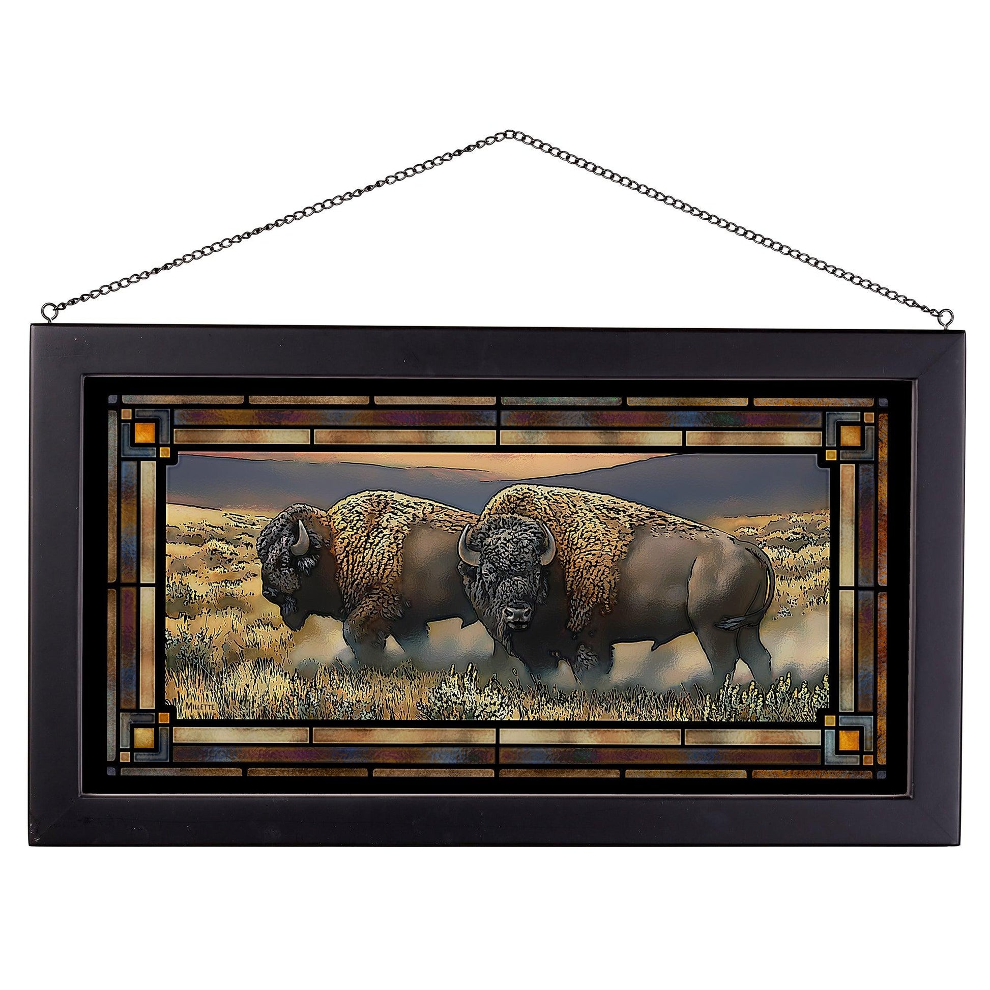 Let the light shine! Stained glass art hangings show their true colors when back-lit with natural sunlight. Popular designs are printed with fade resistant inks on 11" x 21" glass, framed with 1" black-finished moulding. Framed size 13" x 23". Ready to hang with provided chain. Designed, printed, and assembled in North America.