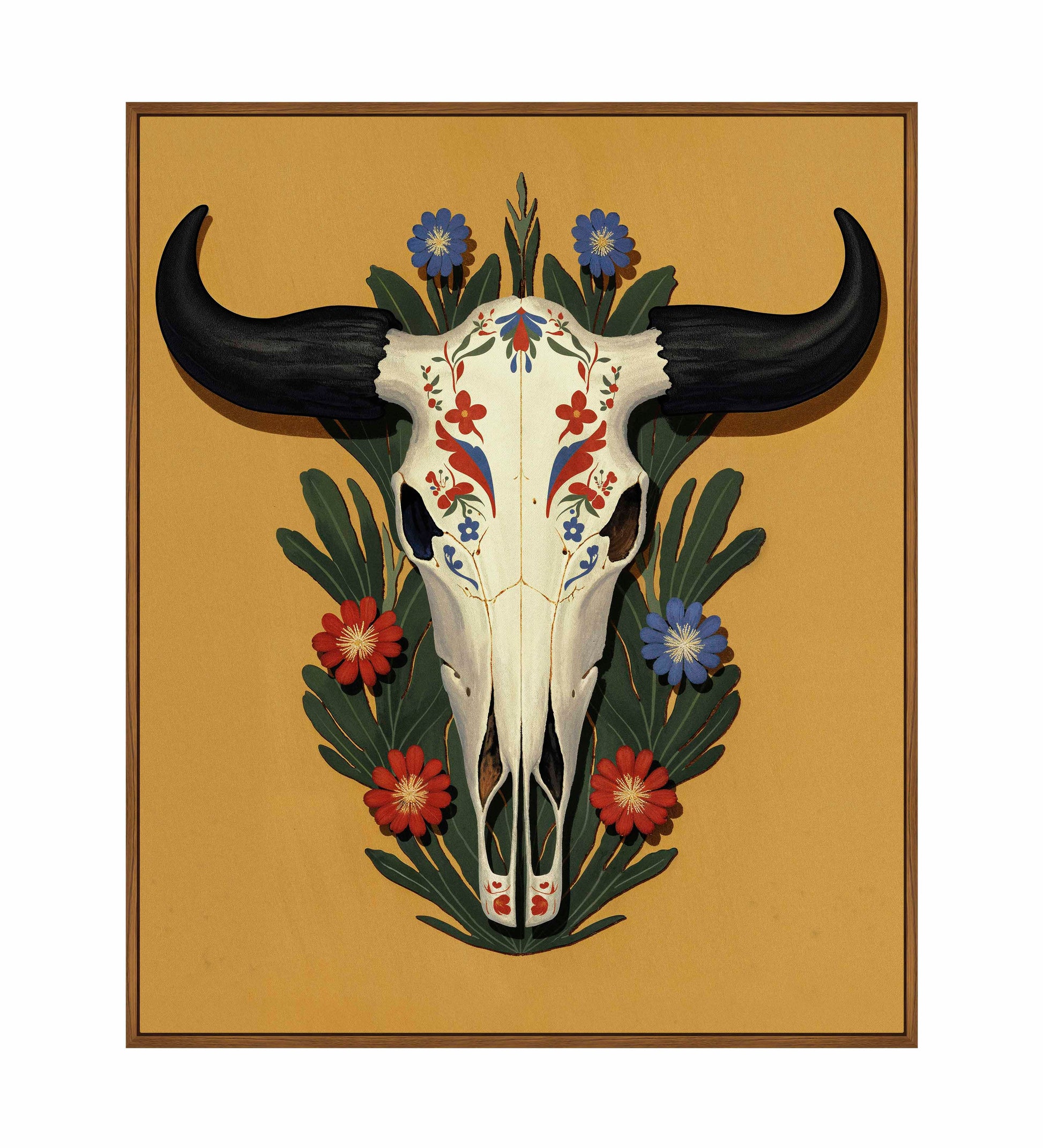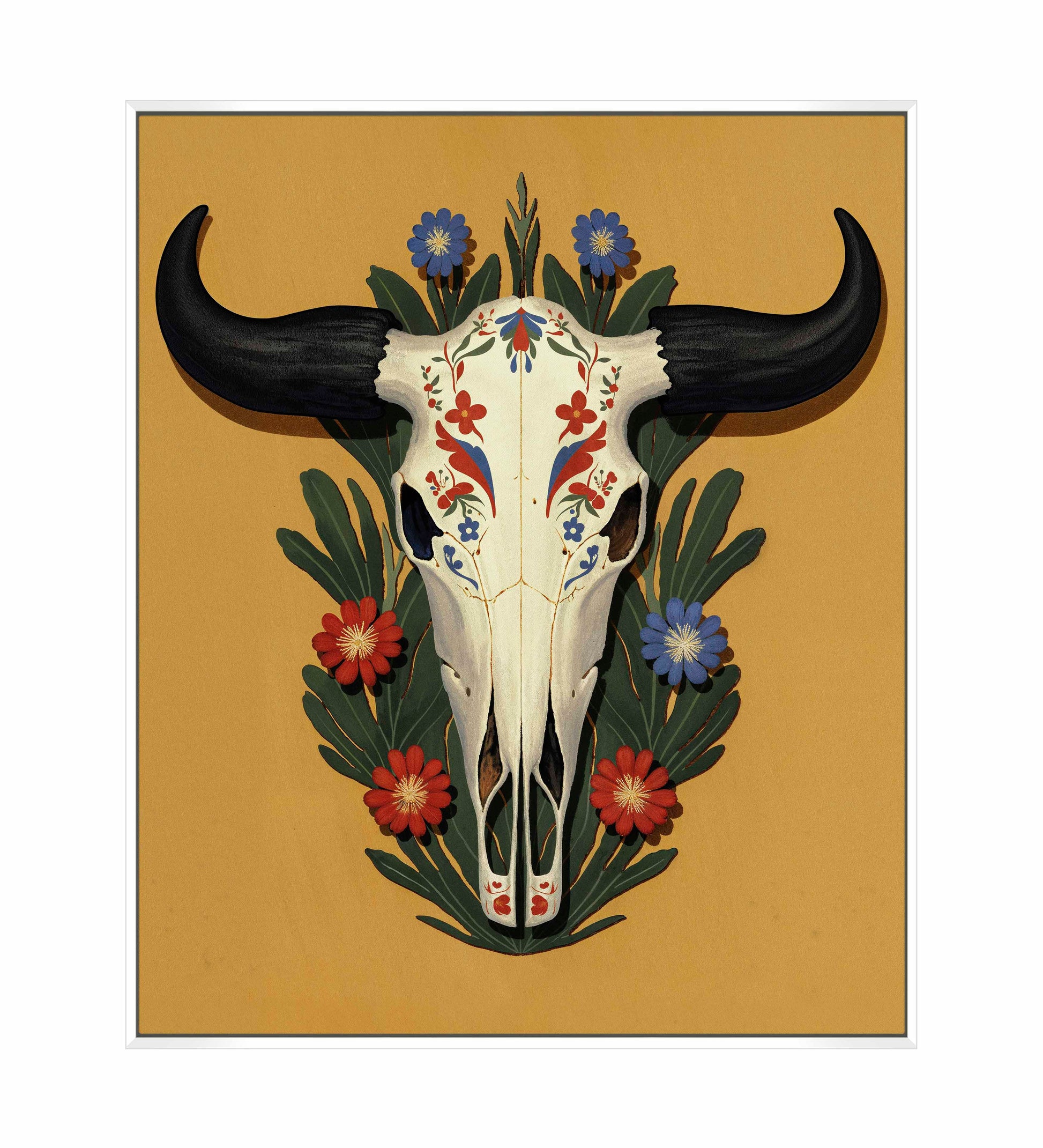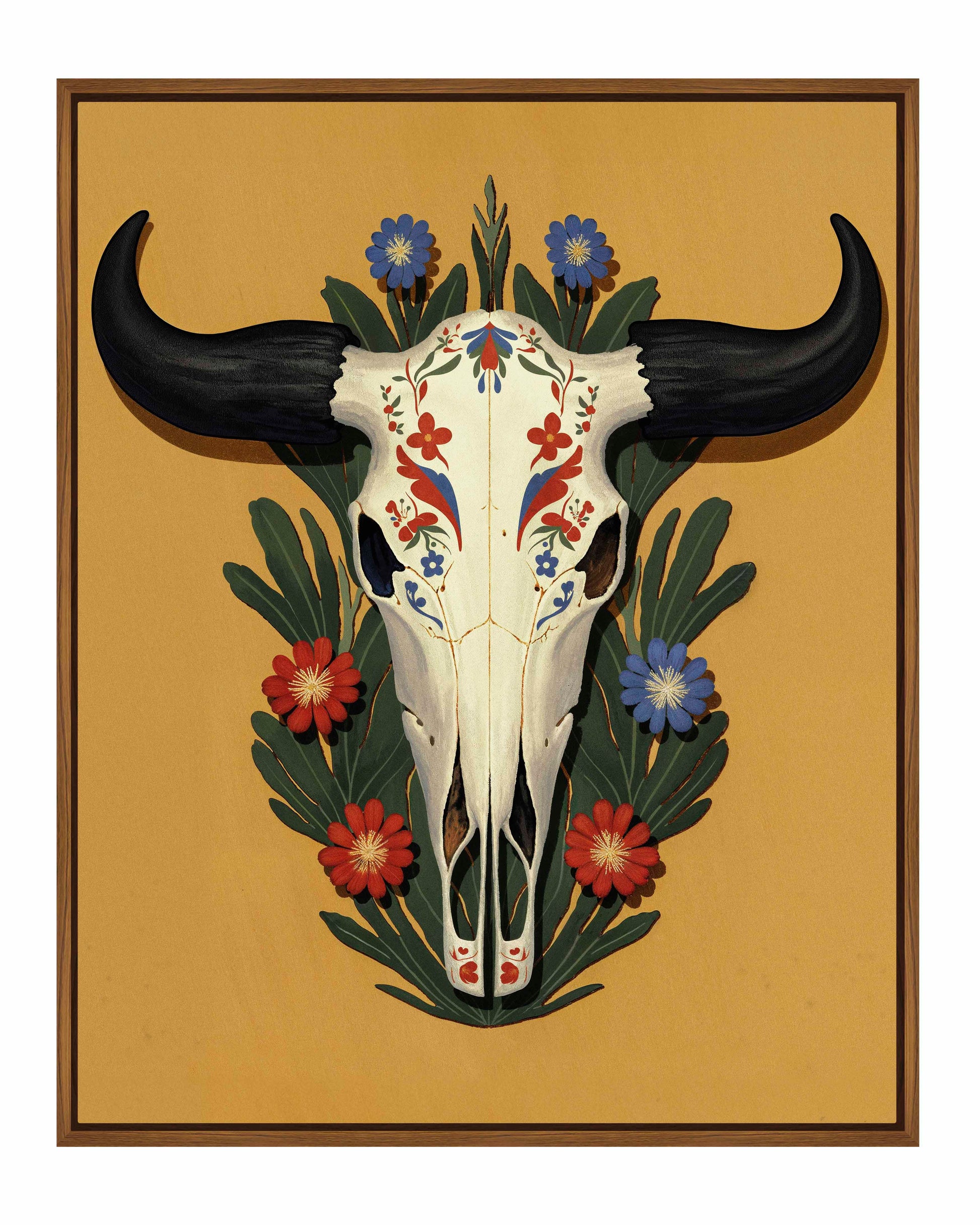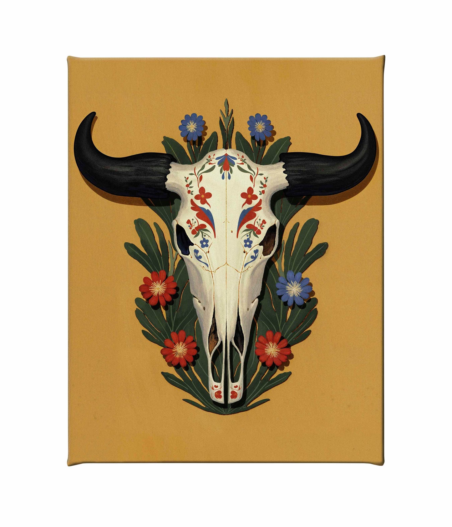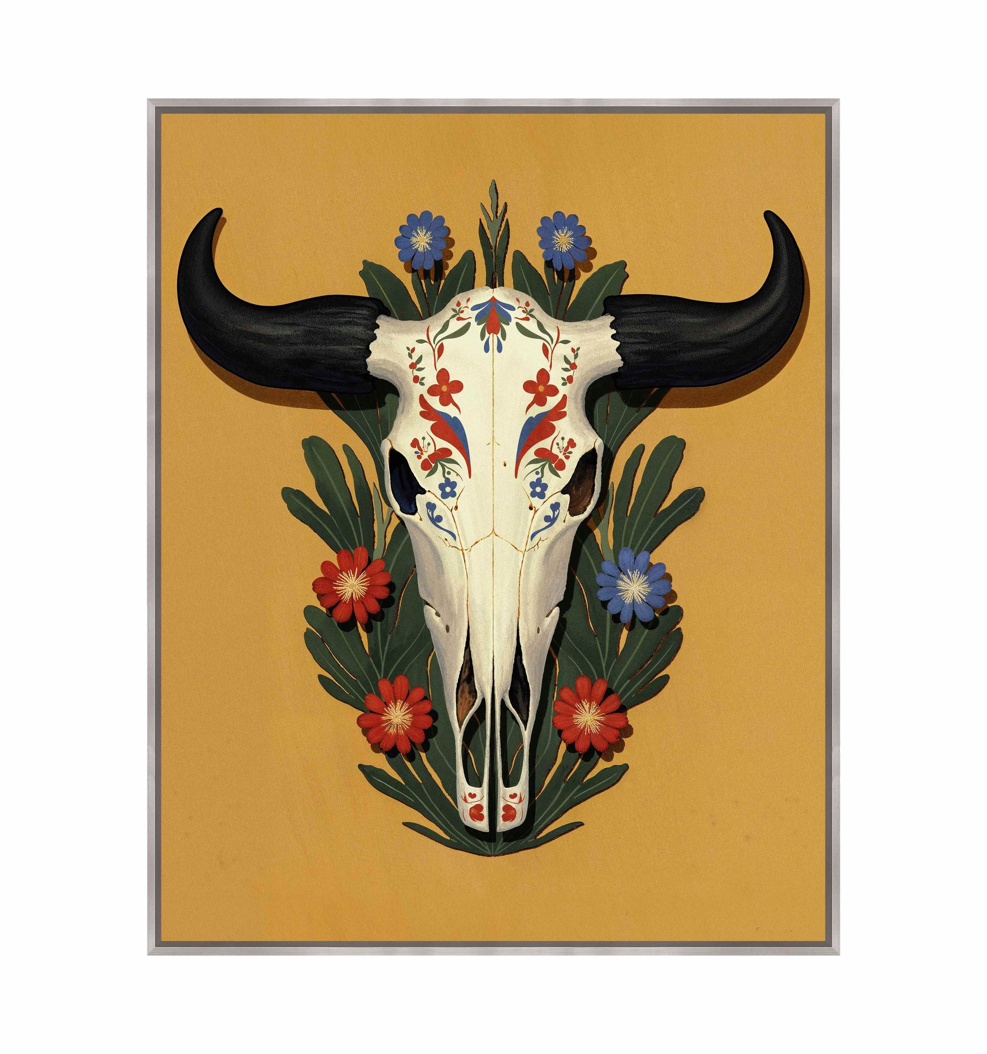 "Dust Bowl Relic" is a striking visual narrative that combines the ruggedness of the Old West with the delicate beauty of nature. At the heart of the composition is a meticulously rendered bull skull, painted in a soft white hue and adorned with intricate floral patterns. Vibrant red, blue, and green accents are delicately placed across the skull, forming symmetrical floral motifs that soften its stark appearance. These details provide a sense of rebirth and continuity in the face of the harsh realities of the Western landscape.