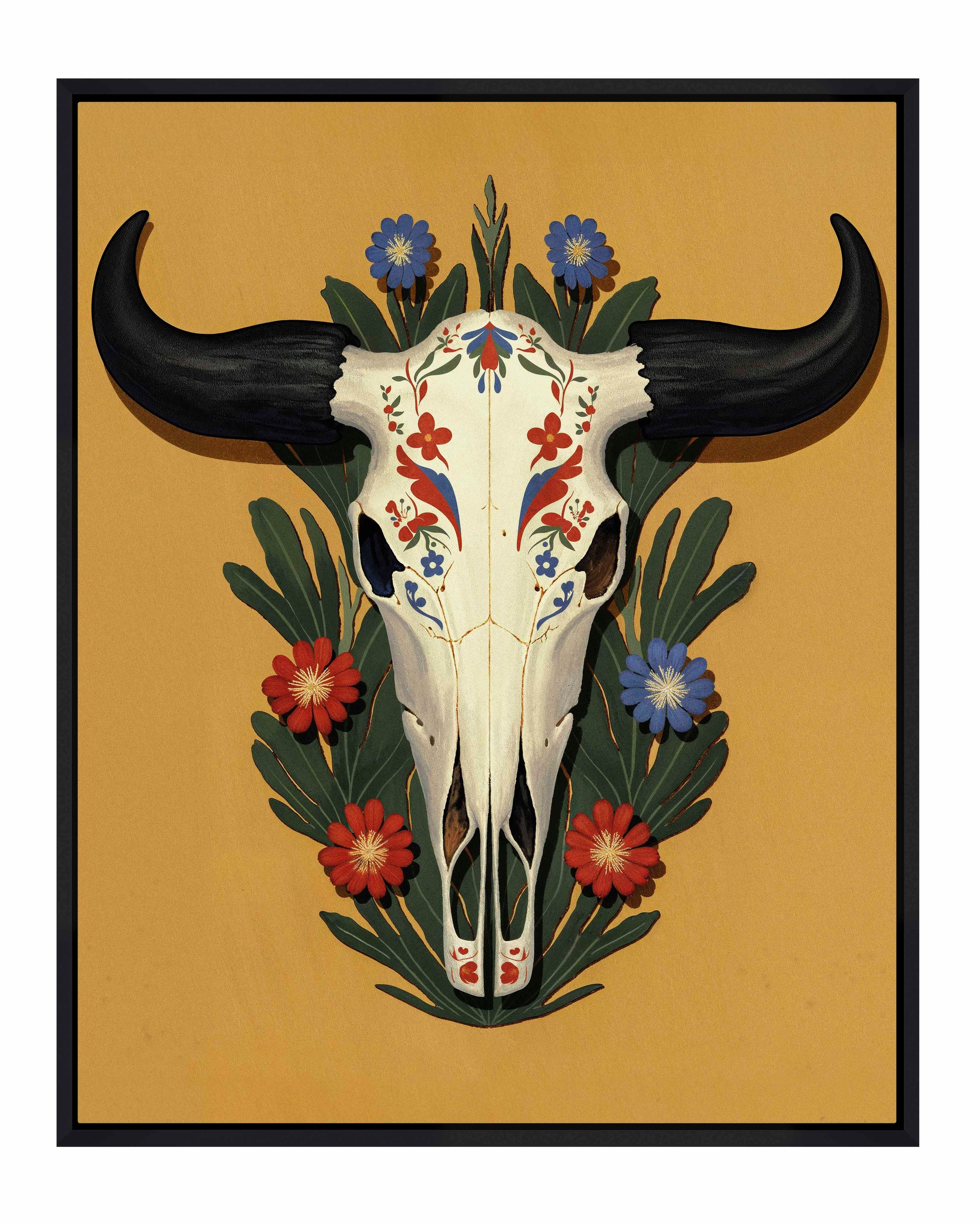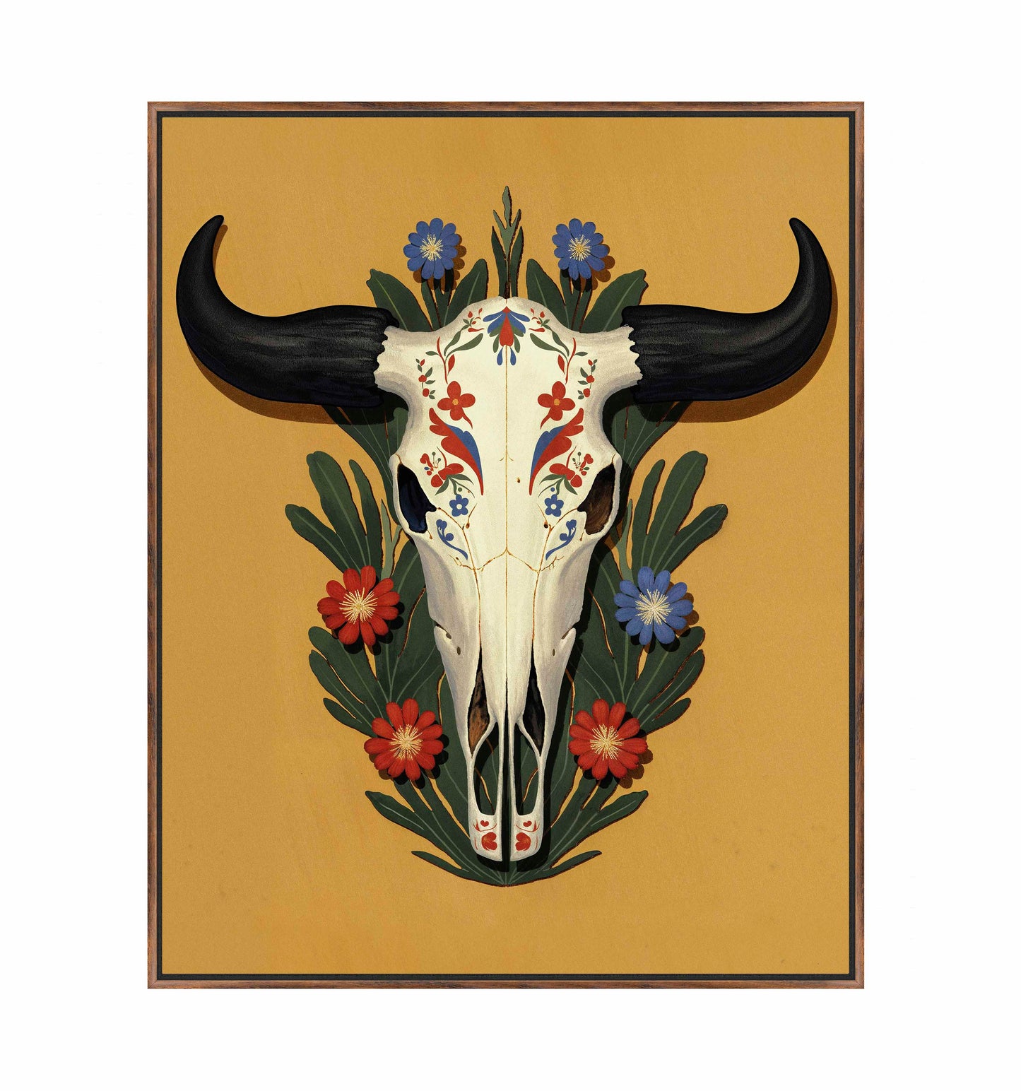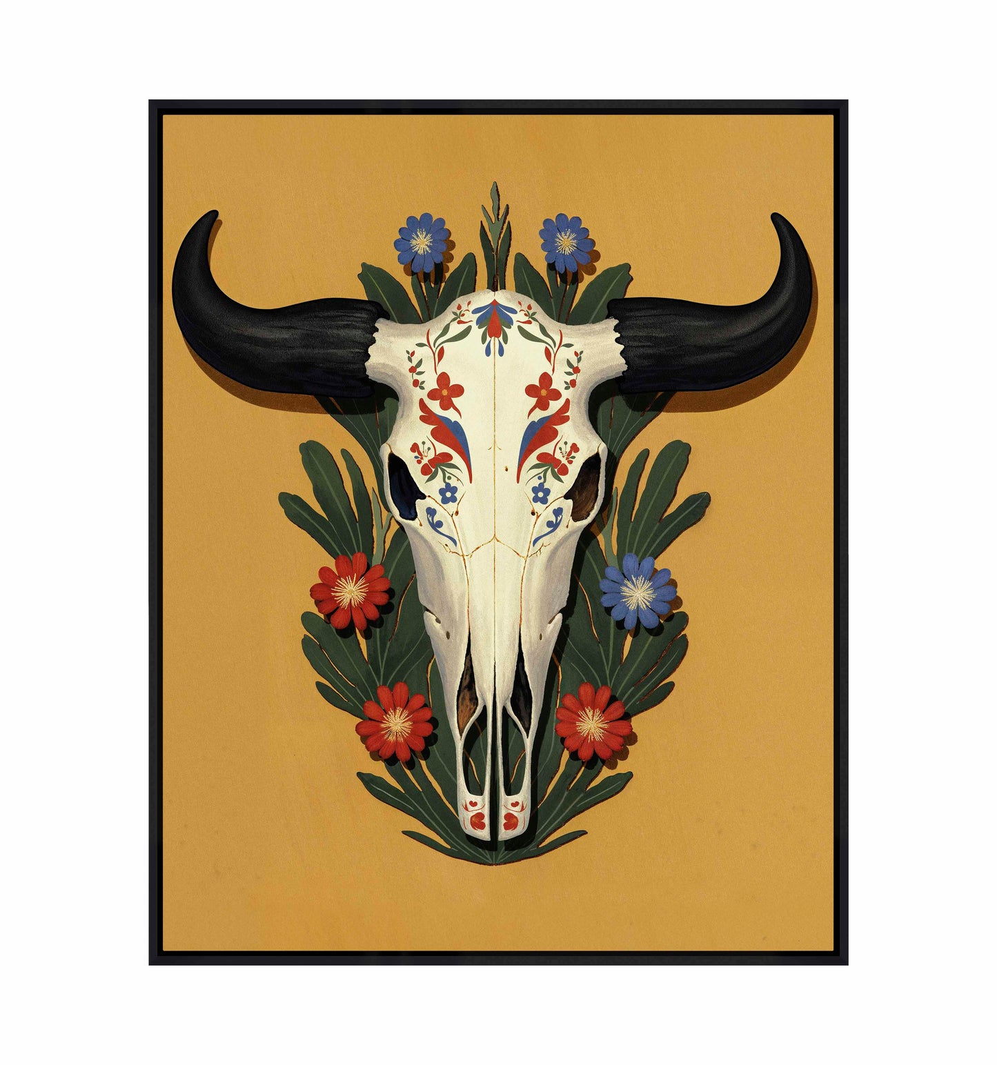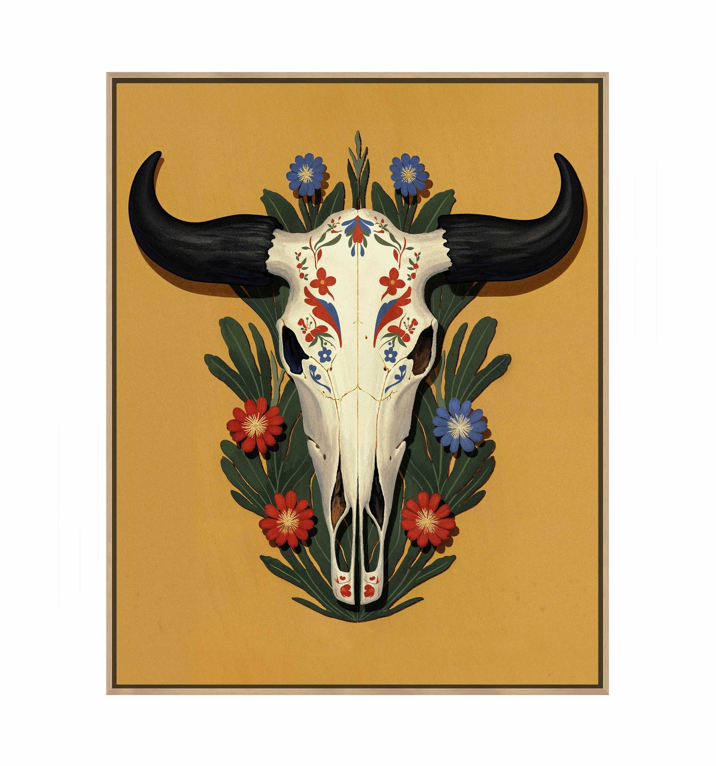 "Dust Bowl Relic" is a striking visual narrative that combines the ruggedness of the Old West with the delicate beauty of nature. At the heart of the composition is a meticulously rendered bull skull, painted in a soft white hue and adorned with intricate floral patterns. Vibrant red, blue, and green accents are delicately placed across the skull, forming symmetrical floral motifs that soften its stark appearance. These details provide a sense of rebirth and continuity in the face of the harsh realities of the Western landscape.