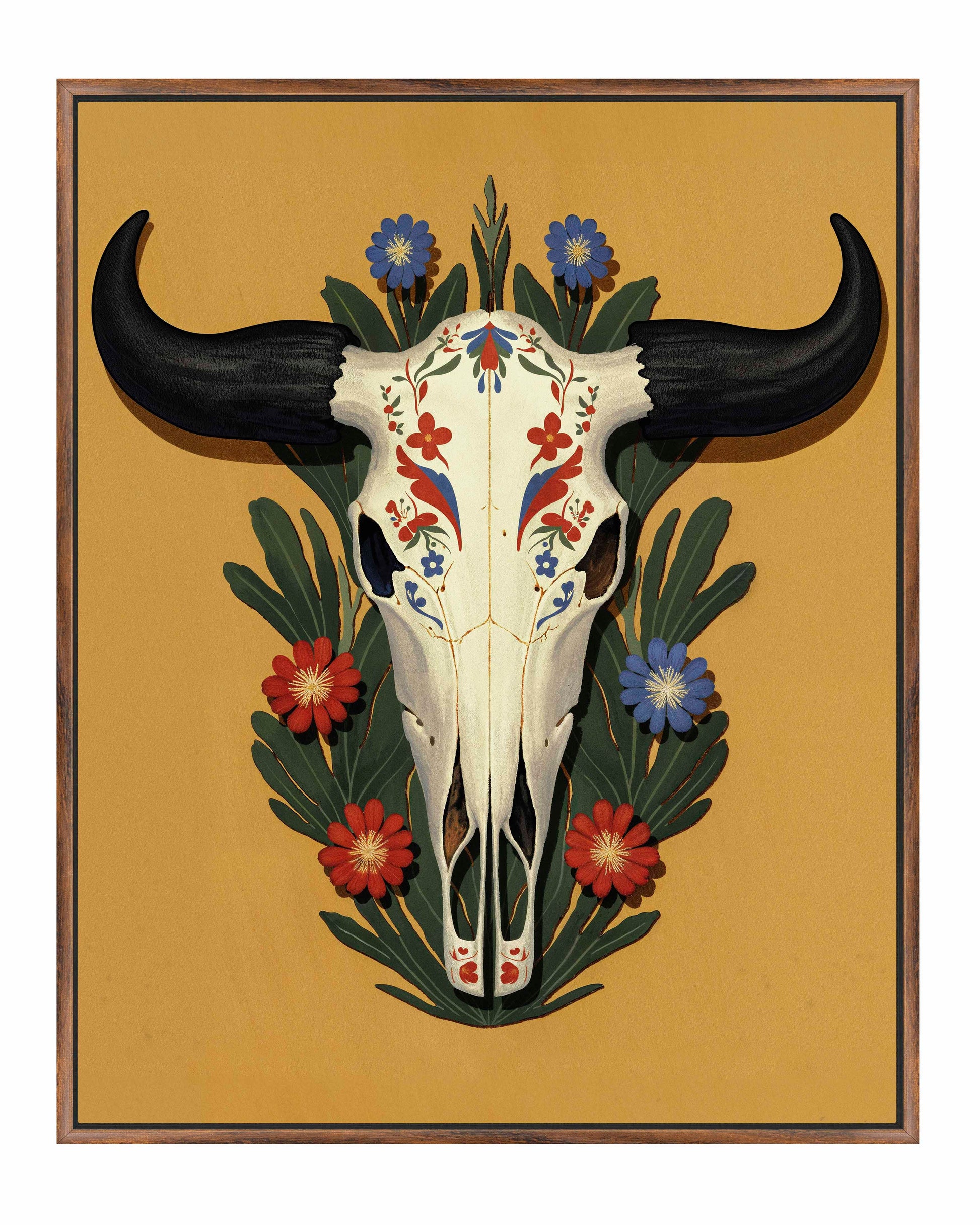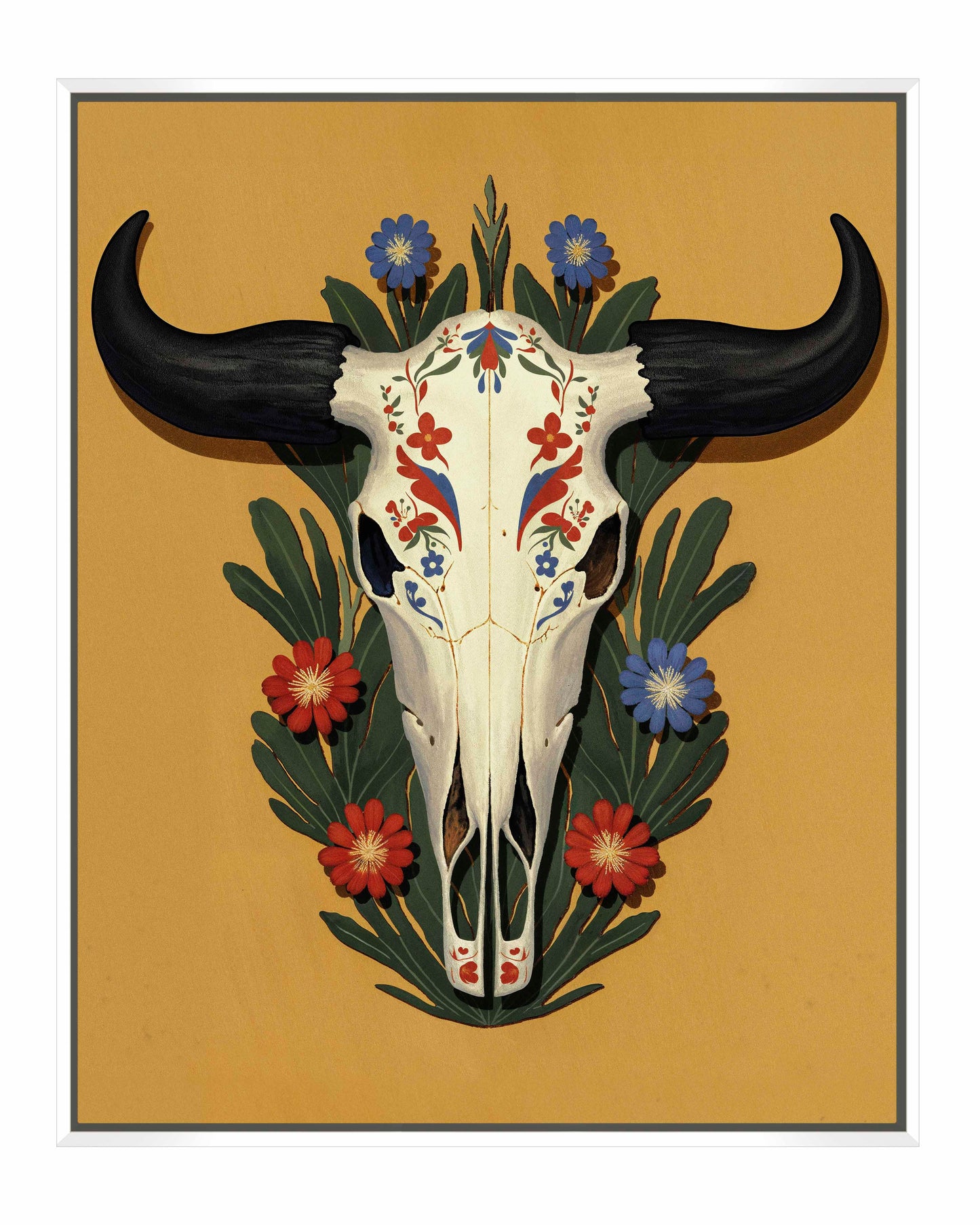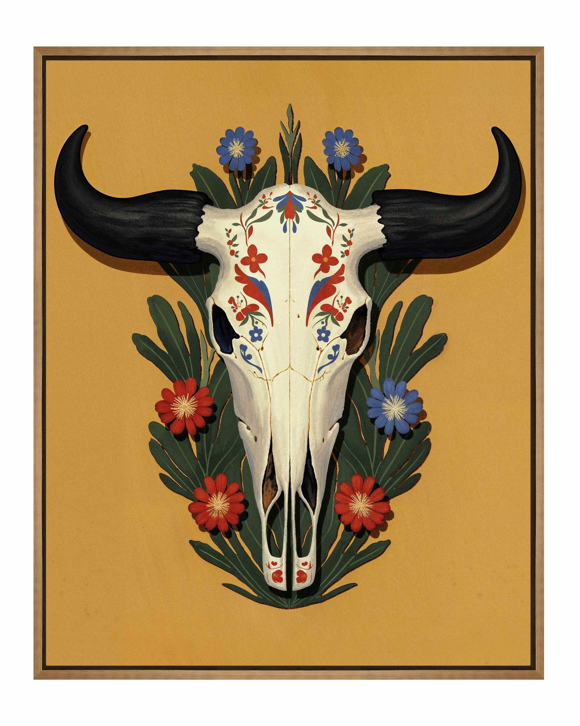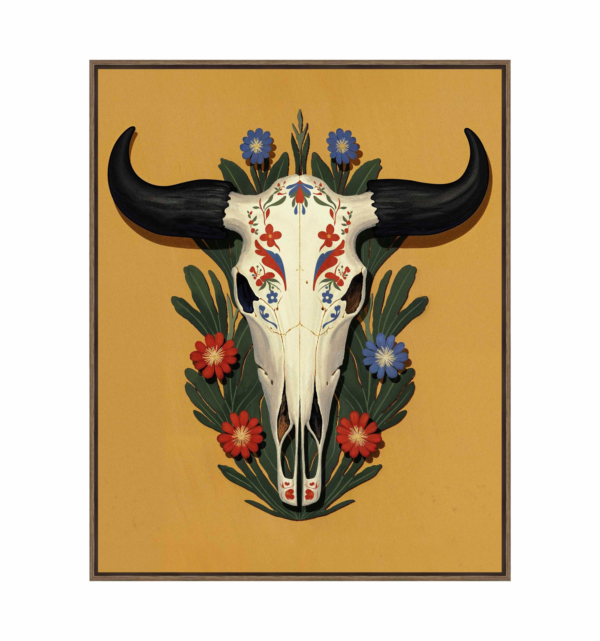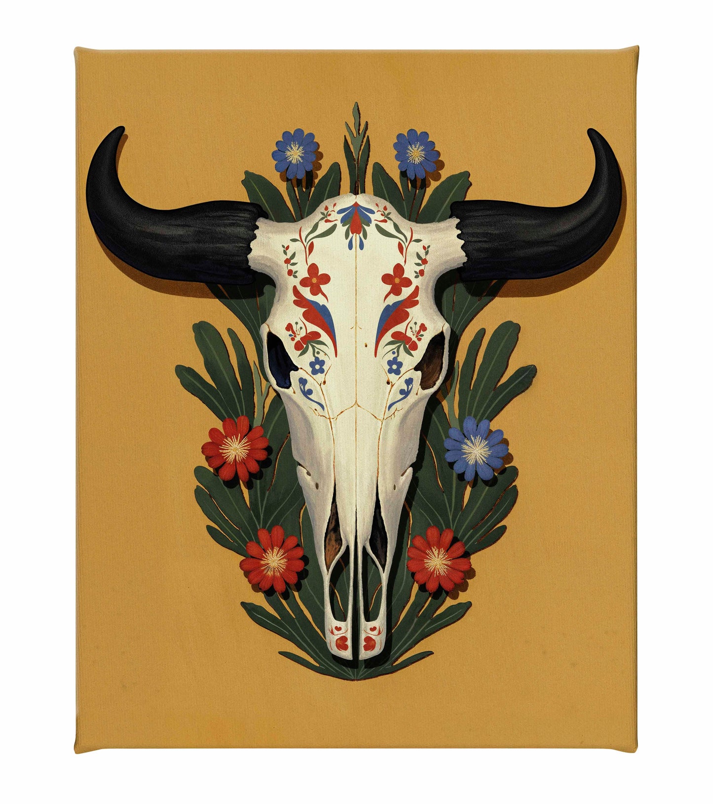 "Dust Bowl Relic" is a striking visual narrative that combines the ruggedness of the Old West with the delicate beauty of nature. At the heart of the composition is a meticulously rendered bull skull, painted in a soft white hue and adorned with intricate floral patterns. Vibrant red, blue, and green accents are delicately placed across the skull, forming symmetrical floral motifs that soften its stark appearance. These details provide a sense of rebirth and continuity in the face of the harsh realities of the Western landscape.