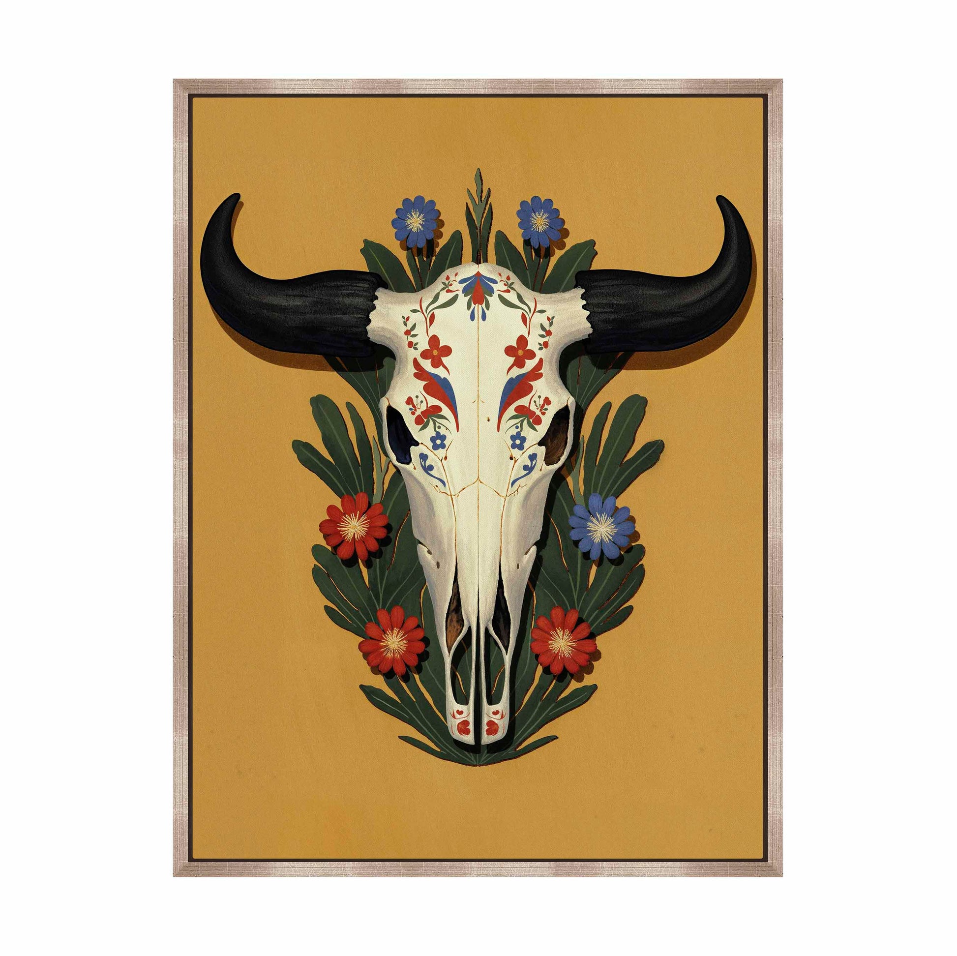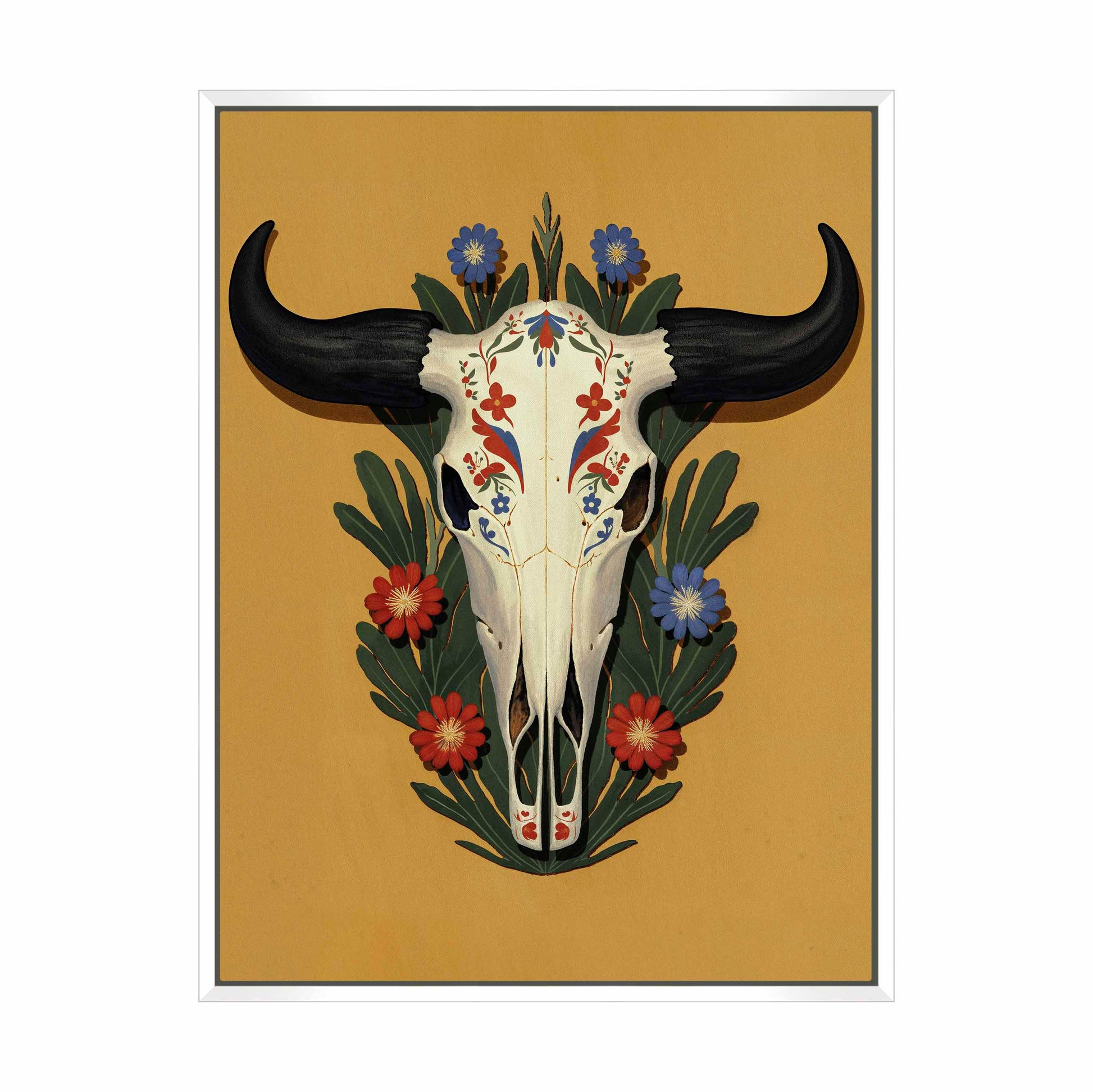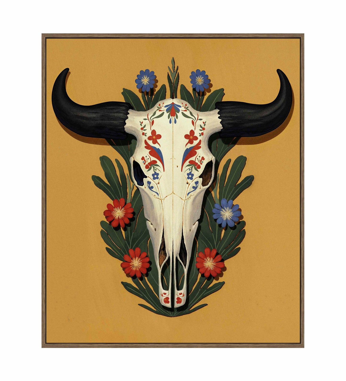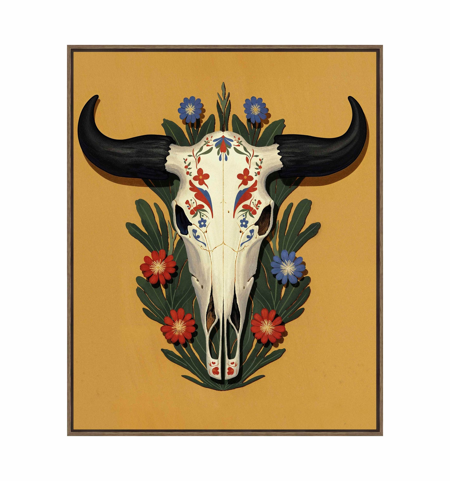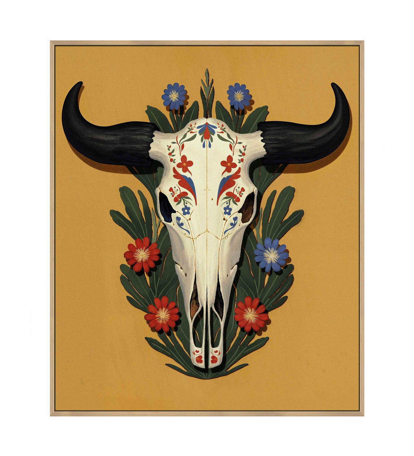 "Dust Bowl Relic" is a striking visual narrative that combines the ruggedness of the Old West with the delicate beauty of nature. At the heart of the composition is a meticulously rendered bull skull, painted in a soft white hue and adorned with intricate floral patterns. Vibrant red, blue, and green accents are delicately placed across the skull, forming symmetrical floral motifs that soften its stark appearance. These details provide a sense of rebirth and continuity in the face of the harsh realities of the Western landscape.