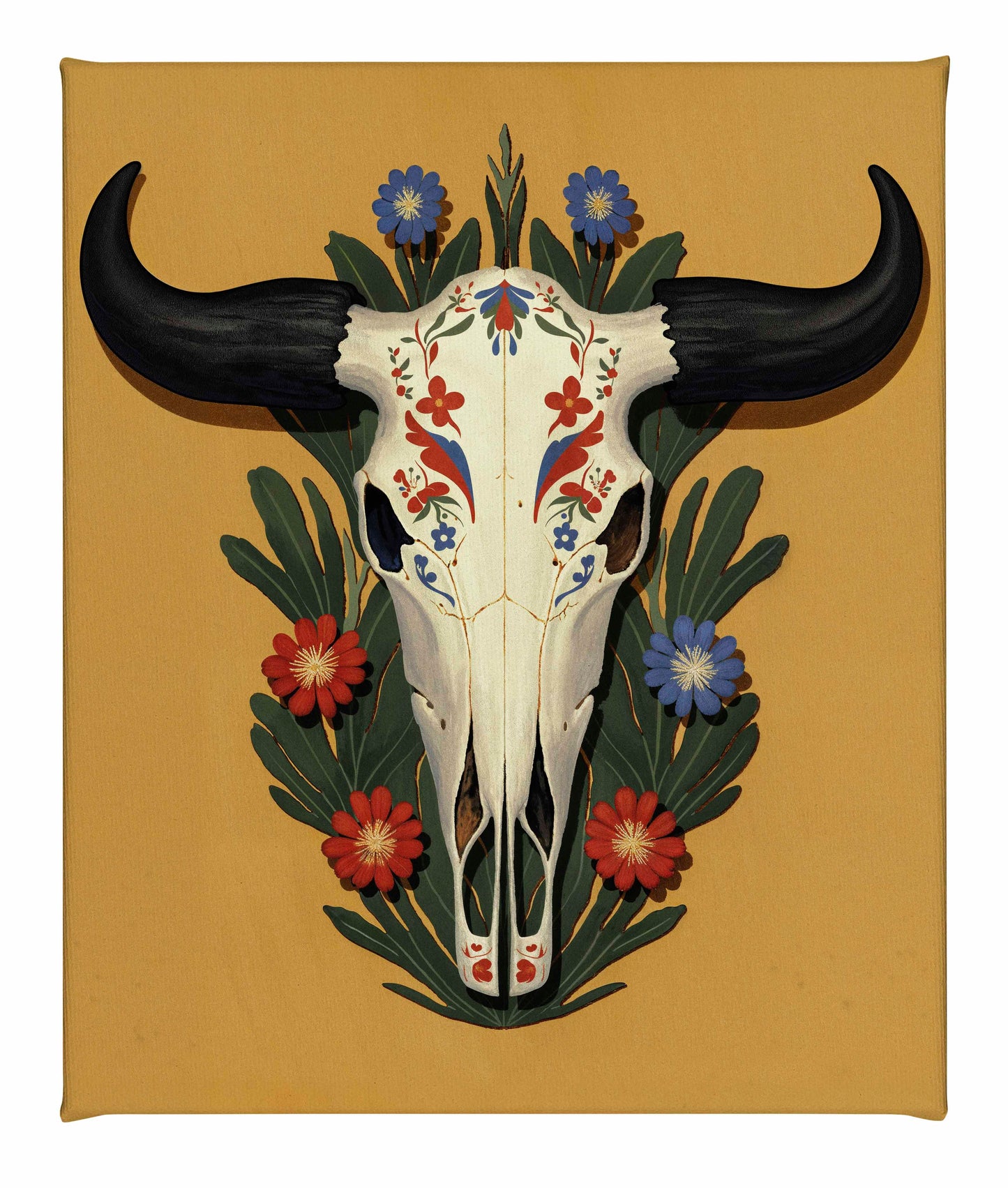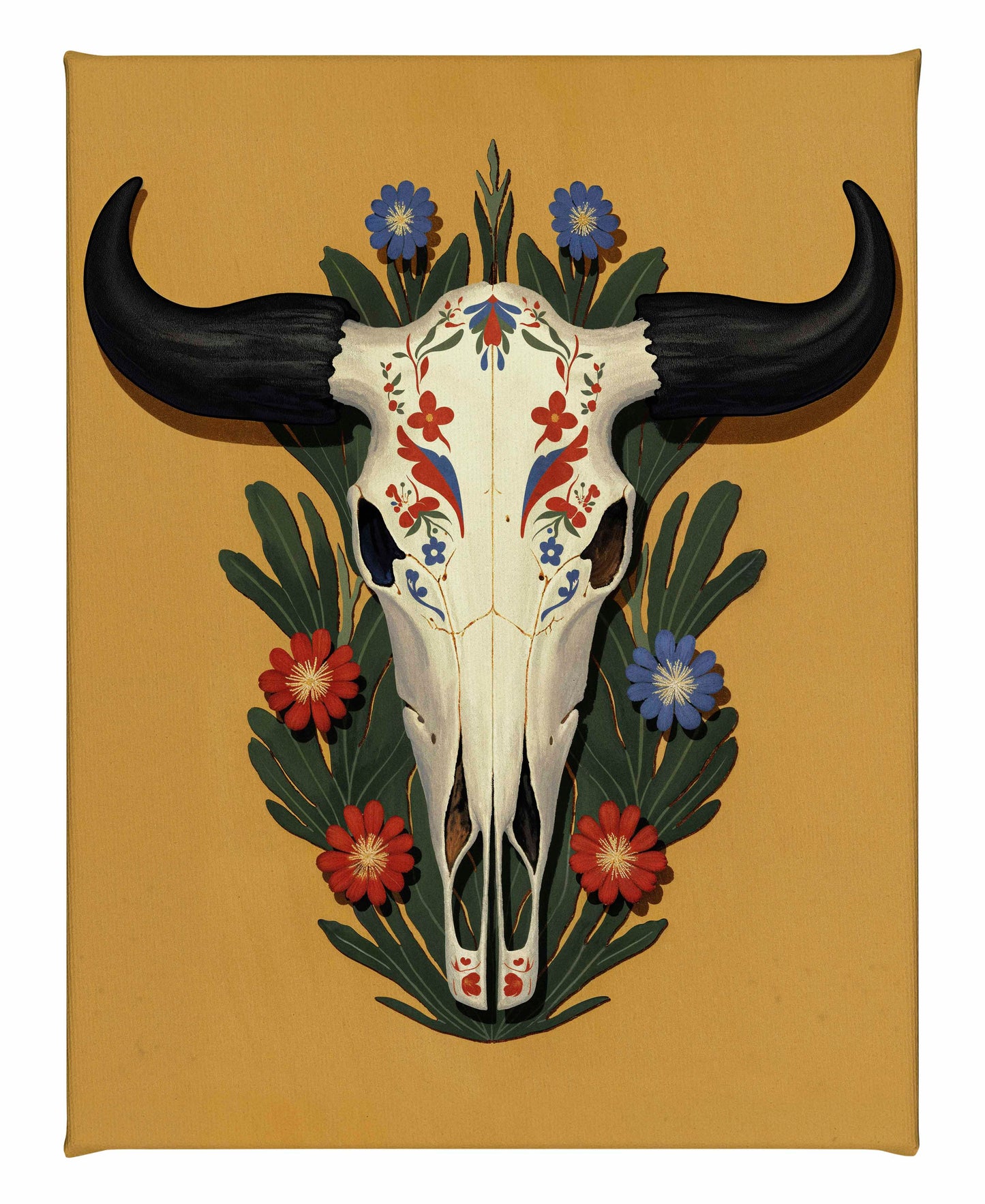 The warm background evokes the dry, sun-baked lands of the American Southwest, grounding the piece in a historical and geographical context. The detailed embellishments on the skull suggest that even in desolate times, beauty and culture endure.