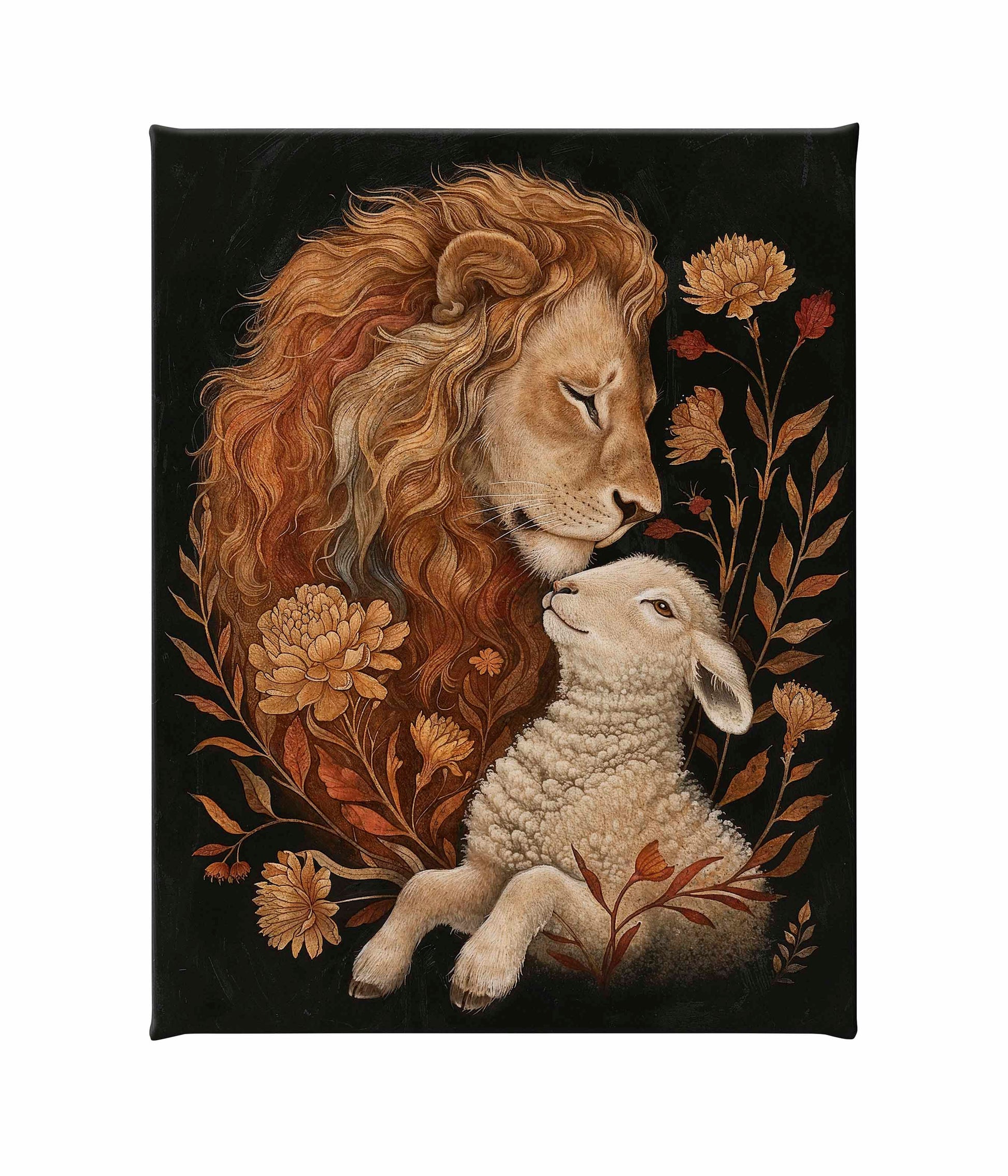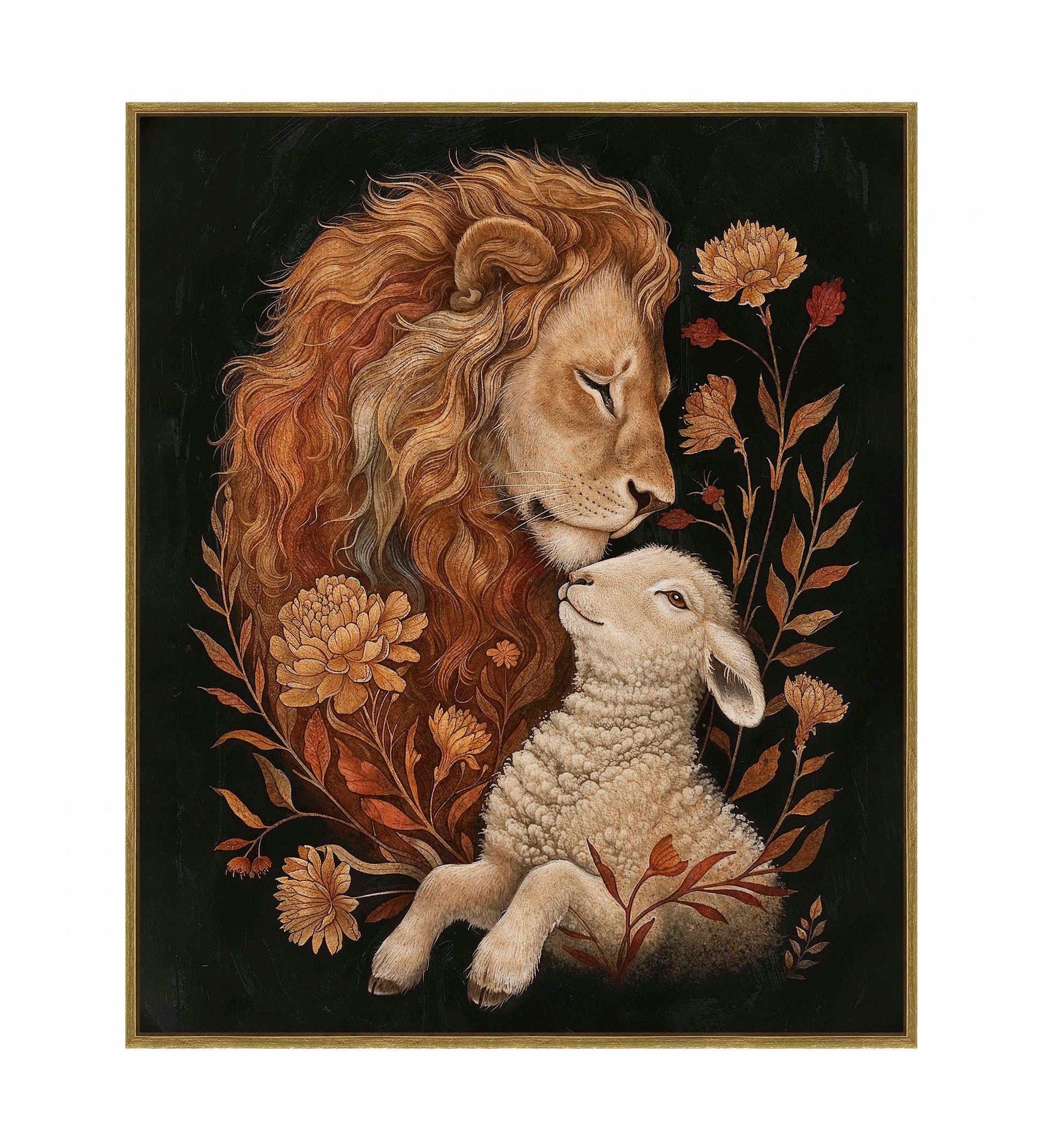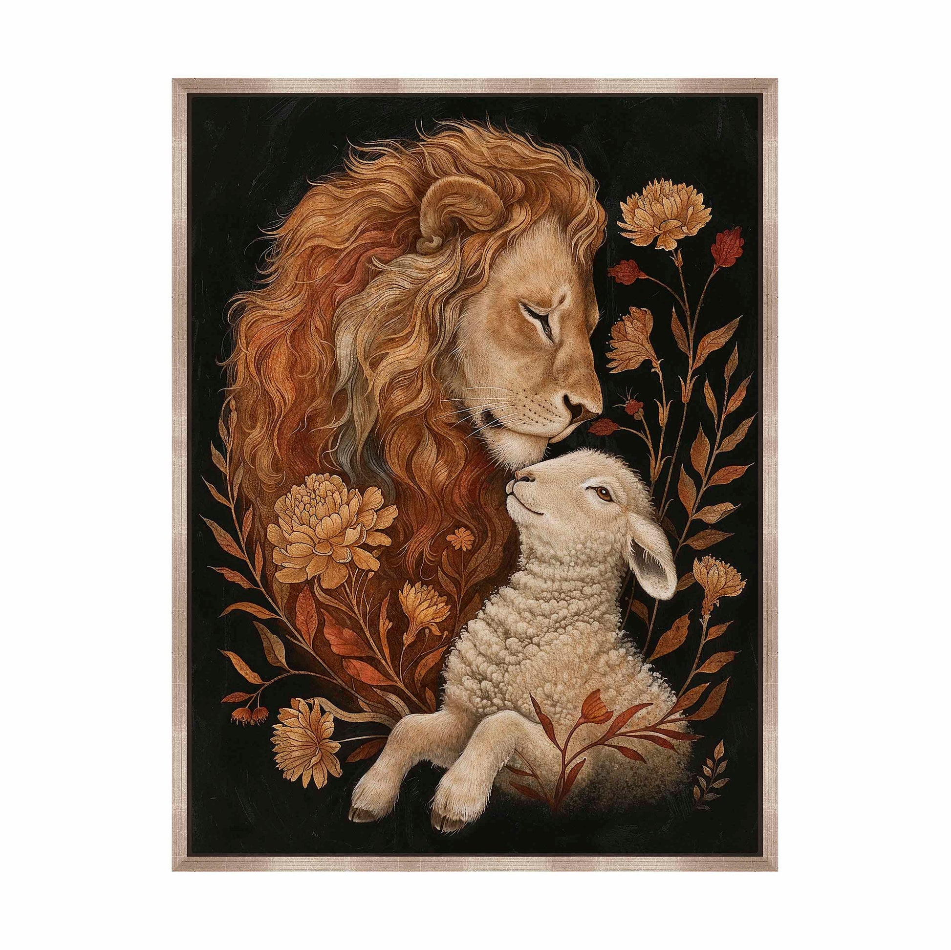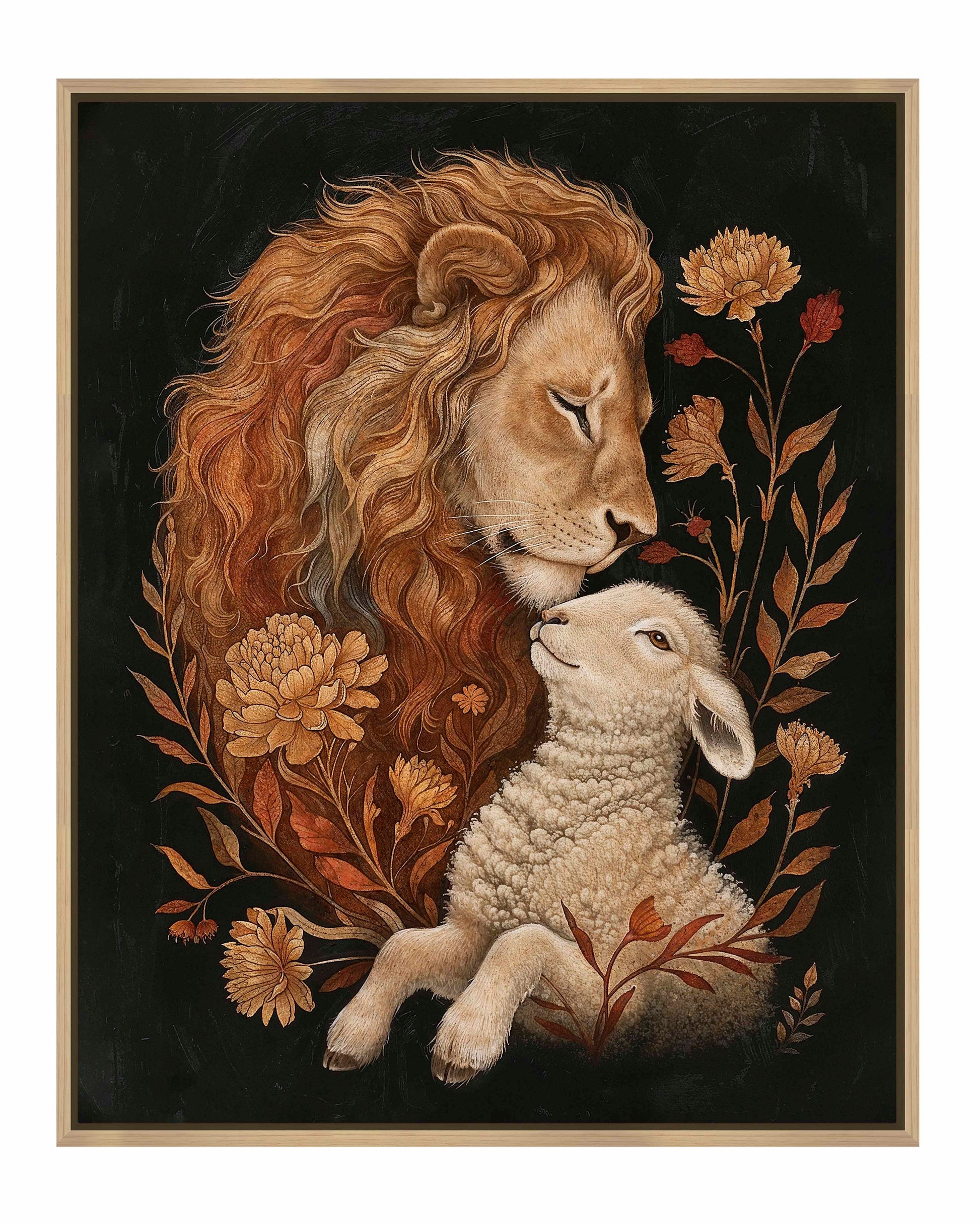 Eden Restored is a beautifully detailed painting depicting a tender and peaceful moment between a lion and a lamb, symbolizing harmony and unity. The lion, with its flowing golden mane, gently rests its head against the lamb, conveying a sense of protection and serenity.