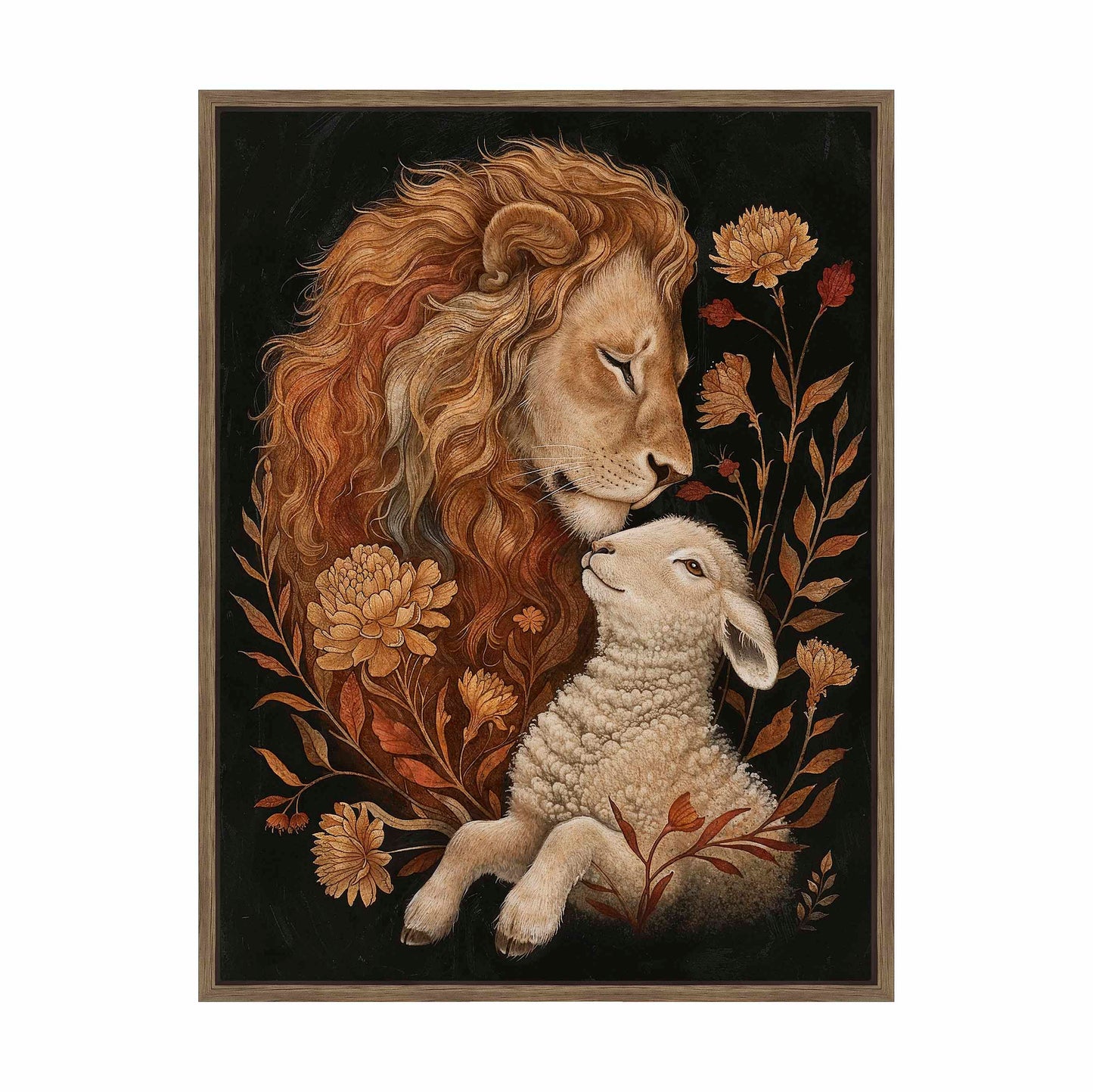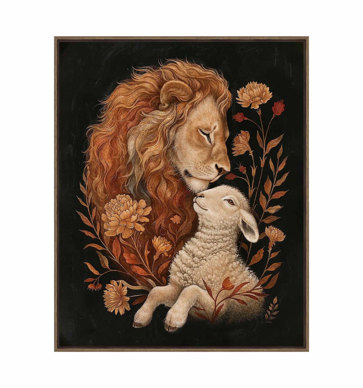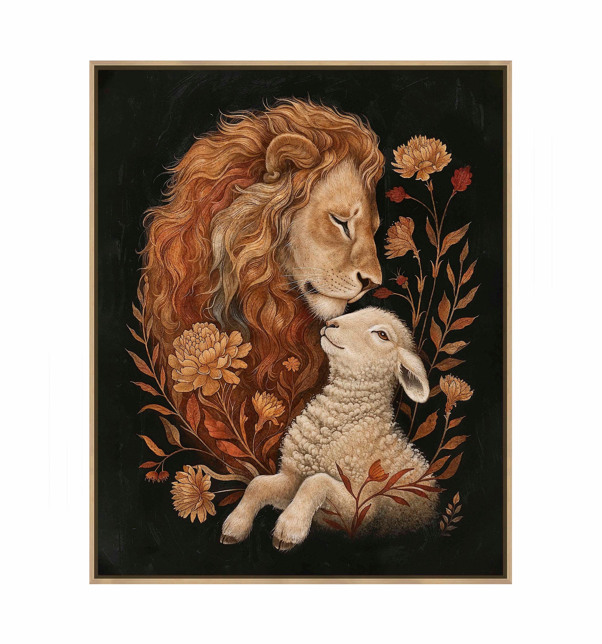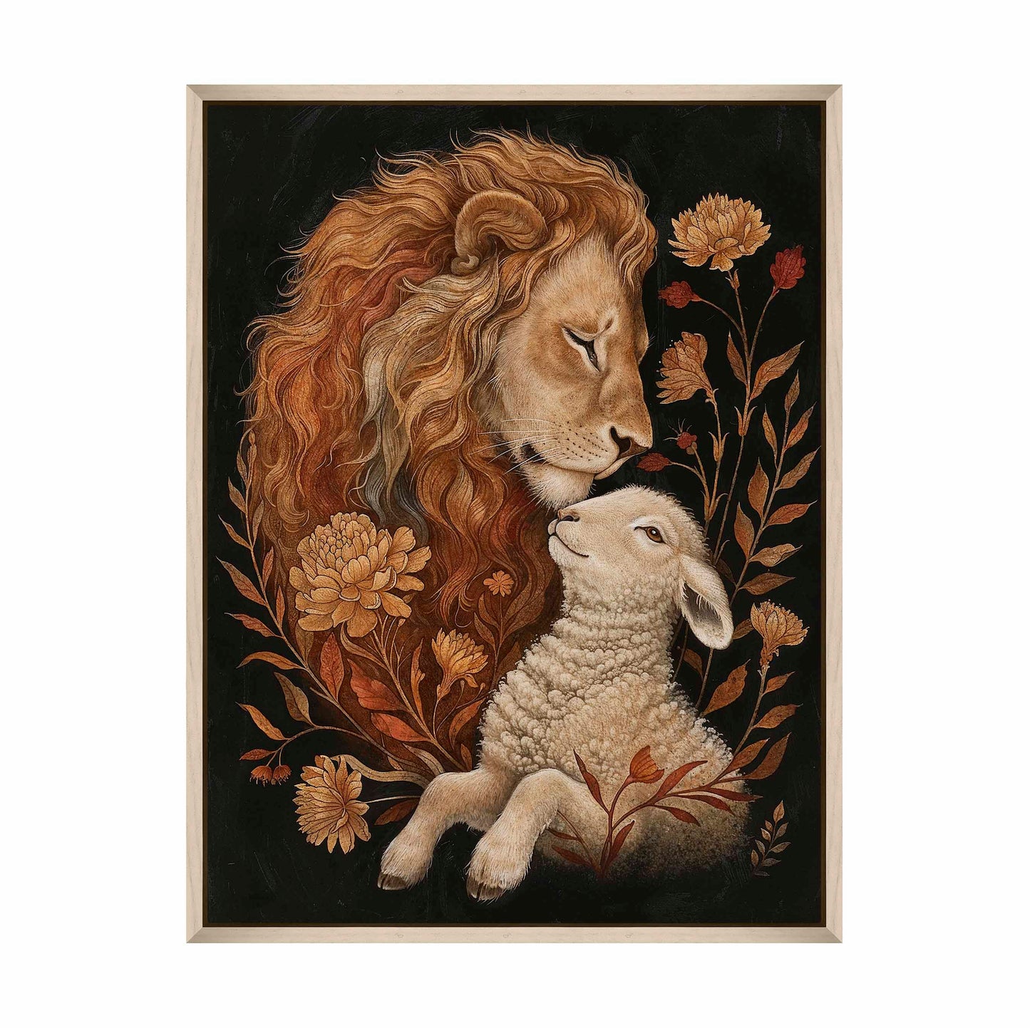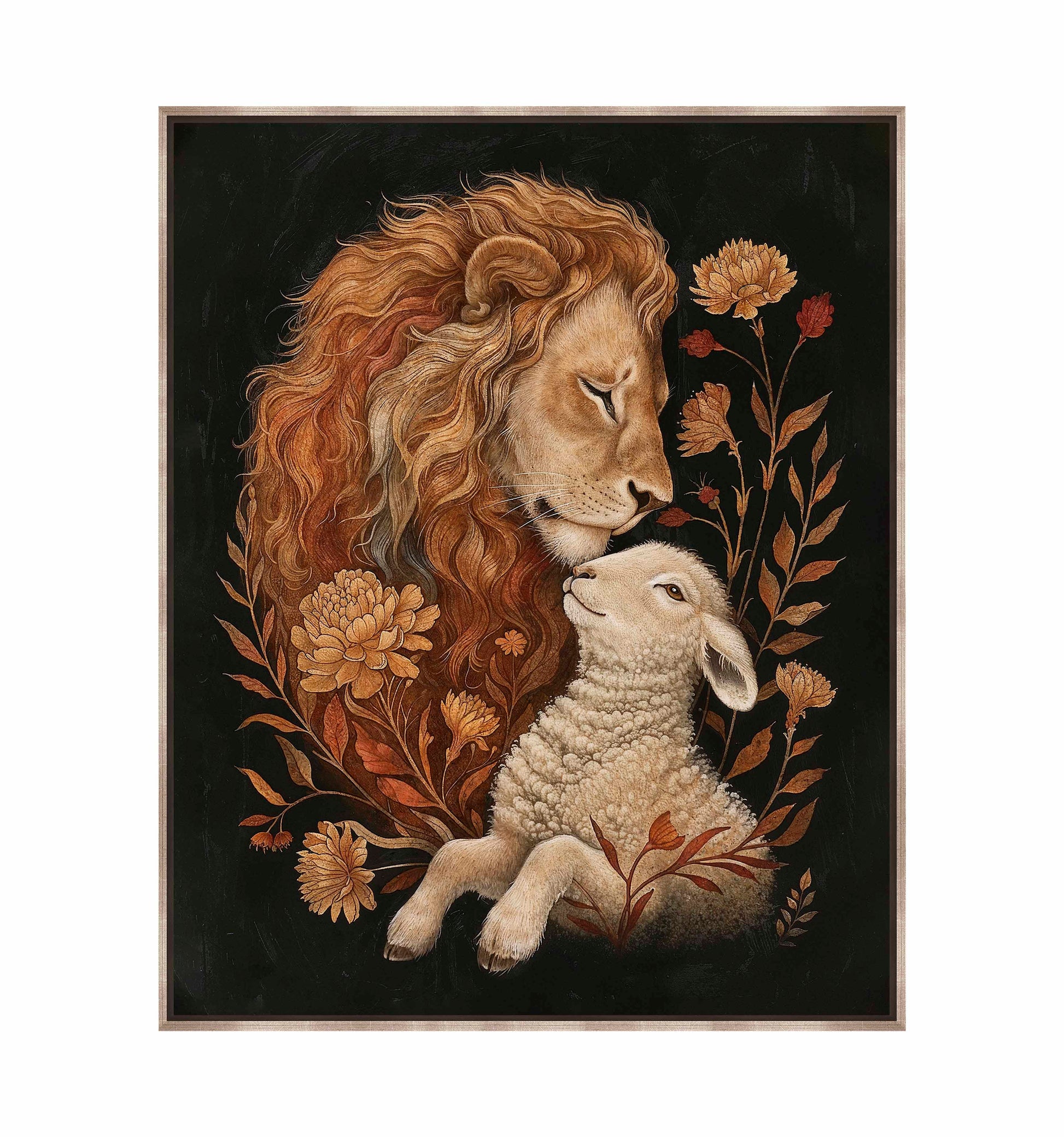 Eden Restored is a beautifully detailed painting depicting a tender and peaceful moment between a lion and a lamb, symbolizing harmony and unity. The lion, with its flowing golden mane, gently rests its head against the lamb, conveying a sense of protection and serenity.