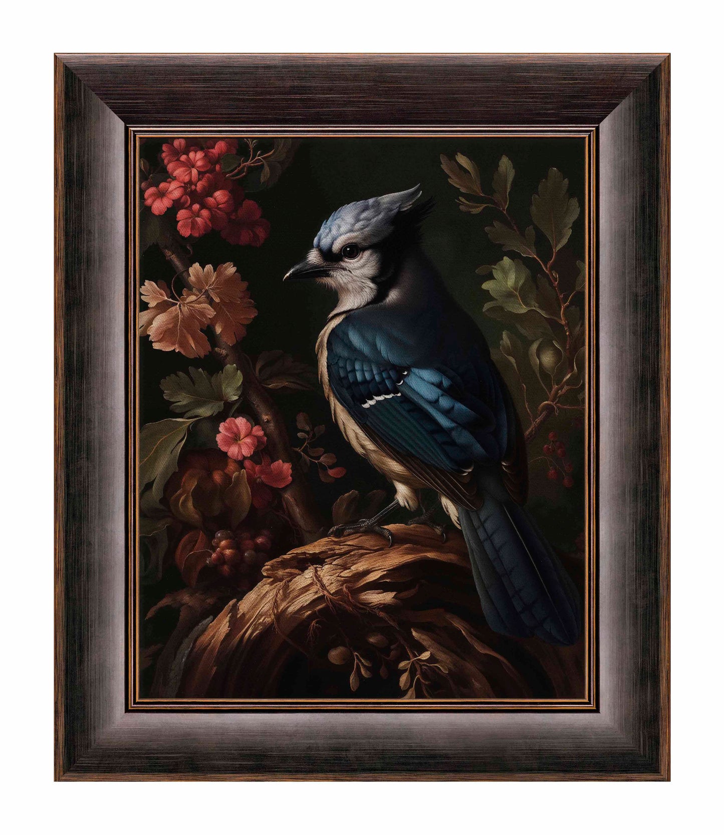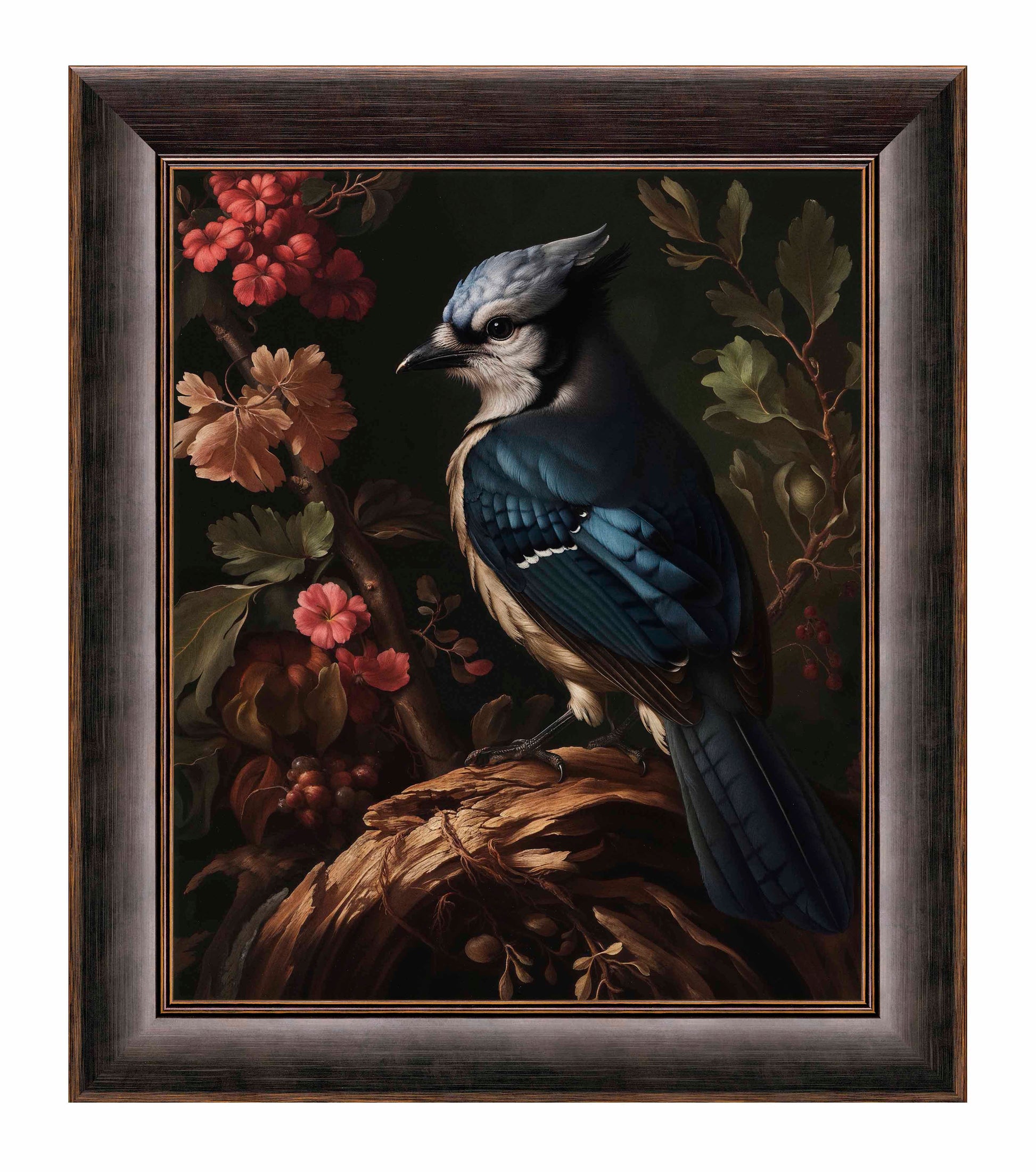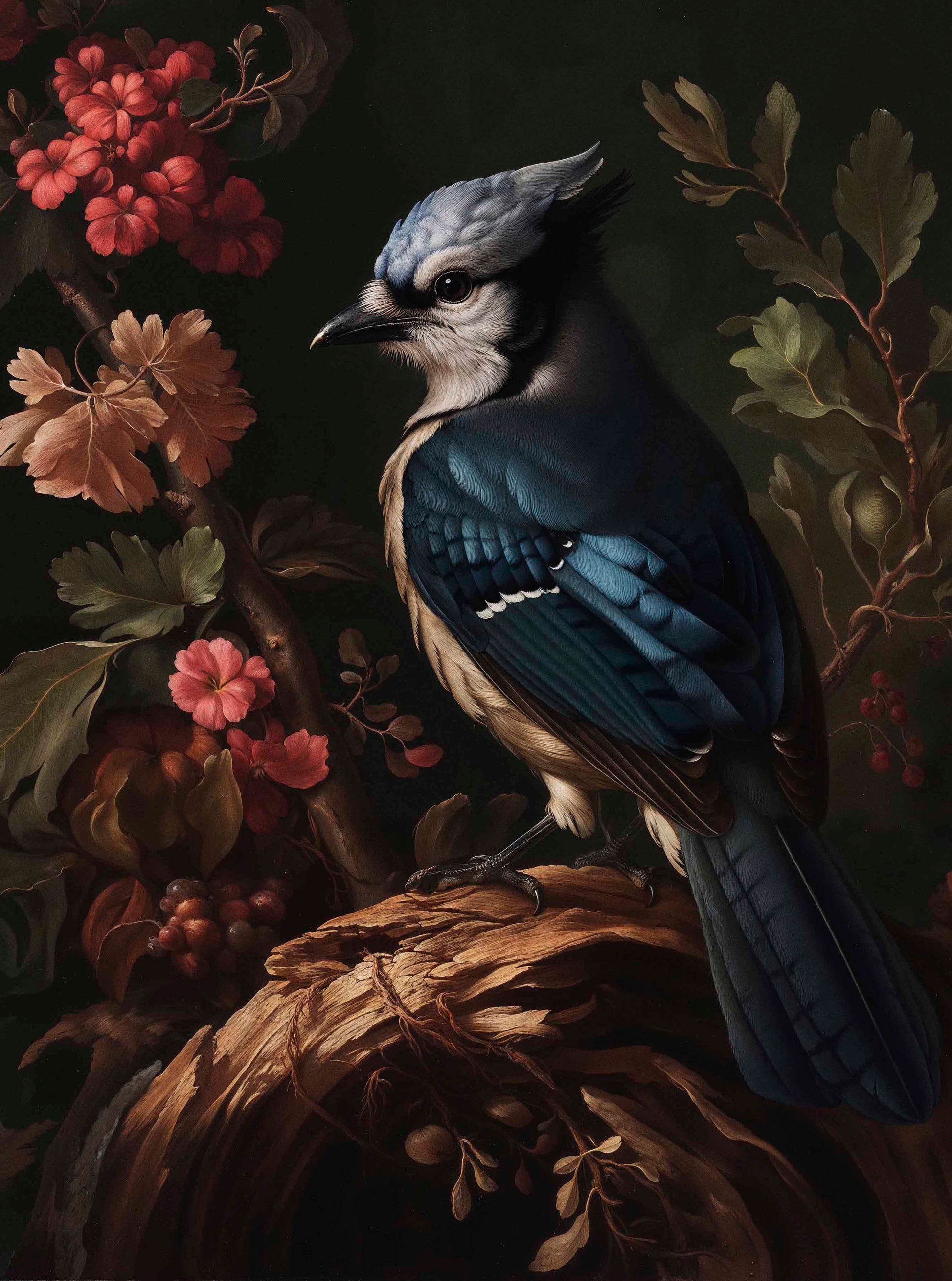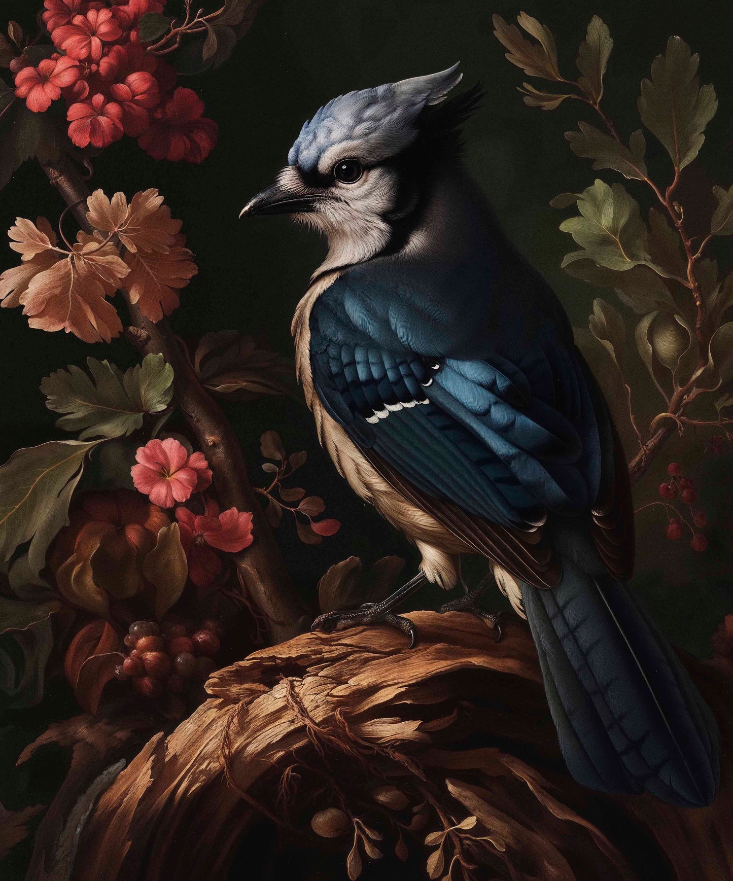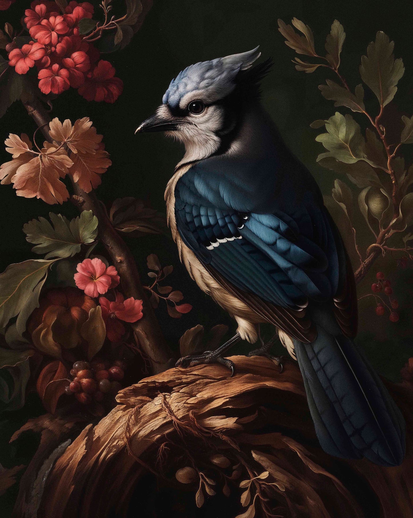 In Elegance in Bloom - Blue Jay Amongst Flora, the artist captures the serene beauty and delicate balance of nature. This painting features a striking Blue Jay, perched gracefully amidst a rich tapestry of flowers and foliage, reminiscent of the Dutch Floral still-life tradition. The Blue Jay's vibrant blue plumage stands in stark contrast to the warm, earthy tones of the surrounding flora, creating a captivating visual harmony. The meticulous detailing of each petal and feather, combined with the soft play of light and shadow, brings an almost three-dimensional quality to the work. This piece not only celebrates the intricate beauty of the natural world but also evokes a sense of timeless elegance and tranquility. Ideal for collectors and nature enthusiasts alike, Elegance in Bloom: Blue Jay Amongst Flora is a testament to the enduring allure of classic floral art.