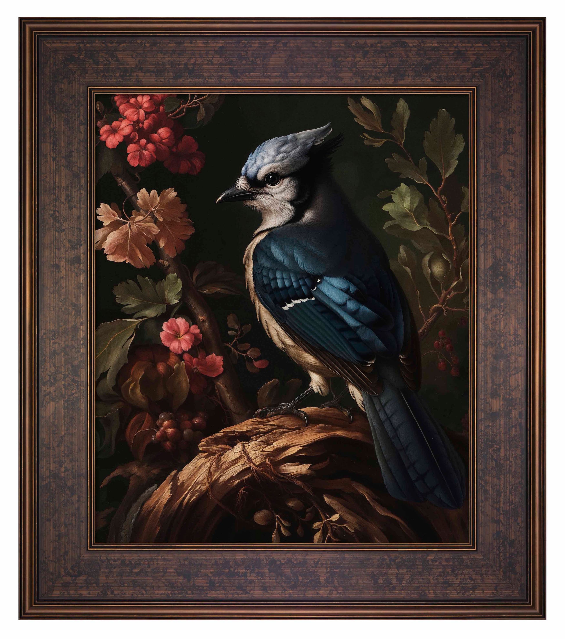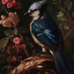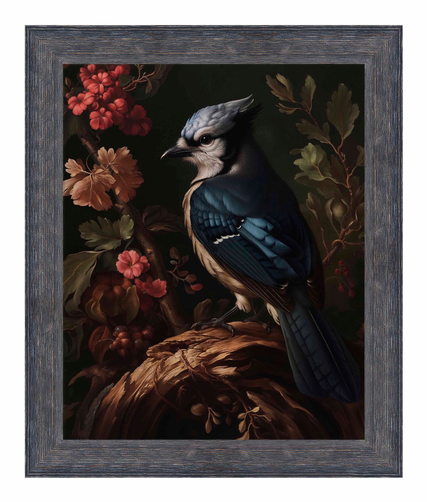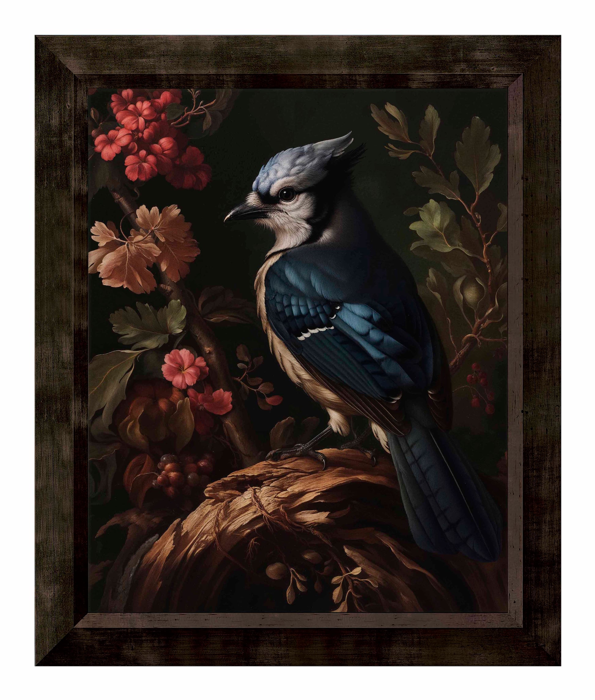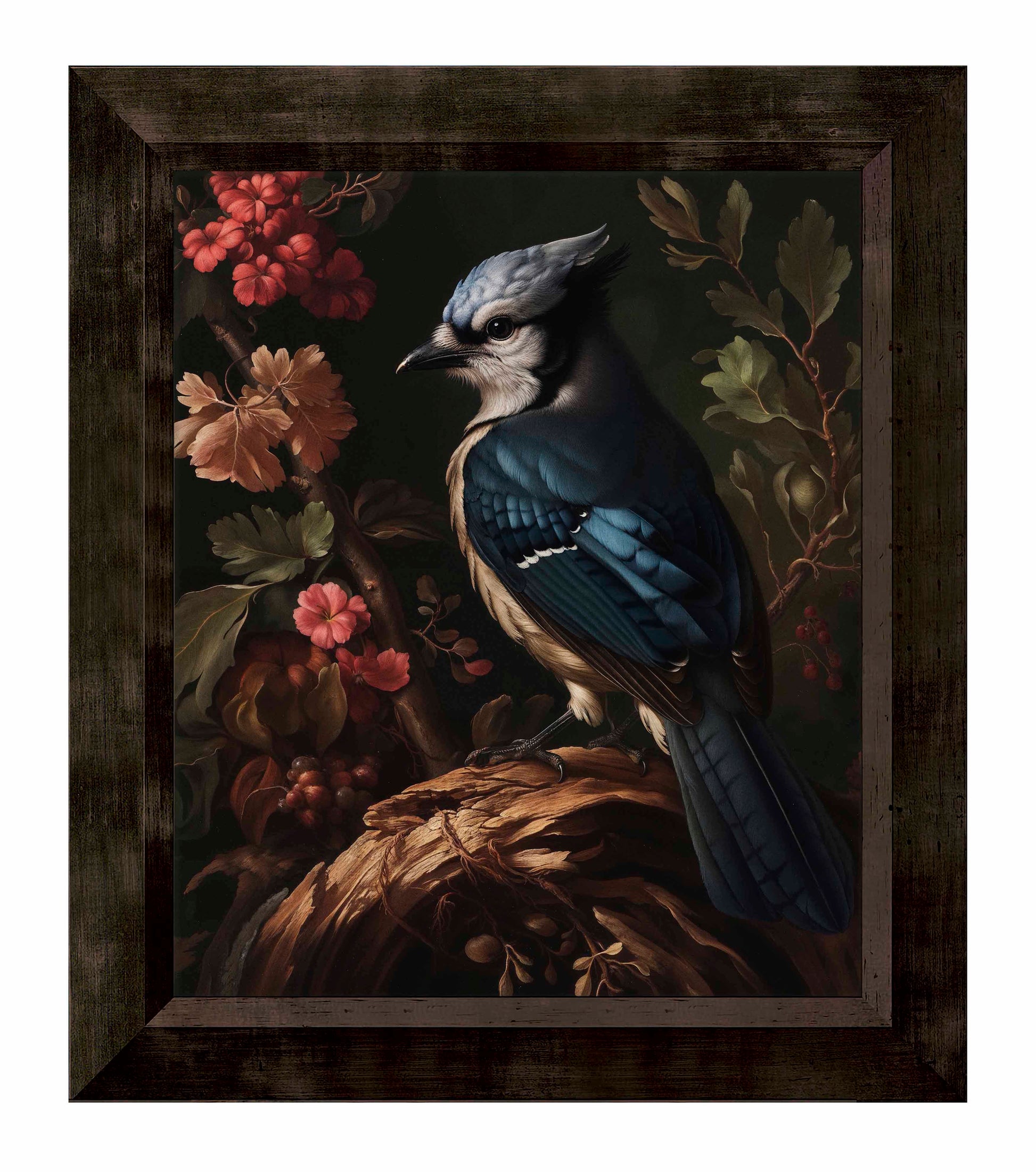 In Elegance in Bloom - Blue Jay Amongst Flora, the artist captures the serene beauty and delicate balance of nature. This painting features a striking Blue Jay, perched gracefully amidst a rich tapestry of flowers and foliage, reminiscent of the Dutch Floral still-life tradition. The Blue Jay's vibrant blue plumage stands in stark contrast to the warm, earthy tones of the surrounding flora, creating a captivating visual harmony. The meticulous detailing of each petal and feather, combined with the soft play of light and shadow, brings an almost three-dimensional quality to the work. This piece not only celebrates the intricate beauty of the natural world but also evokes a sense of timeless elegance and tranquility. Ideal for collectors and nature enthusiasts alike, Elegance in Bloom: Blue Jay Amongst Flora is a testament to the enduring allure of classic floral art.