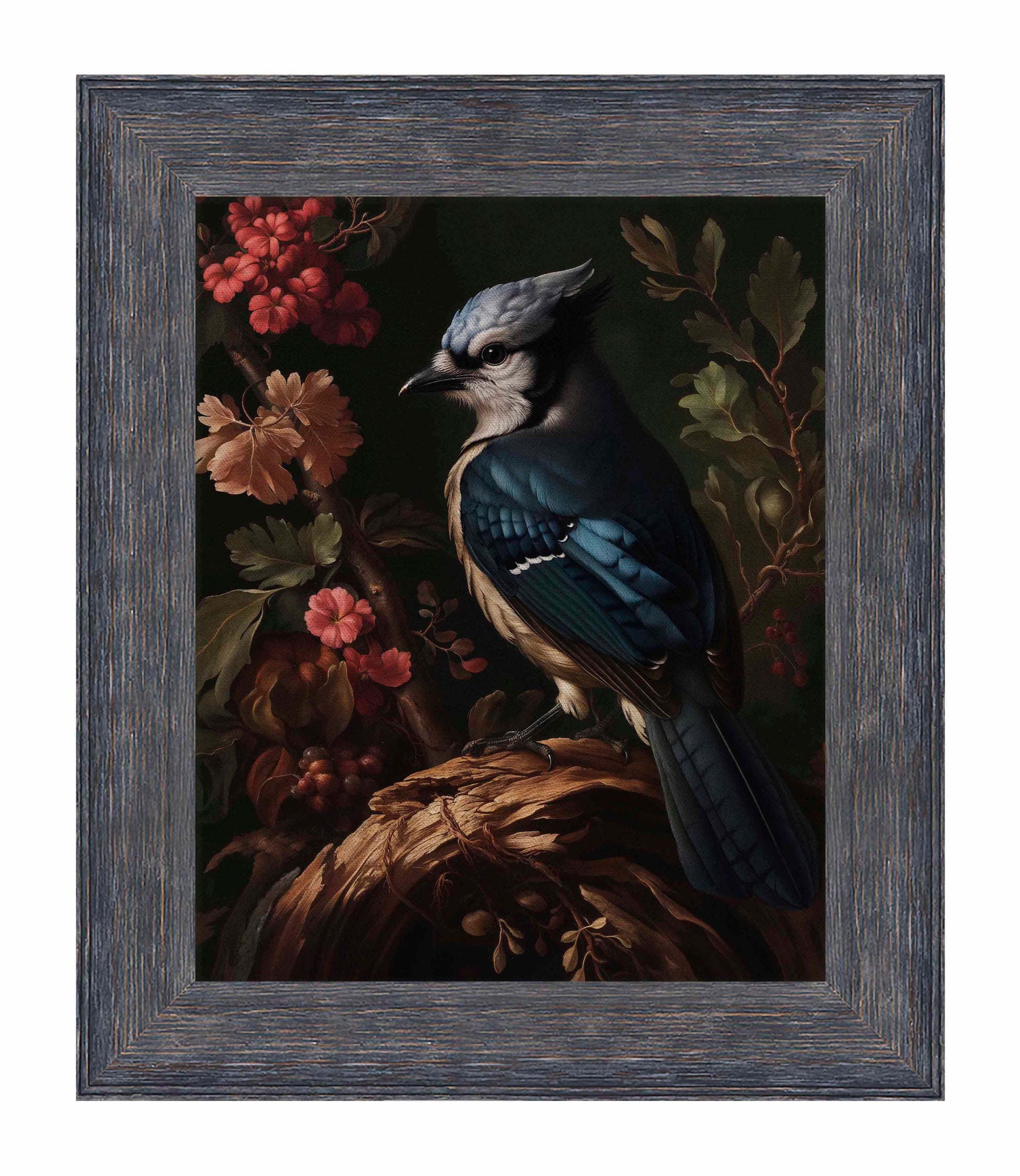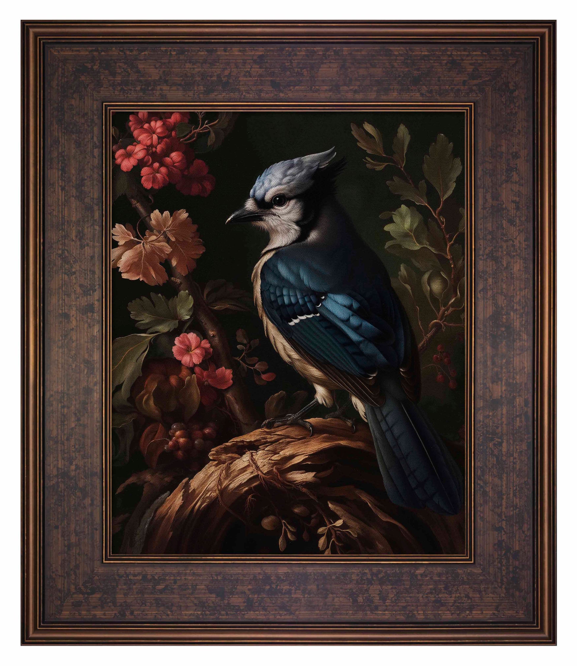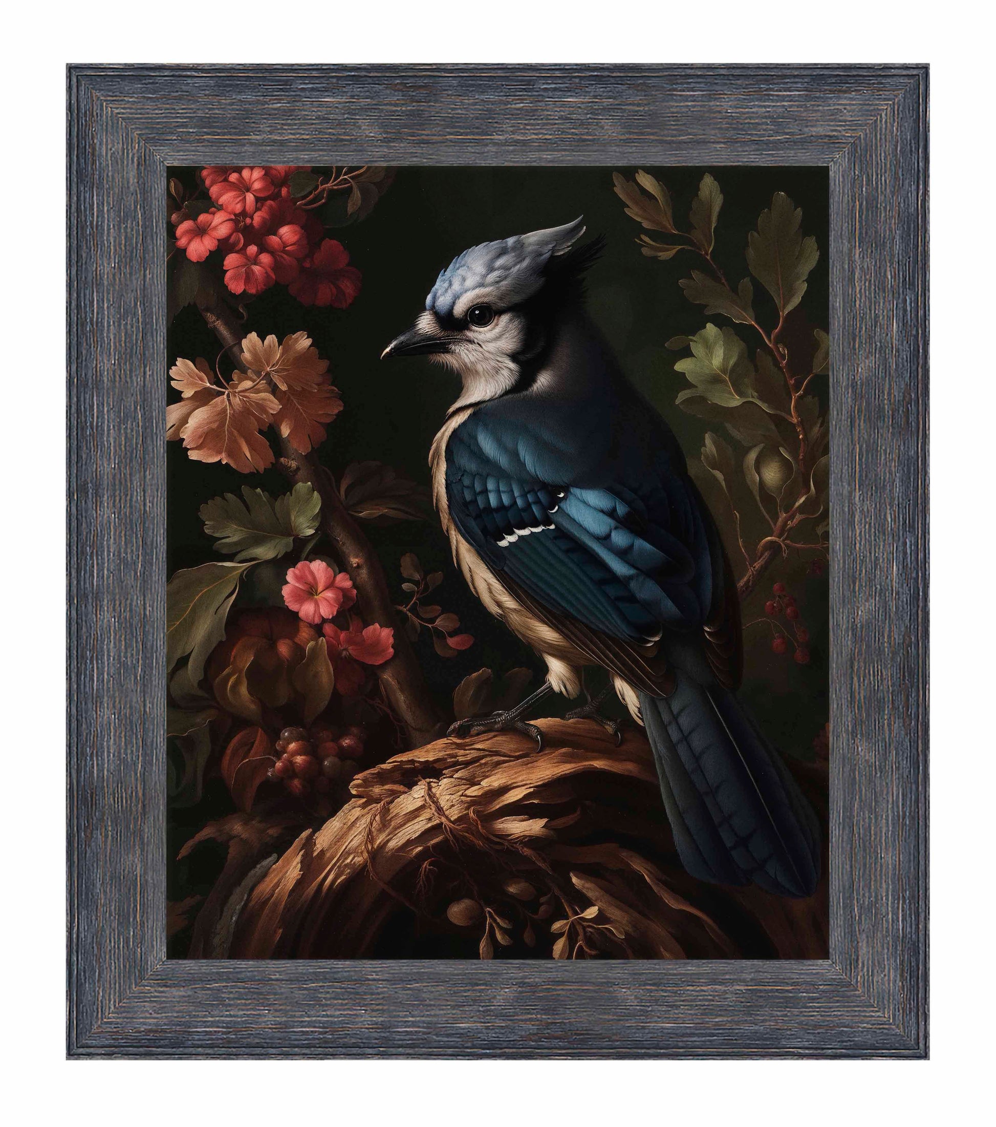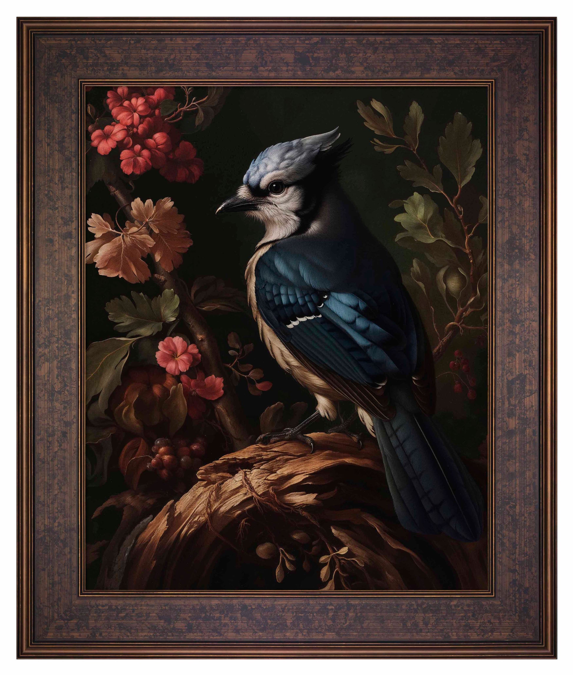 In Elegance in Bloom - Blue Jay Amongst Flora, the artist captures the serene beauty and delicate balance of nature. This painting features a striking Blue Jay, perched gracefully amidst a rich tapestry of flowers and foliage, reminiscent of the Dutch Floral still-life tradition. The Blue Jay's vibrant blue plumage stands in stark contrast to the warm, earthy tones of the surrounding flora, creating a captivating visual harmony. The meticulous detailing of each petal and feather, combined with the soft play of light and shadow, brings an almost three-dimensional quality to the work. This piece not only celebrates the intricate beauty of the natural world but also evokes a sense of timeless elegance and tranquility. Ideal for collectors and nature enthusiasts alike, Elegance in Bloom: Blue Jay Amongst Flora is a testament to the enduring allure of classic floral art.