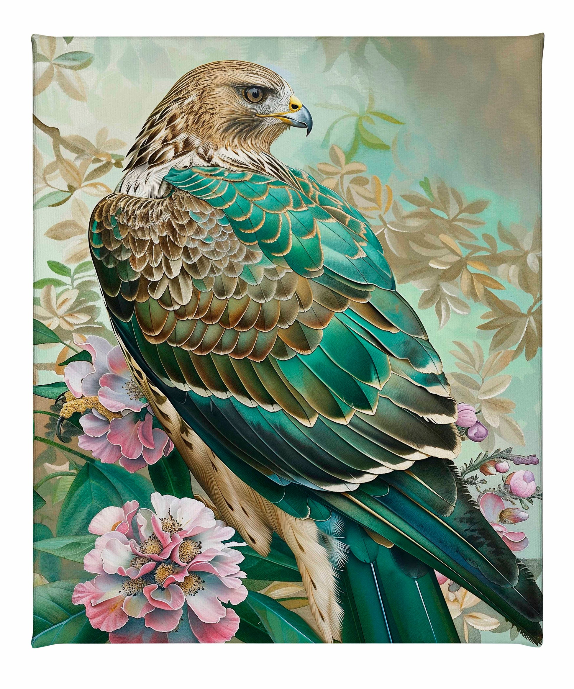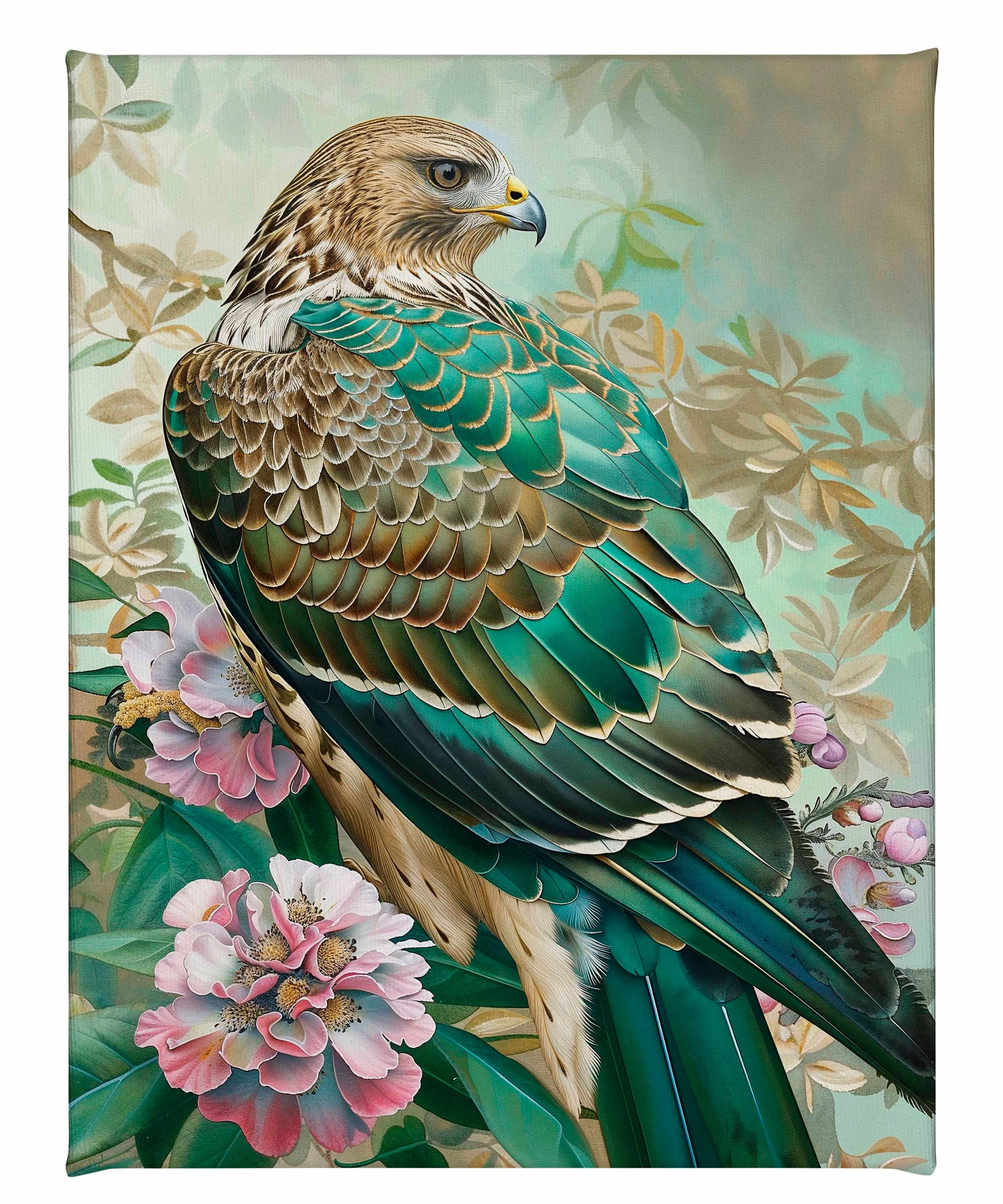 Emerald Majesty - Hawk Amidst Blossoms is a stunning piece from the Sonora Emerald Collection, capturing the serene beauty and regal presence of a hawk perched gracefully amidst blooming flowers. The hawk's plumage, rendered in a vibrant array of greens and earthy tones, is meticulously detailed, showcasing the intricate patterns and textures of its feathers. The soft, pastel background of leaves and blossoms adds a delicate contrast, emphasizing the hawk's majestic stance.