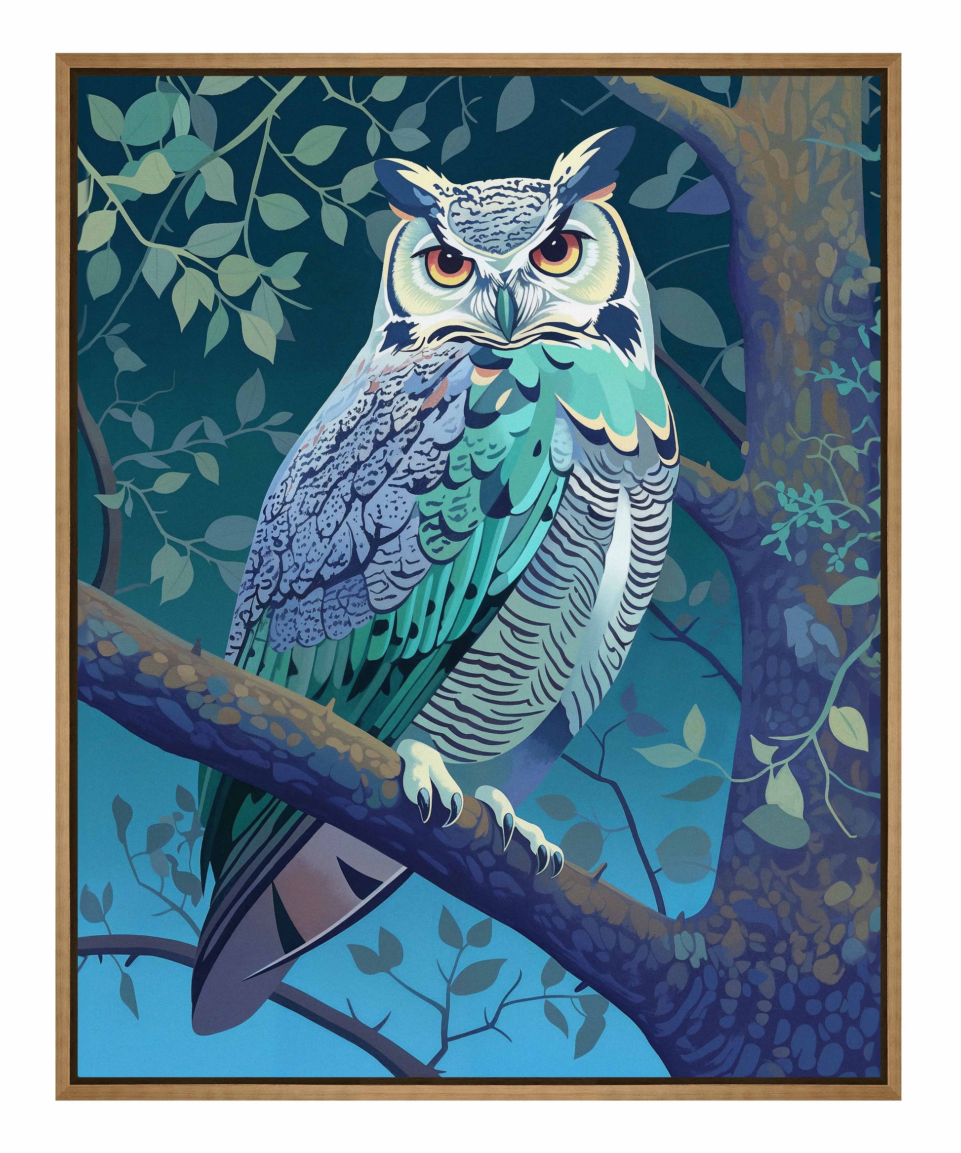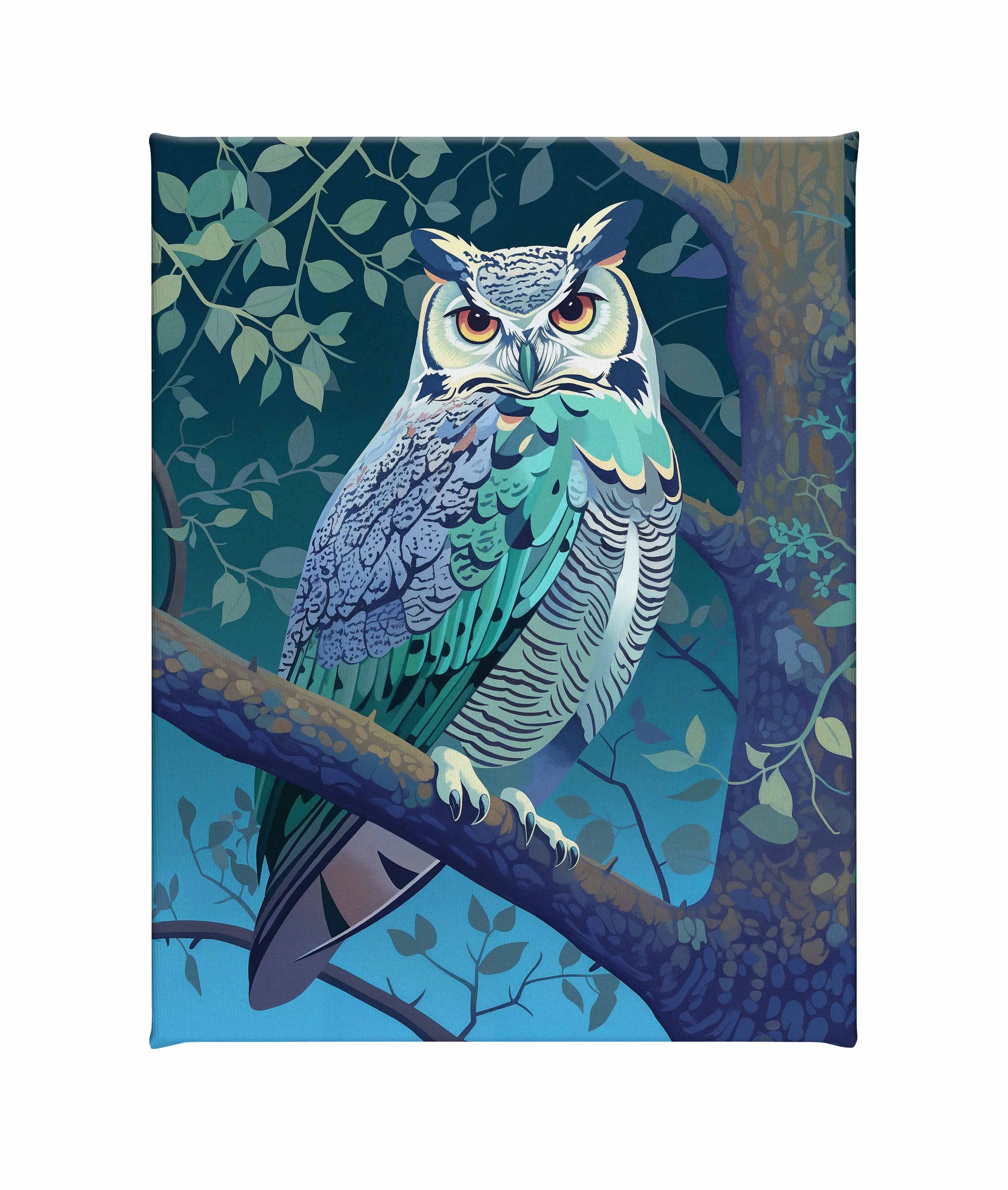 The artist's use of bold, saturated colors and intricate patterns brings the scene to life, creating a sense of depth and enchantment within the foliage. The dynamic interplay of light and shadow enhances the owl's regal stance, making it the focal point against the varied hues of the background. The rich, contrasting tones draw the viewer's eye, adding a sense of vibrancy and intrigue to the scene.