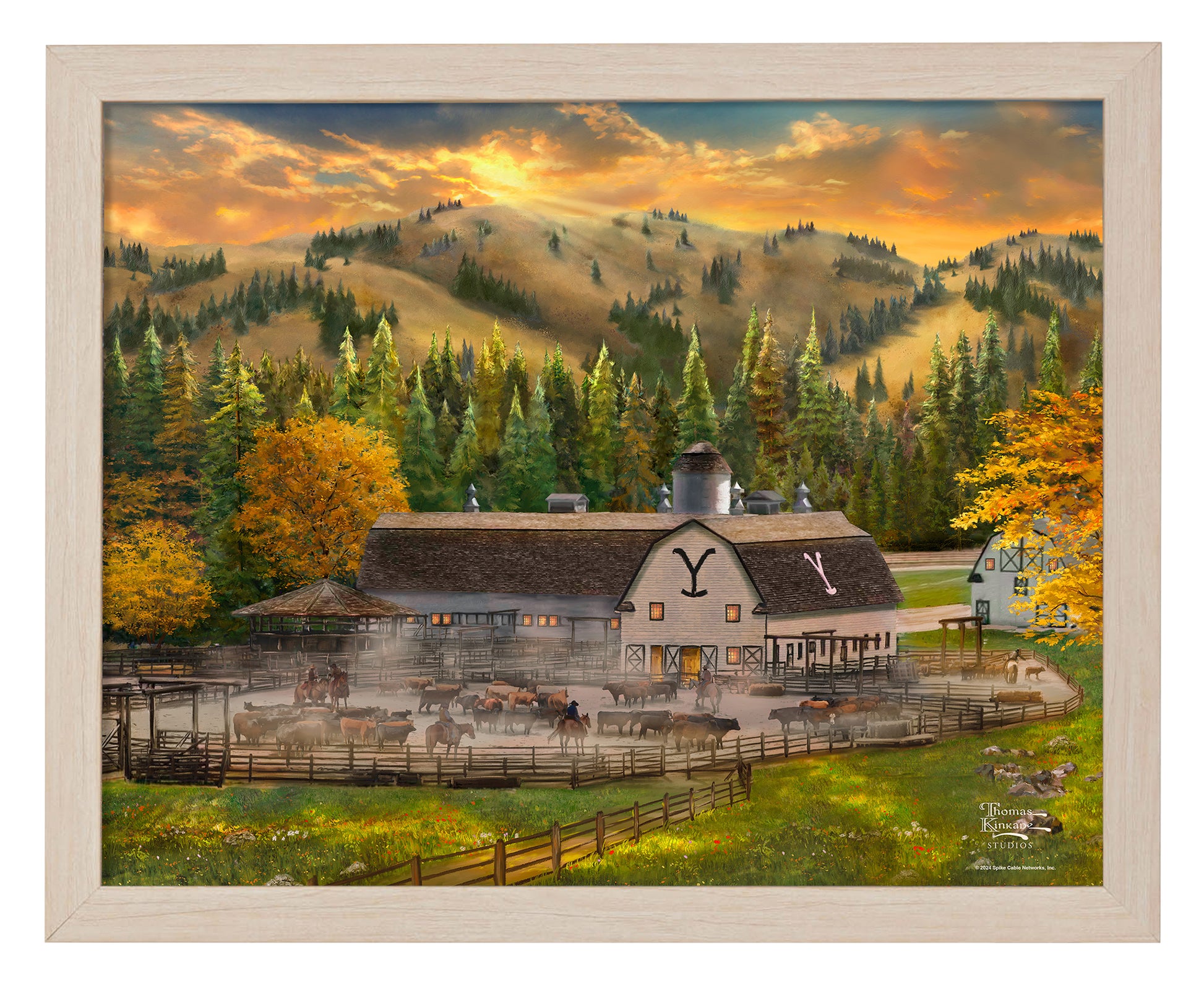 End of a Long Day, another evocative piece from the Yellowstone television series collection, showcases the iconic Dutton Ranch barn at dusk, with its distinctive 'Y' brand proudly displayed. The painting captures a peaceful moment as riders return from their daily work against a backdrop of Montana's rolling hills and autumn-touched landscape. The artist masterfully renders the fading light of day through a dramatic sky of turquoise and gold clouds, while the foreground depicts the ranch's working heart - its circular training corral, weathered fences, and the magnificent white barn standing sentinel over the property. The scene embodies the quiet dignity of ranch life that lies at the core of the Yellowstone saga, where each day ends with a return to the place that the Dutton family has called home for generations.
