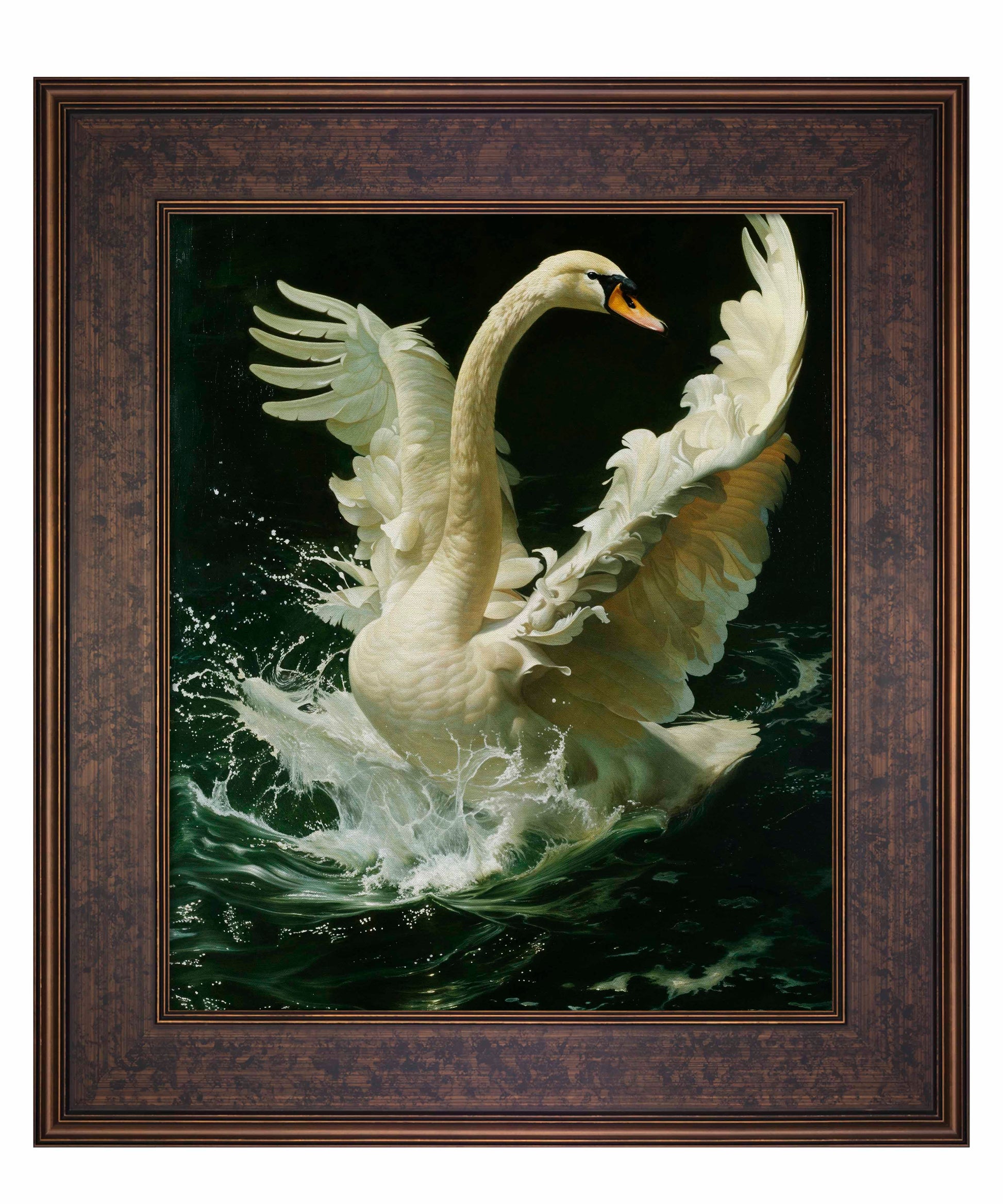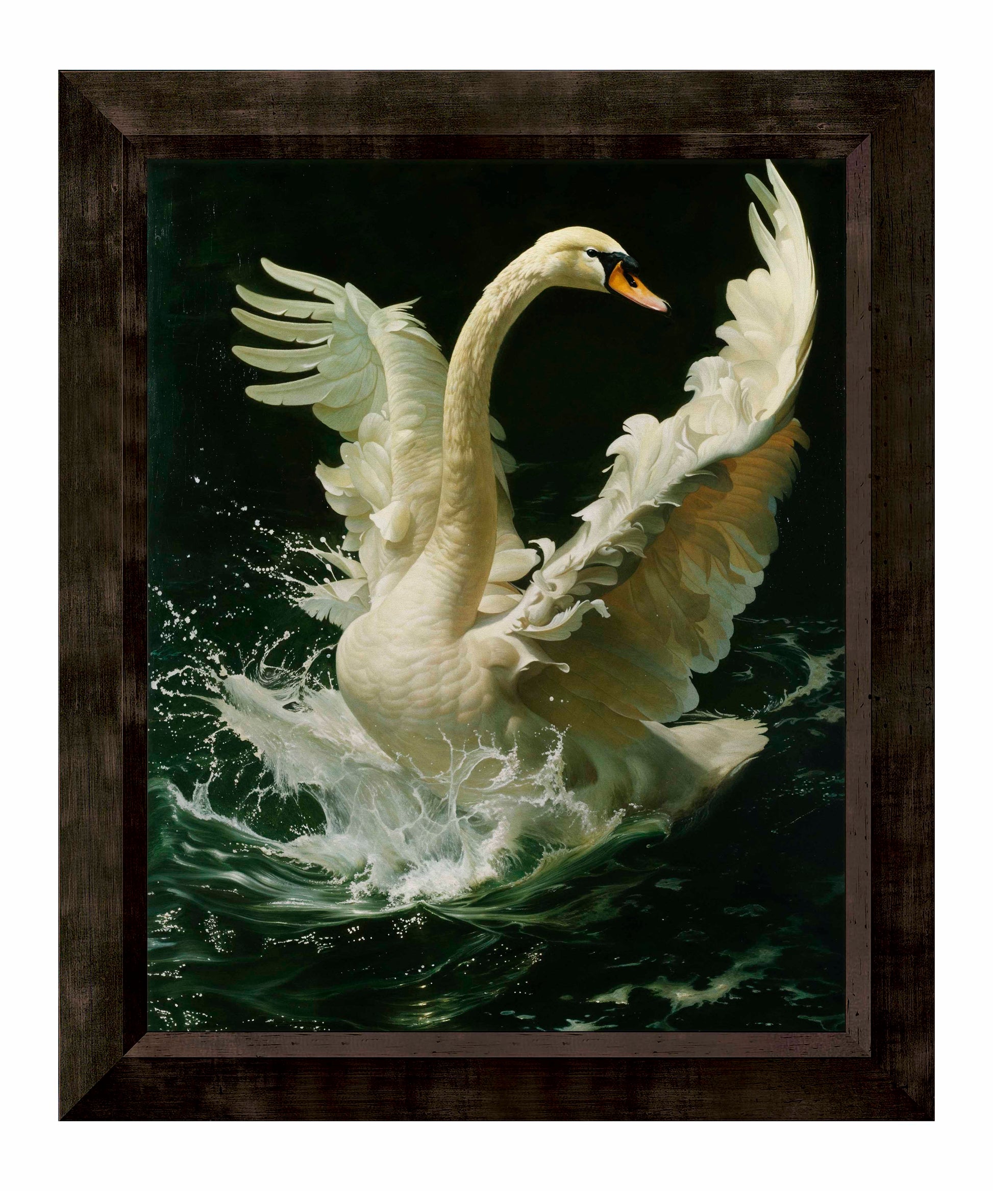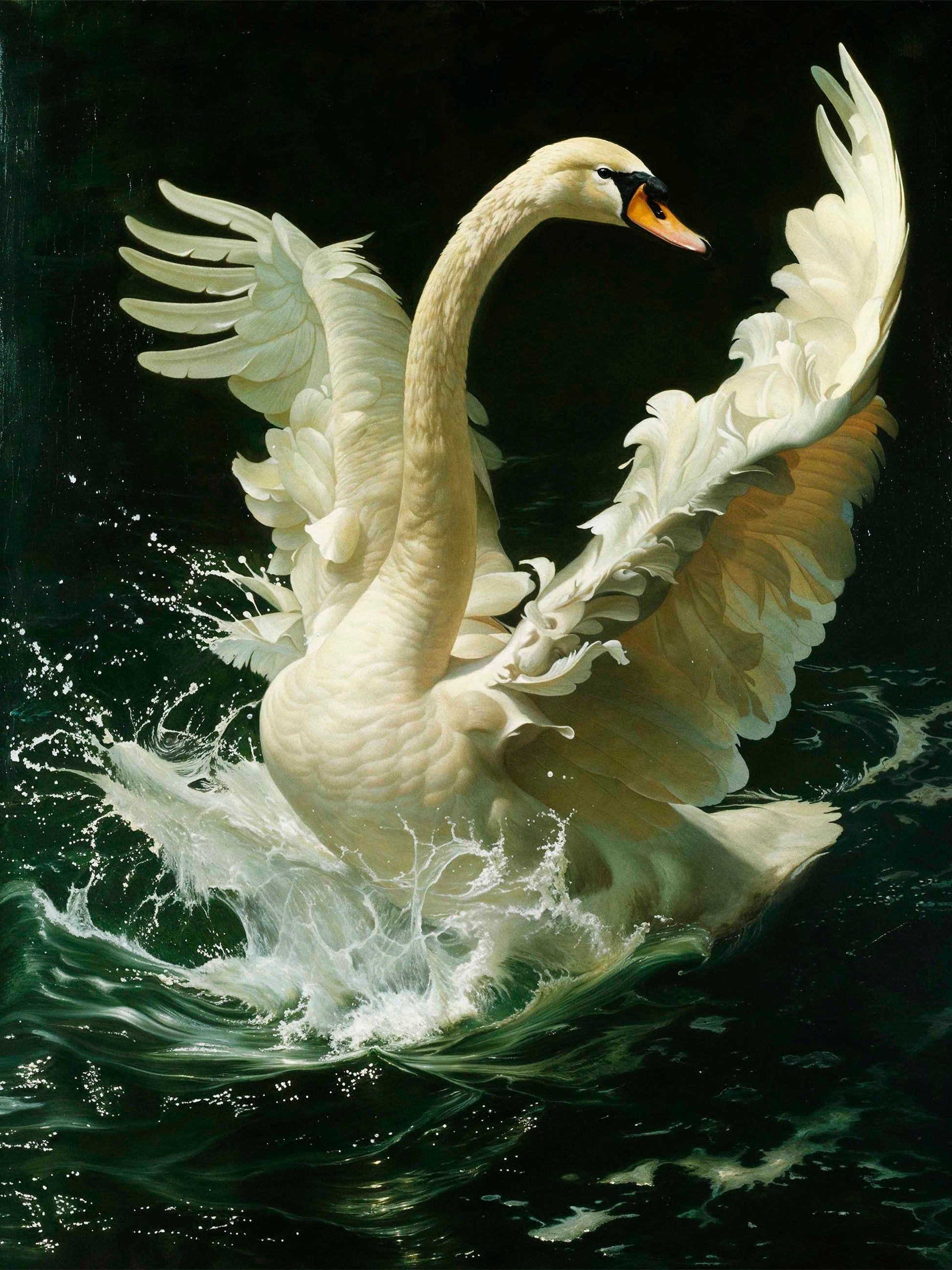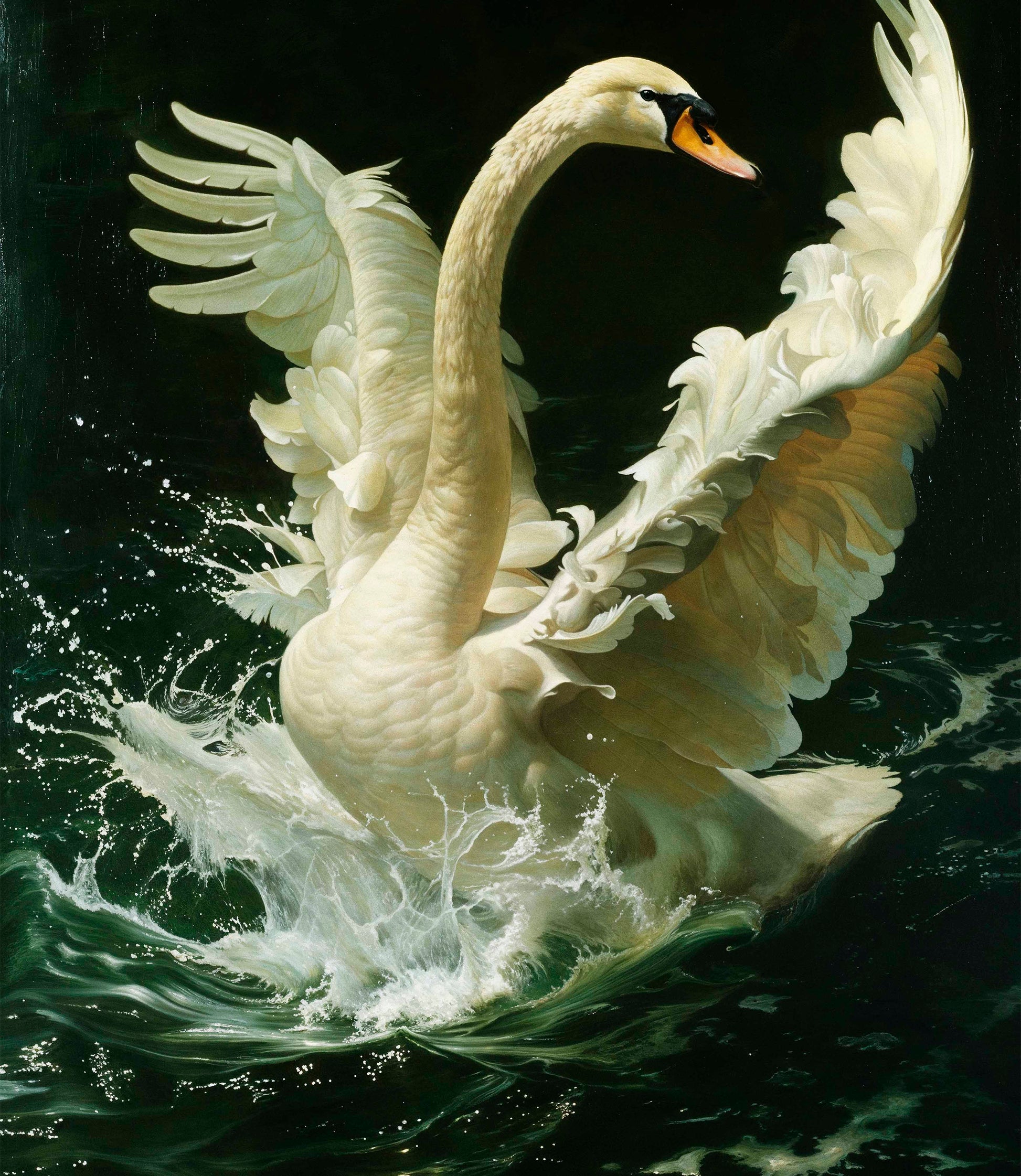 The artist's meticulous attention to detail is evident in the intricate rendering of the swan's feathers, each one delicately highlighted to capture the play of light and shadow. The dark, muted background serves to accentuate the brilliance of the swan's plumage, creating a dramatic contrast that draws the viewer's eye to the center of the composition. The dynamic motion of the water adds a sense of energy and life to the scene, enhancing the overall impact of the painting. Ethereal Majesty - Swan in Flight invites viewers to appreciate the serene beauty and dignified presence of the swan, celebrated through the lens of classical artistry.