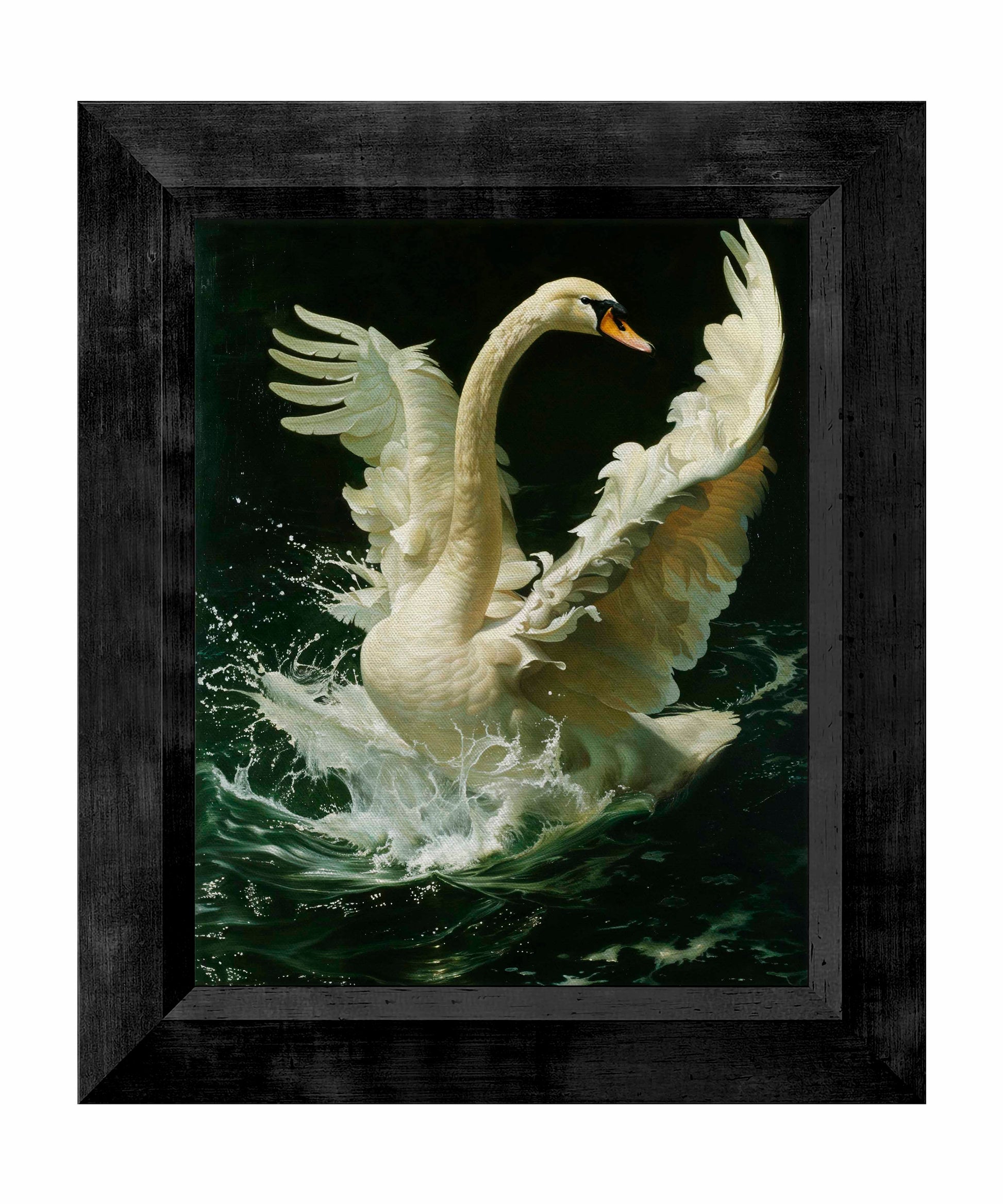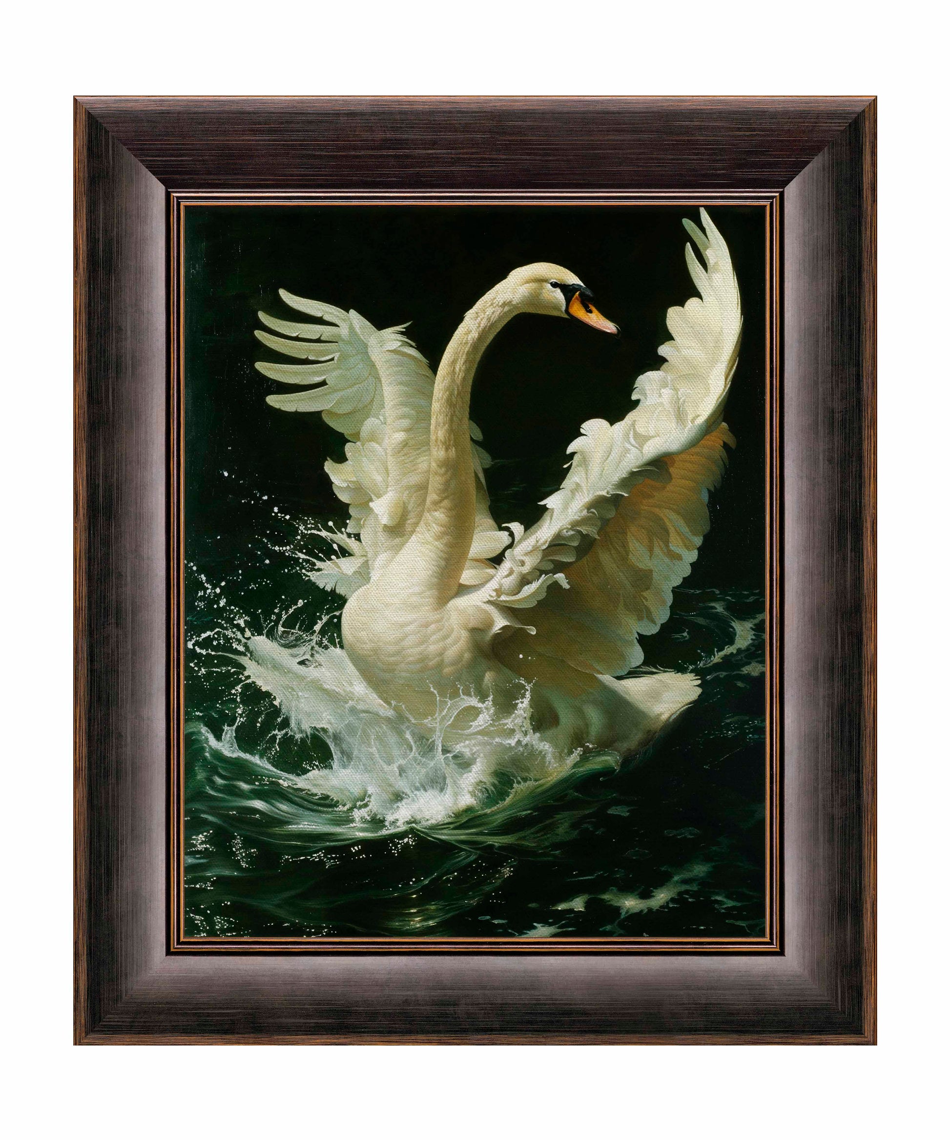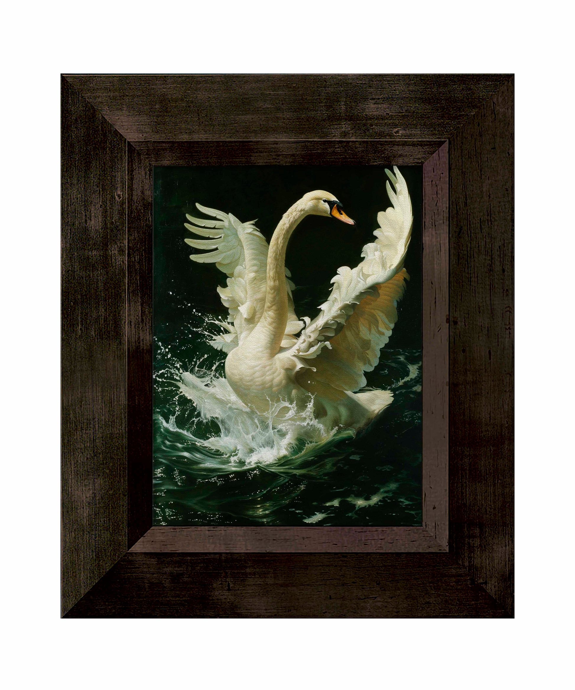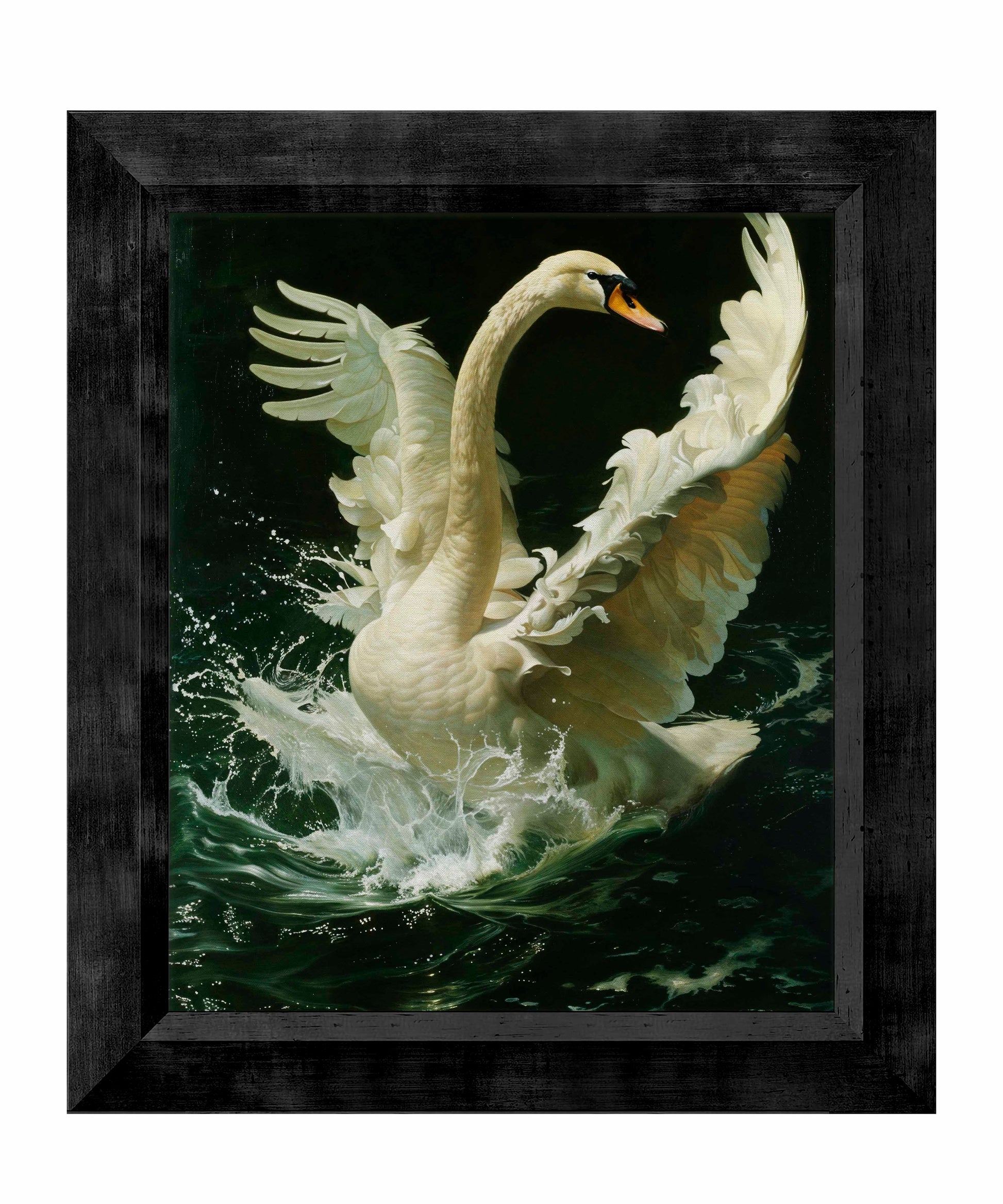 The artist's meticulous attention to detail is evident in the intricate rendering of the swan's feathers, each one delicately highlighted to capture the play of light and shadow. The dark, muted background serves to accentuate the brilliance of the swan's plumage, creating a dramatic contrast that draws the viewer's eye to the center of the composition. The dynamic motion of the water adds a sense of energy and life to the scene, enhancing the overall impact of the painting. Ethereal Majesty - Swan in Flight invites viewers to appreciate the serene beauty and dignified presence of the swan, celebrated through the lens of classical artistry.