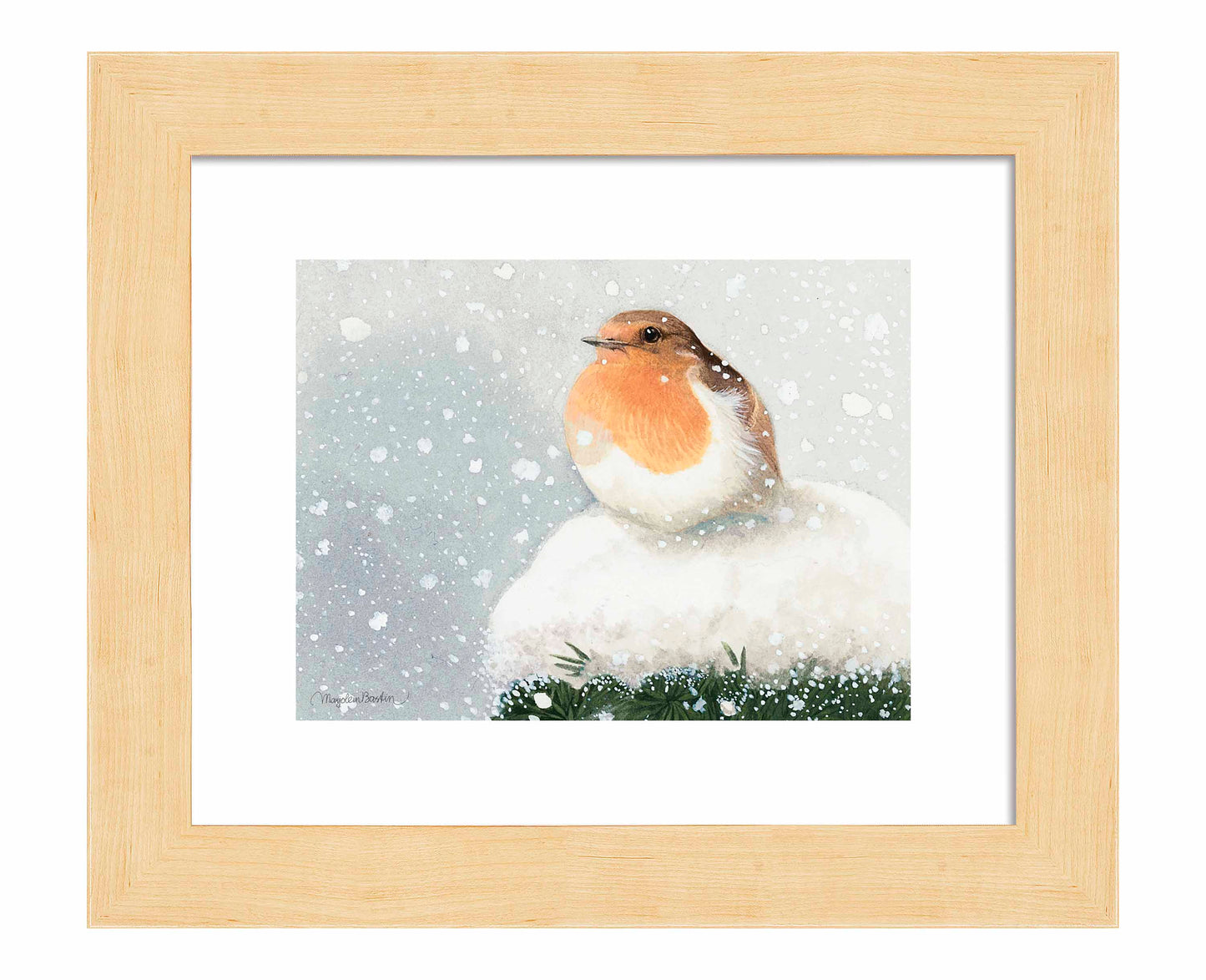 The sight of a European robin in my snow-covered garden makes me yearn for my brushes, I just love painting them! They are such delicate birds, yet so tough and seemingly unaffected by the cold weather. Feathers fluffed up, feet covered and its orange breast appears to keep him warm.