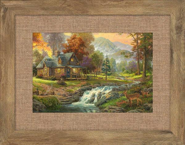 Framed, open edition art print by Thomas Kinkade. Framed with a 2" faux burlap mat and 2" rustic brown wood moulding. Image size: 10-1/2"H x 15-3/4"W. Framed size: 19"H x 23-1/2"W