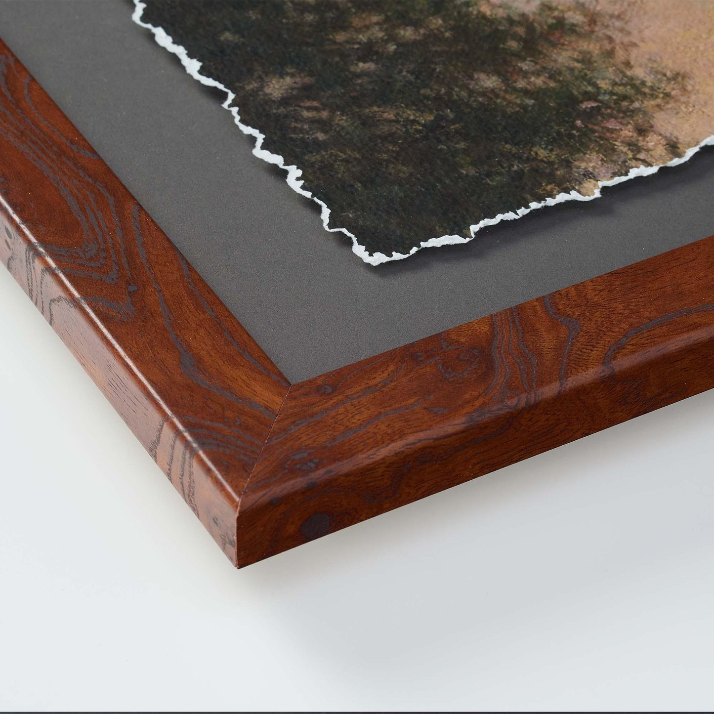 Our Deckled Edge paper prints have a hand-torn paper edge and appear to "float" above the mat. The image is giclee printed using our fade-resistant inks for the highest print quality. They are framed in a simple, contemporary style with a one-inch moulding of burl or charcoal along with a choice of gray or white matting. The frames have a slight texture, giving them that real wood or stone feel. Image Size, 12"W x 14"H. Framed Size, 18"W x 20"H. Glass front surface for easy cleaning and dust protection. Includes a Certificate of Authenticity with a tamper-proof holographic seal. Printed and framed in the North America. Published by Wild Wings® a division of Art Brand Studios, LLC.