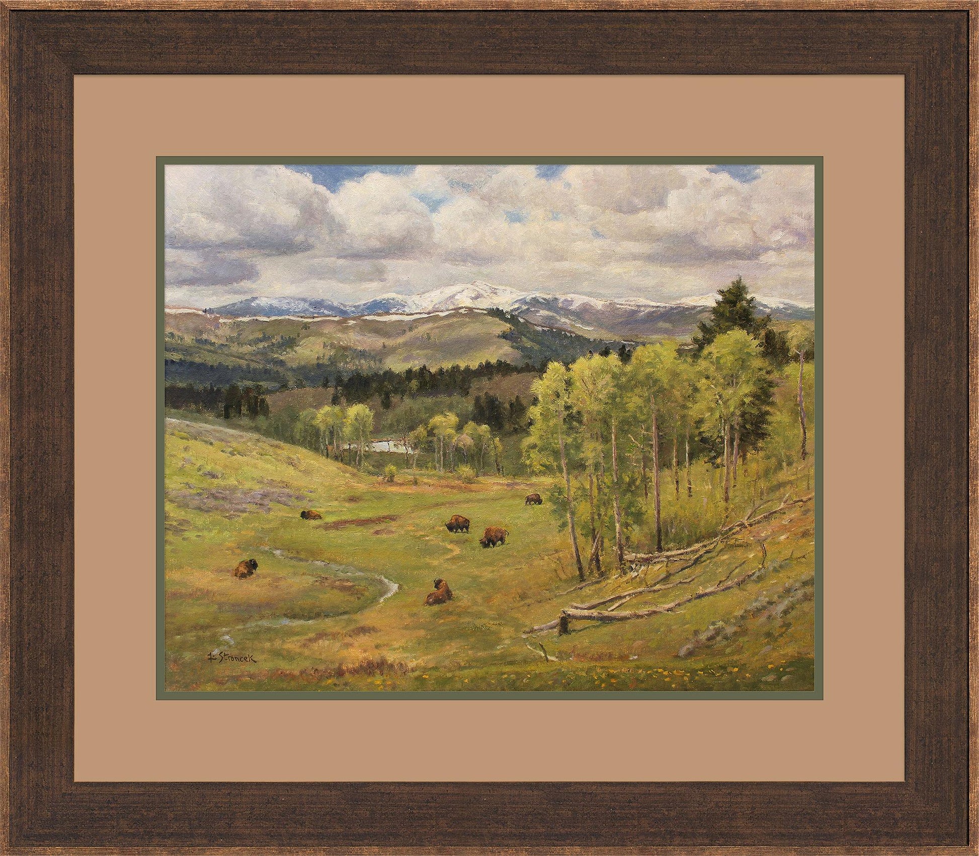 This painting was done based on my hikes to one of my treasured secret places in Yellowstone Park. It is the kind of view that inspires religions. There are usually a few bison in the meadows and perhaps a bear.