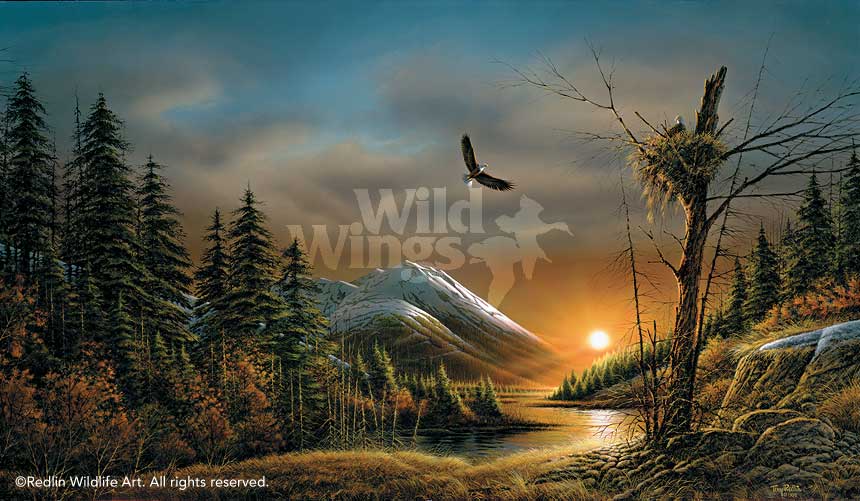 In the Flying Free painting, we see “Terry Redlin’s first painting of the American Bald Eagle, we see not the traditional format of a solitary bird, but a family high in the western mountains building toward its own bright future.” An original piece by one the country’s most celebrated wildlife artists, Terry Redlin, this painting perfectly captures the majesty of the wilderness - bold mountains, crystal clear waters and lush forestry. The Flying Free painting encapsulates what makes our country great - unrivaled beauty and a free spirit!