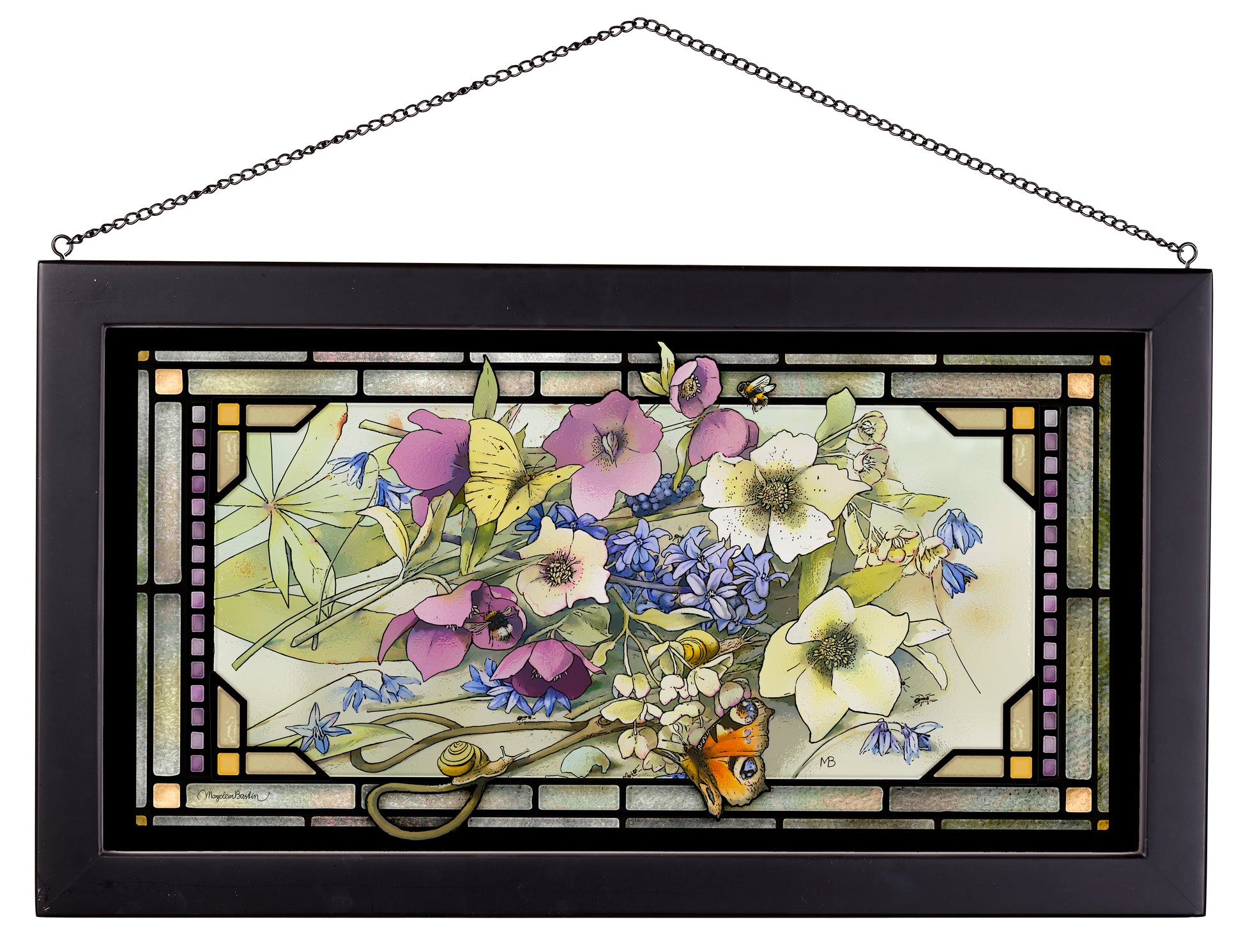 Let the light shine! Stained glass art hangings show their true colors when back-lit with natural sunlight. Popular designs are printed with fade resistant inks on 11" x 21" glass, framed with 1" black-finished moulding. Framed size 13" x 23". Ready to hang with provided chain. Designed, printed, and assembled in North America.