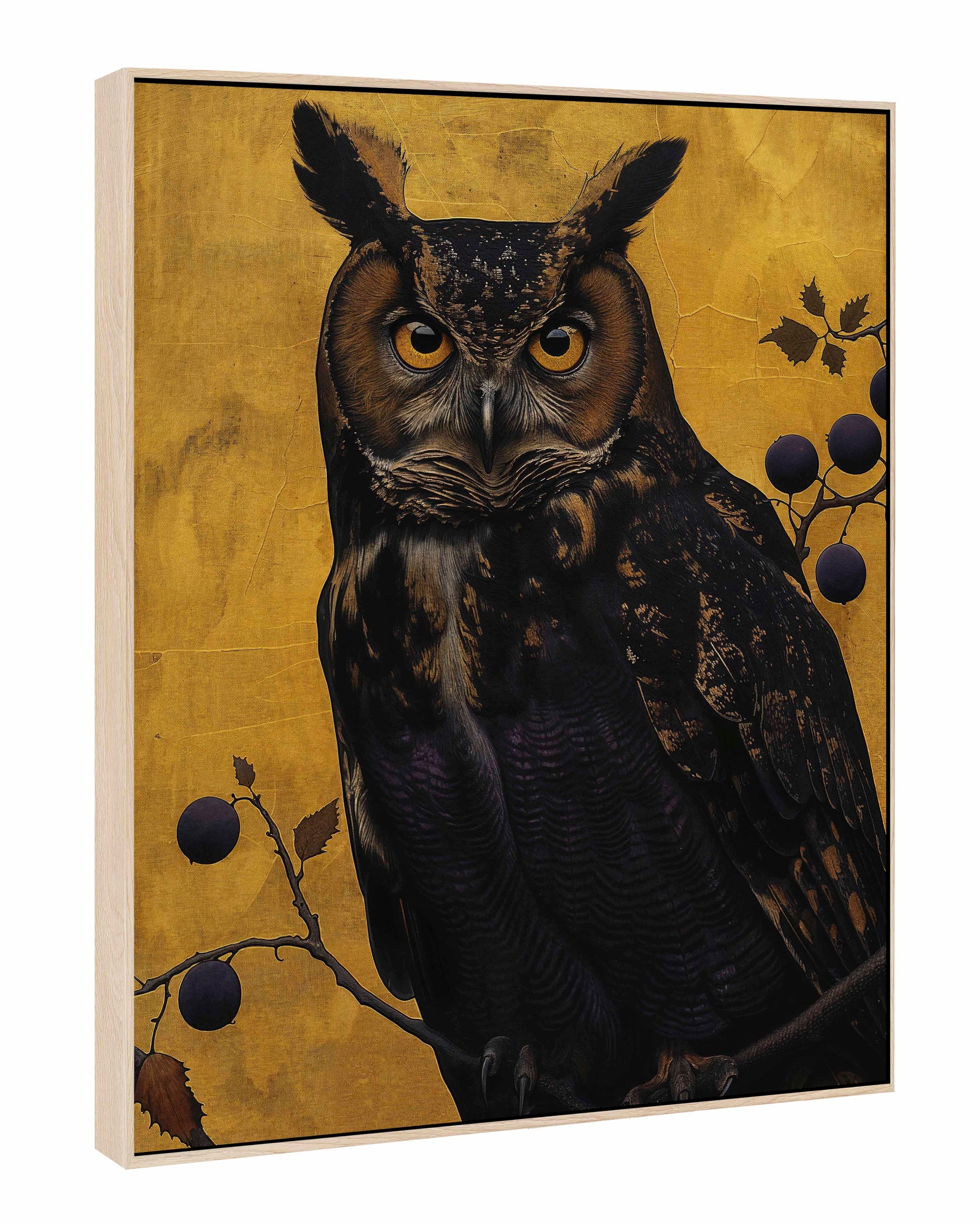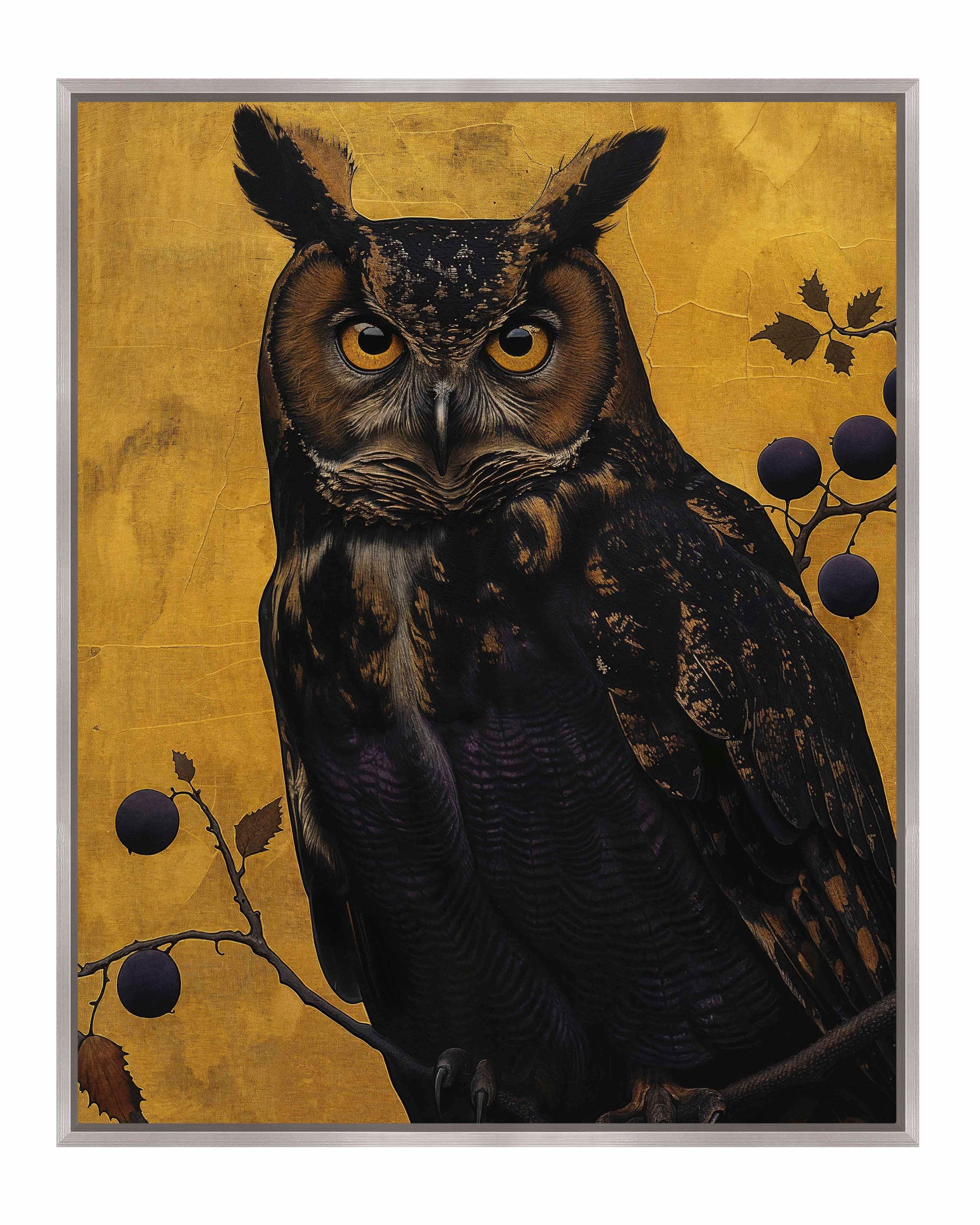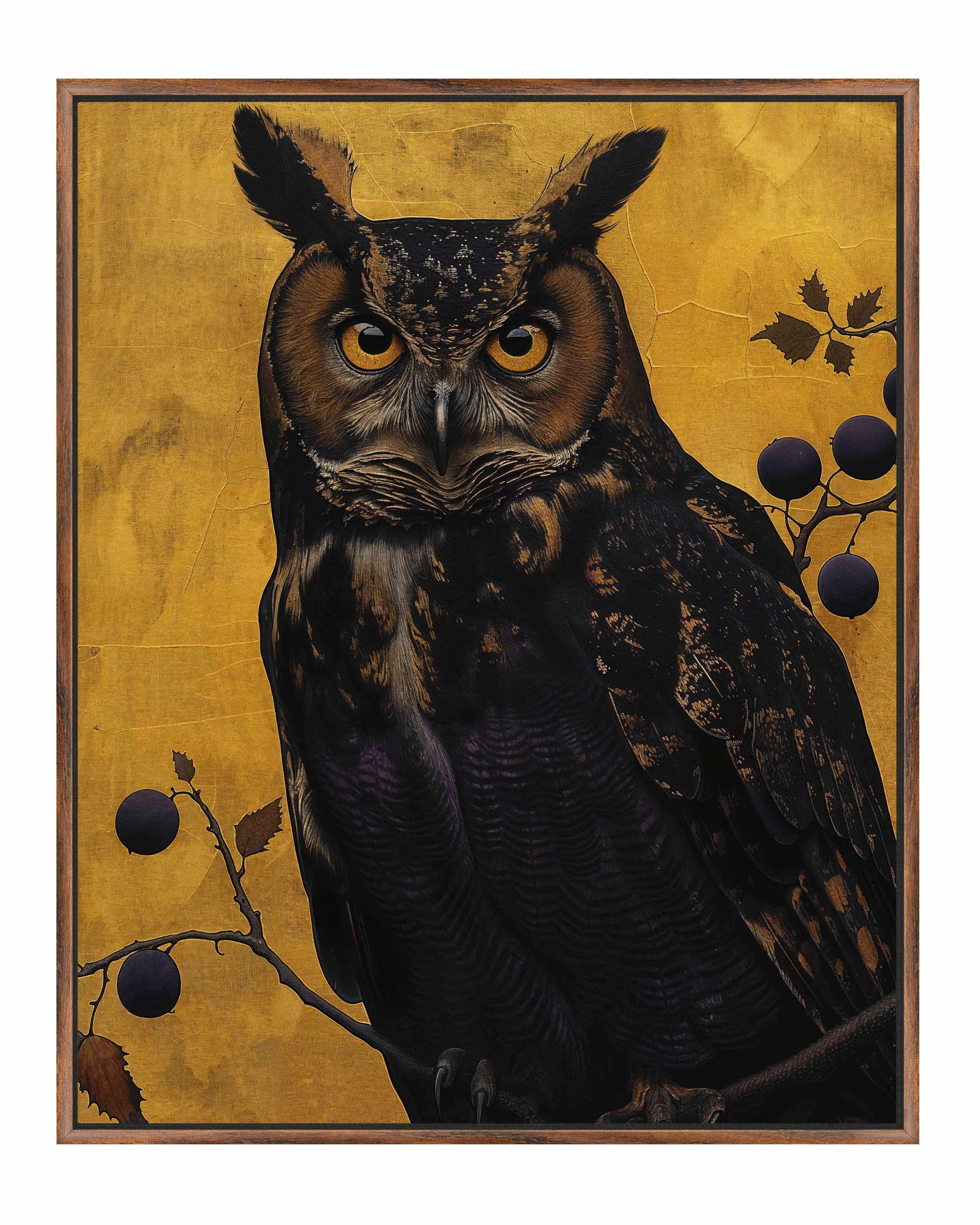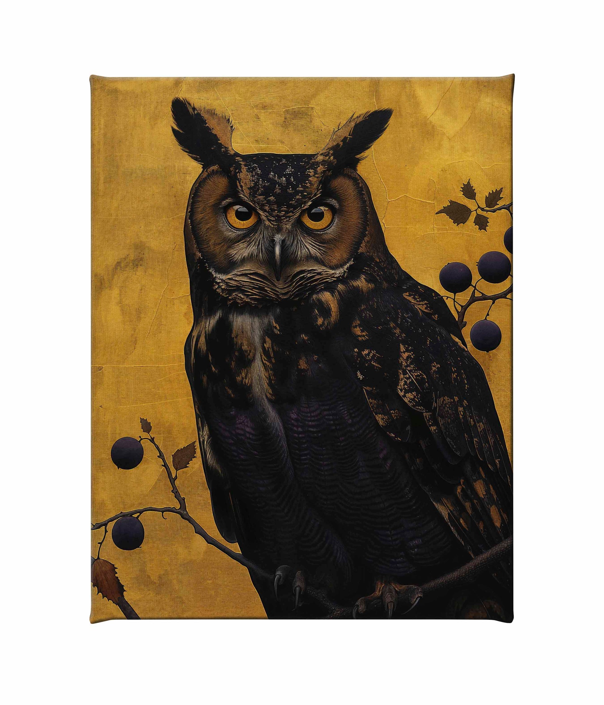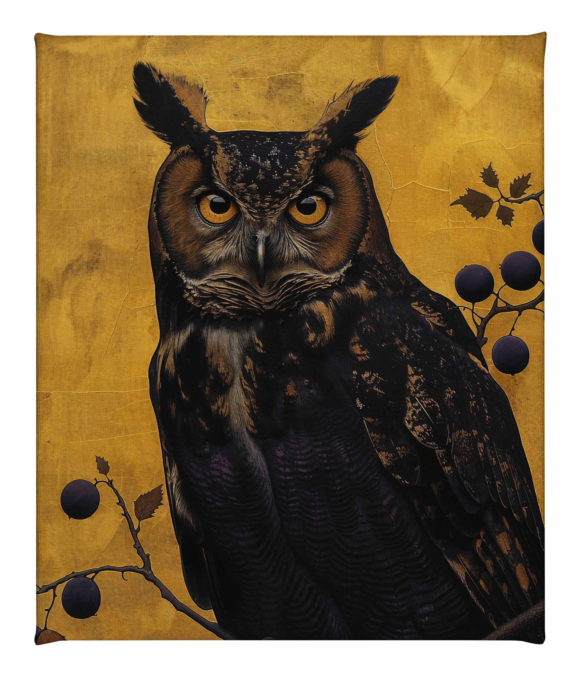 Golden Gaze - Great Horned Owl Among Berries is a captivating masterpiece that combines the majestic presence of the great horned owl with the rich, textured backdrop of golden hues. This painting features a vigilant great horned owl perched amidst a delicate arrangement of branches adorned with dark berries. The owl's intense, piercing eyes and intricate feather patterns are rendered with remarkable detail, creating a striking focal point that draws the viewer in.