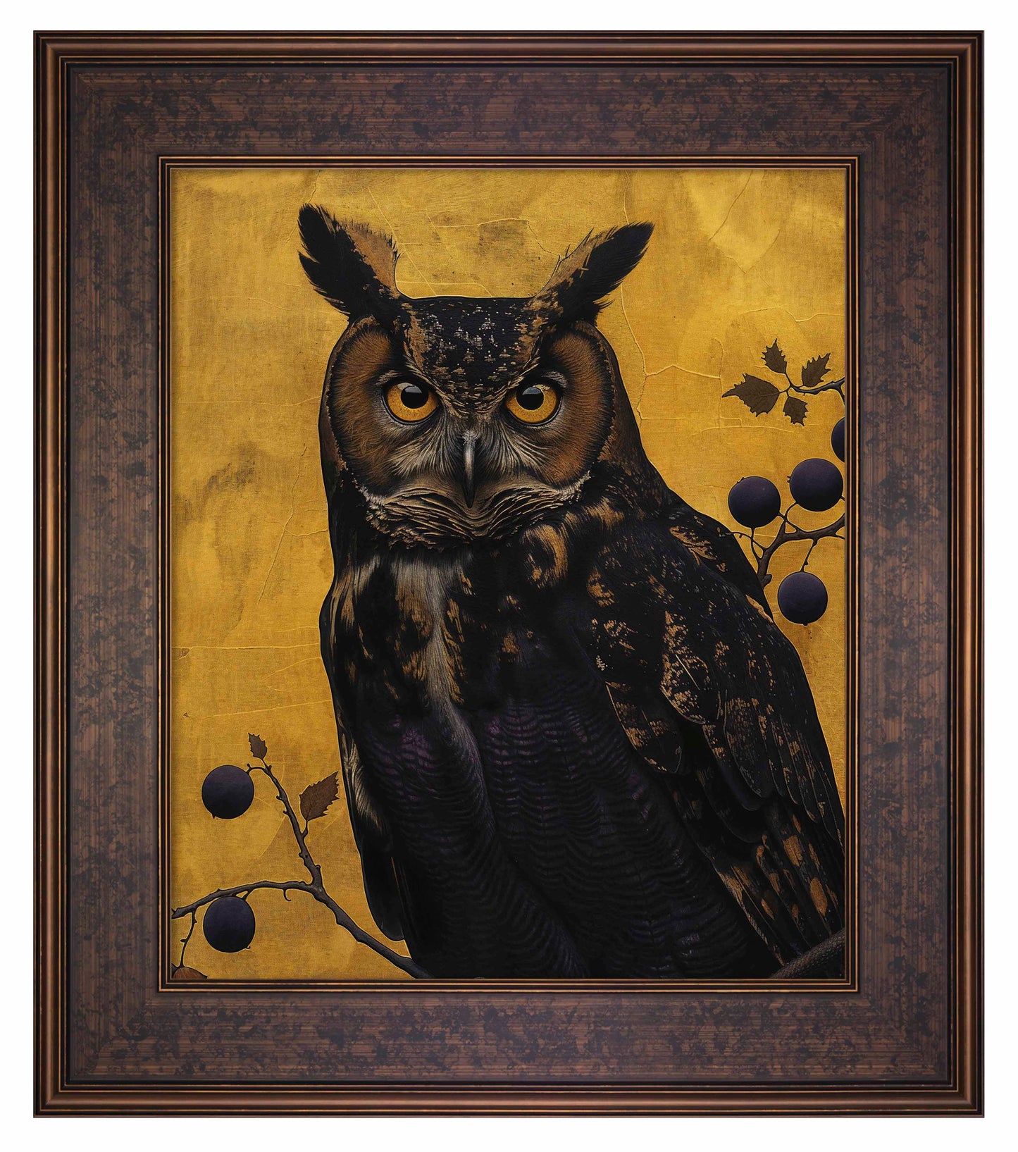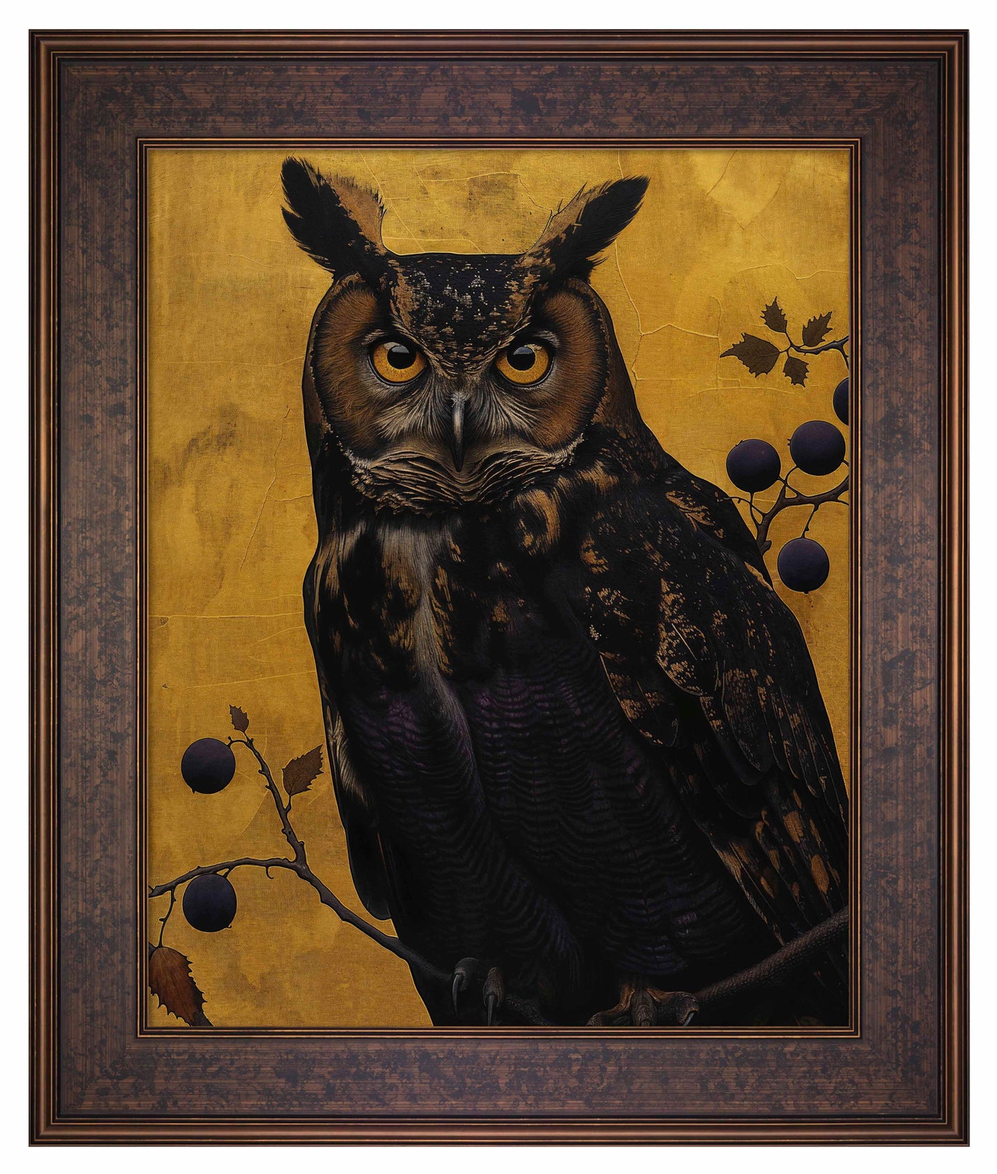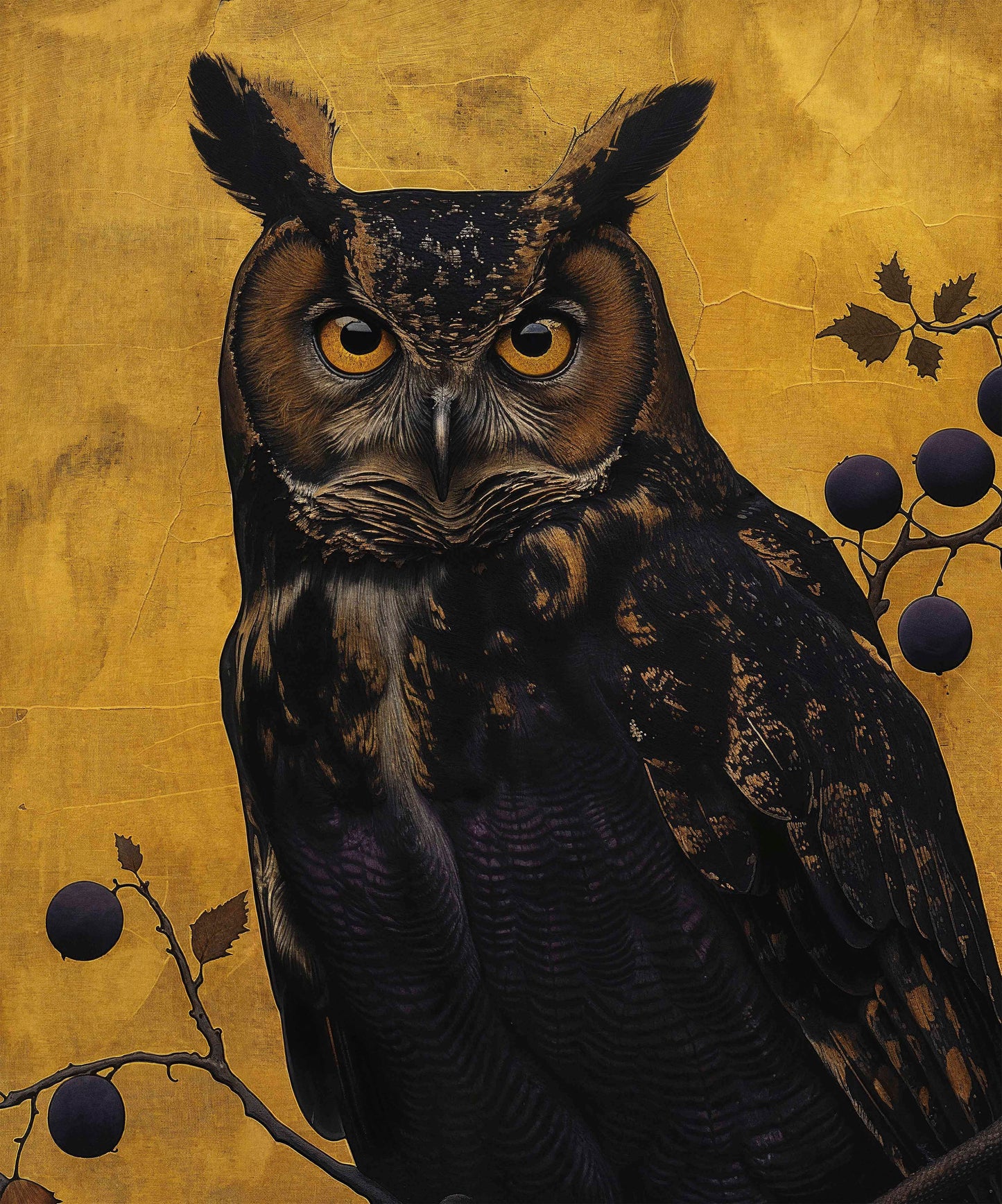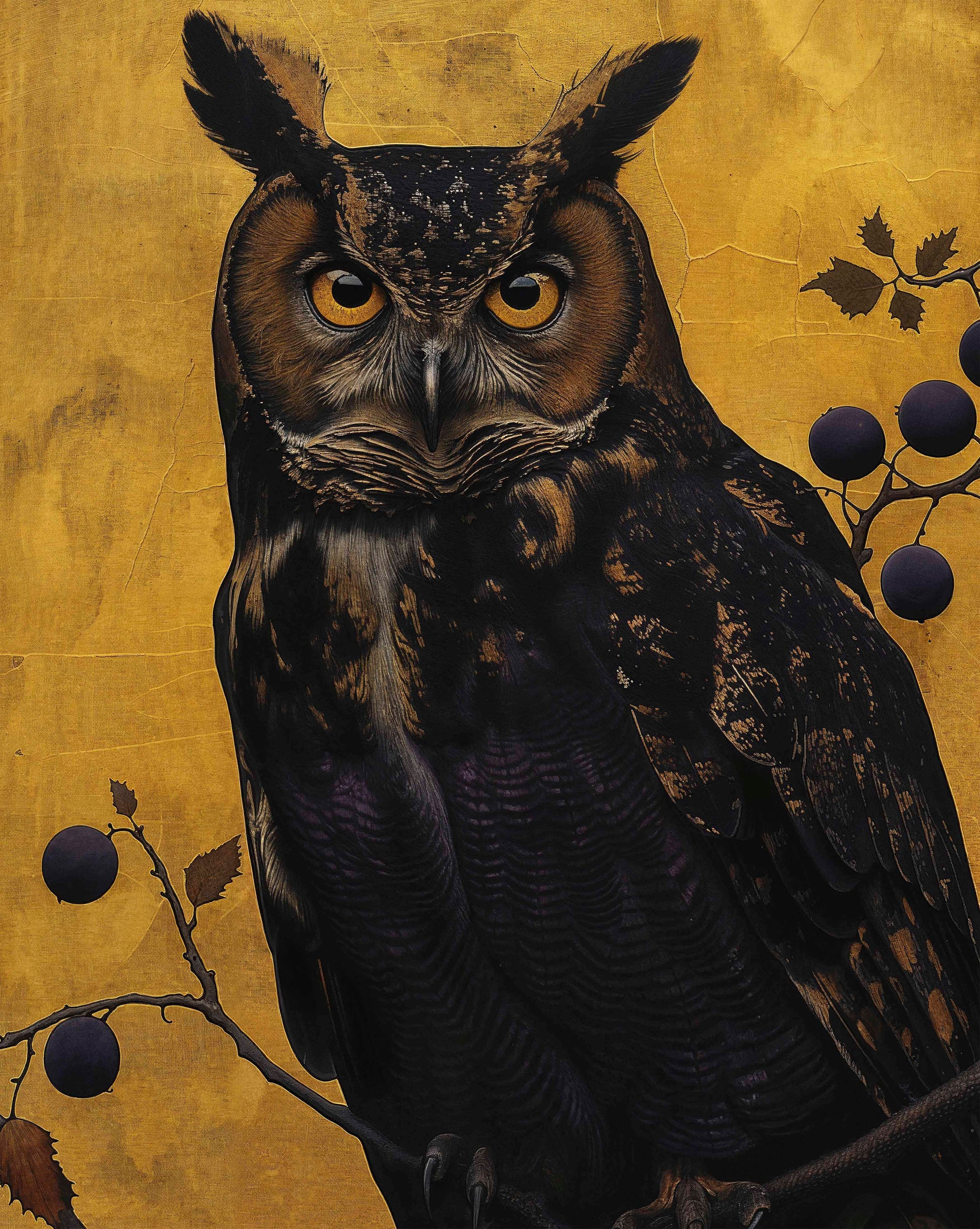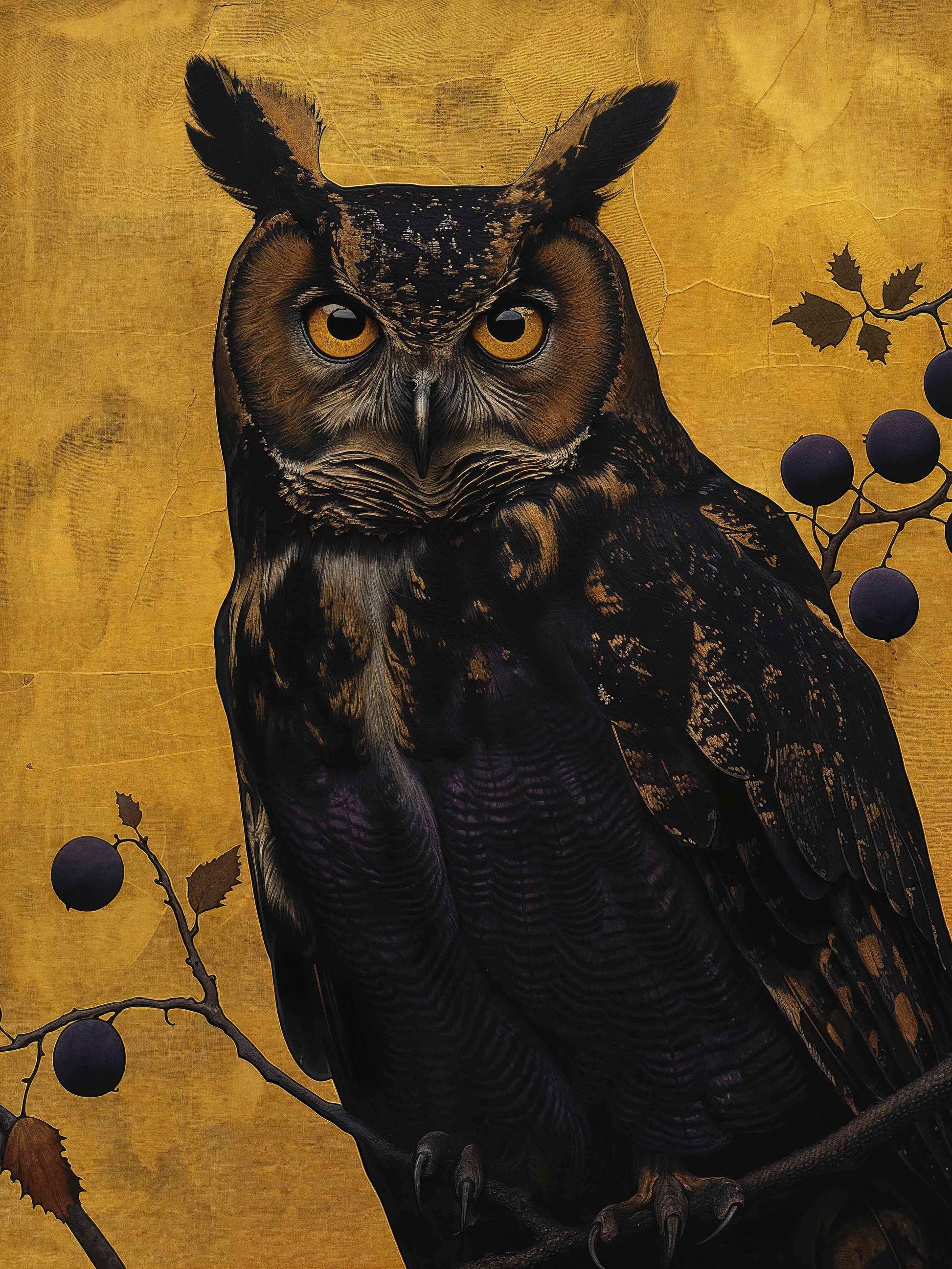 Golden Gaze - Great Horned Owl Among Berries is a captivating masterpiece that combines the majestic presence of the great horned owl with the rich, textured backdrop of golden hues. This painting features a vigilant great horned owl perched amidst a delicate arrangement of branches adorned with dark berries. The owl's intense, piercing eyes and intricate feather patterns are rendered with remarkable detail, creating a striking focal point that draws the viewer in.