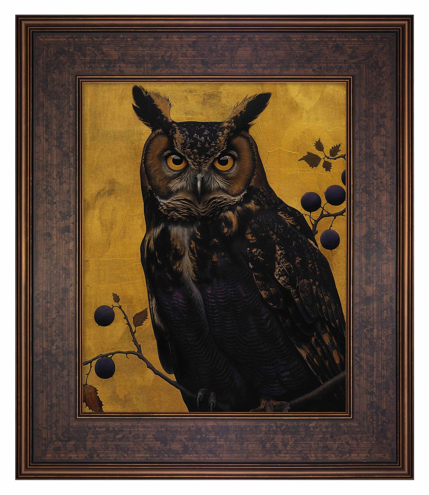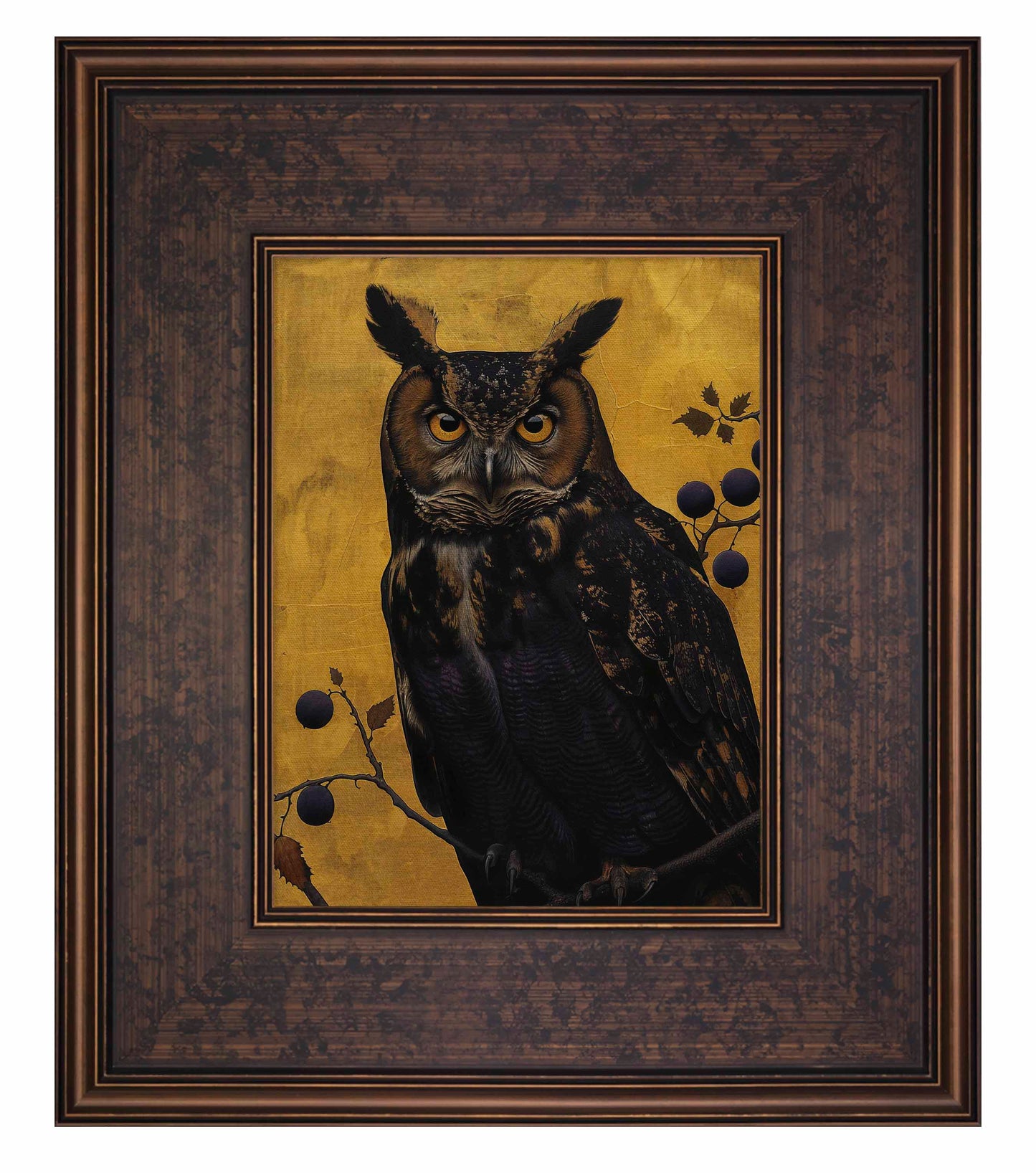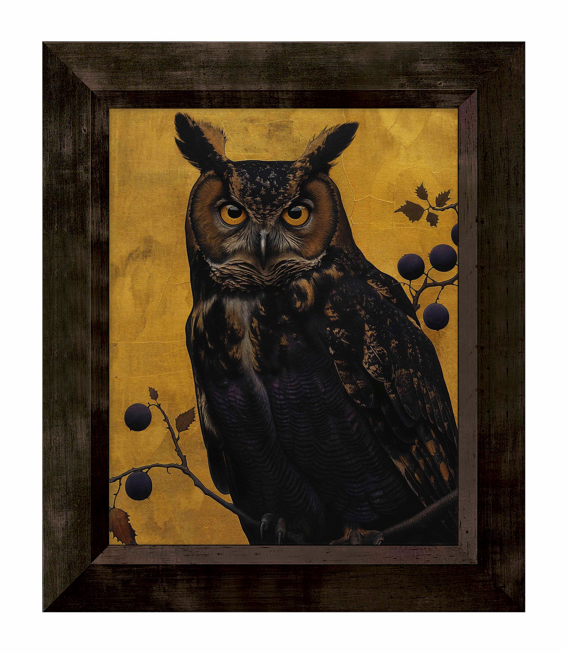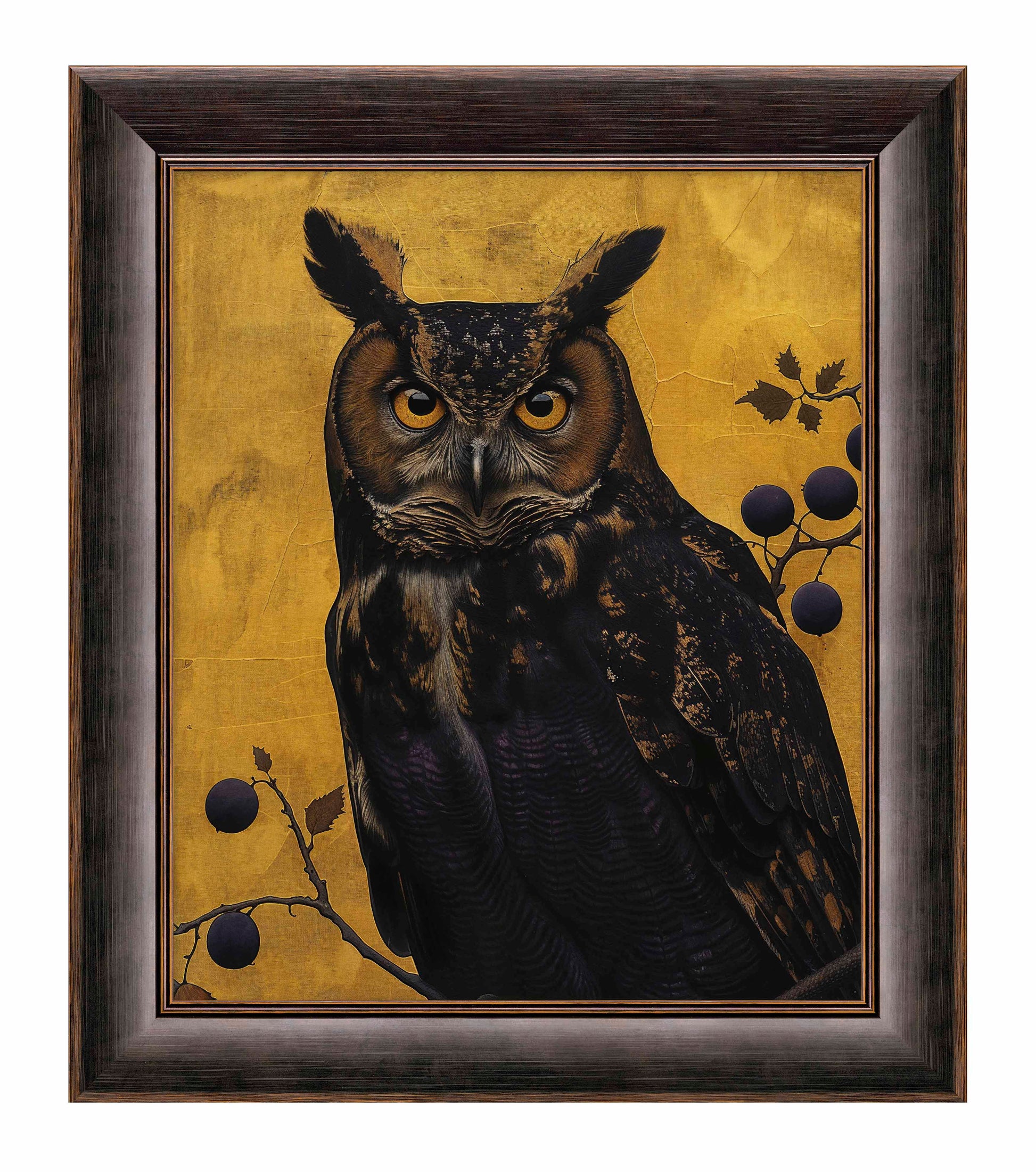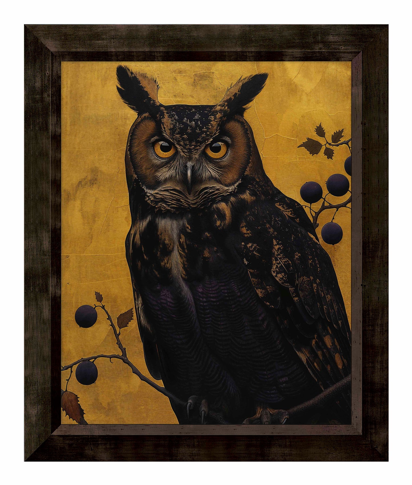 Golden Gaze - Great Horned Owl Among Berries is a captivating masterpiece that combines the majestic presence of the great horned owl with the rich, textured backdrop of golden hues. This painting features a vigilant great horned owl perched amidst a delicate arrangement of branches adorned with dark berries. The owl's intense, piercing eyes and intricate feather patterns are rendered with remarkable detail, creating a striking focal point that draws the viewer in.