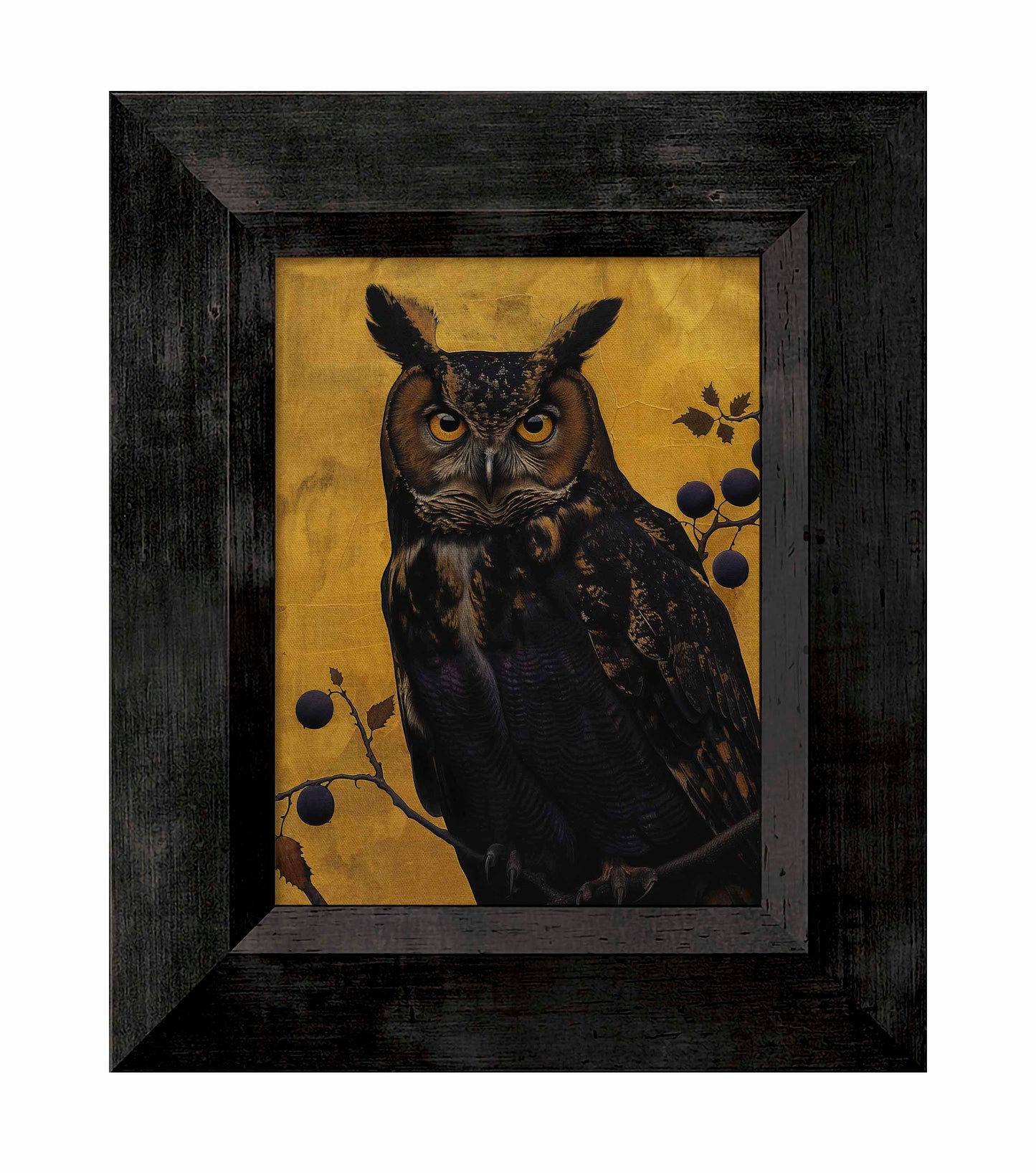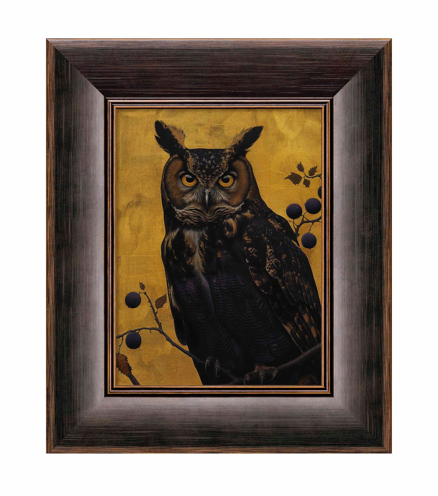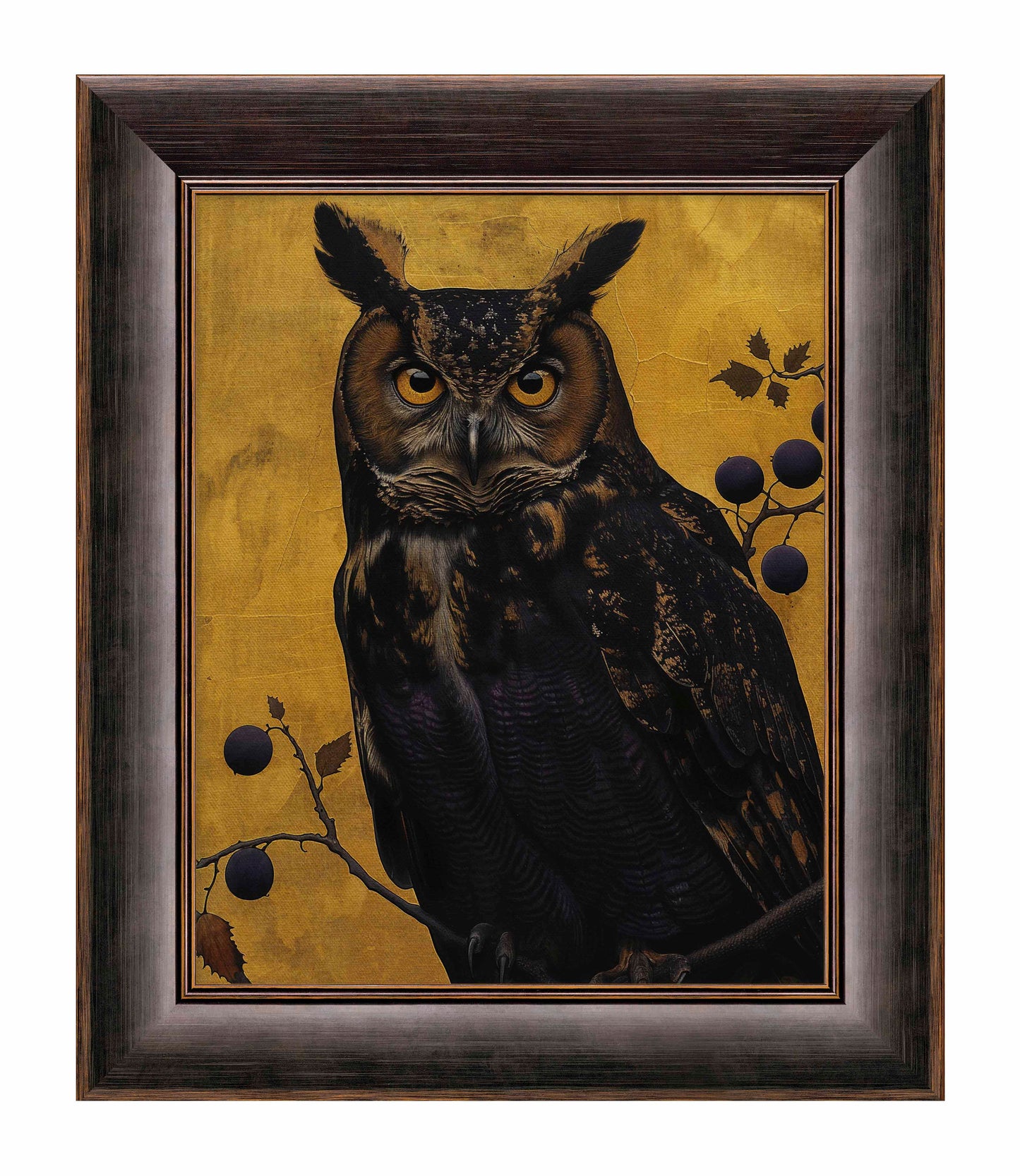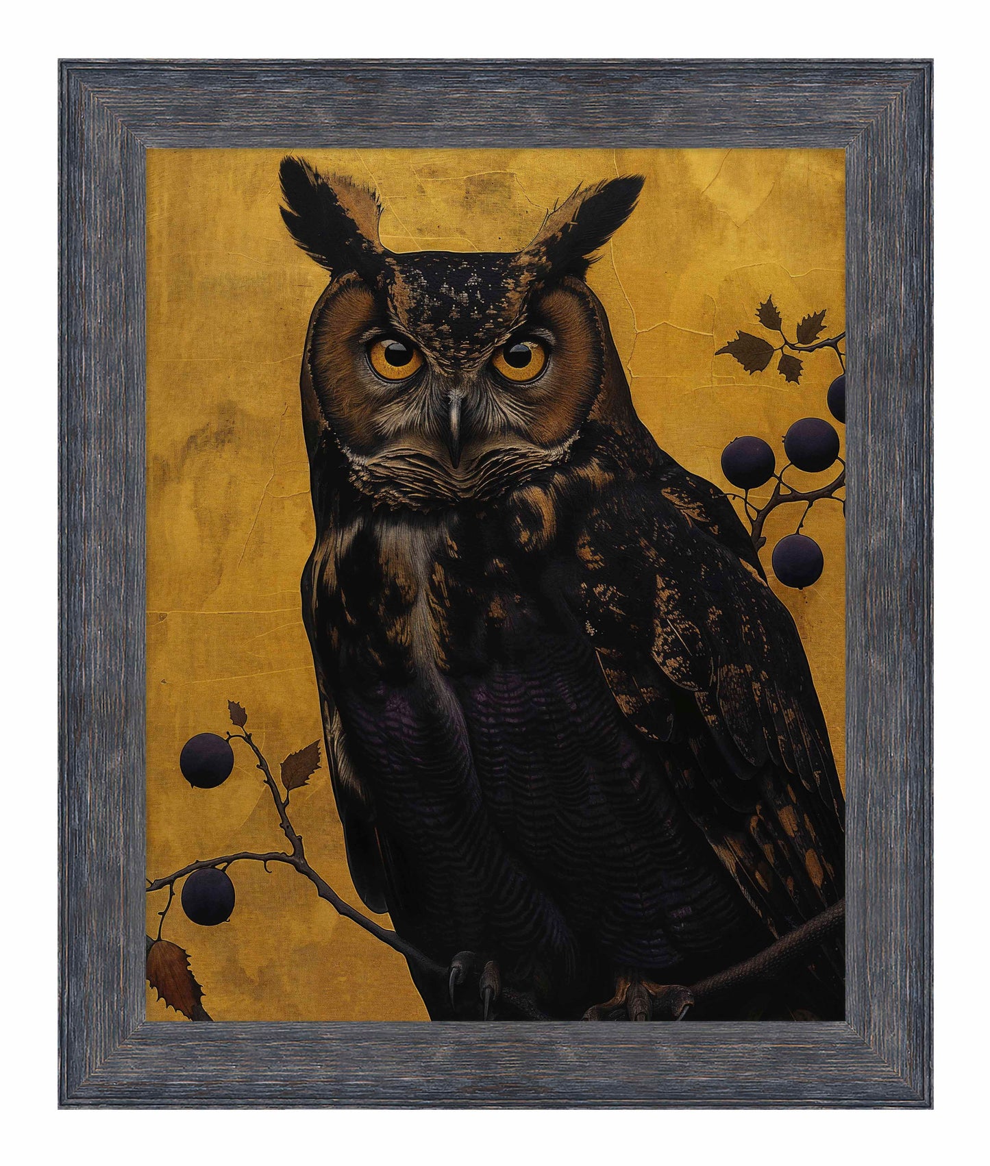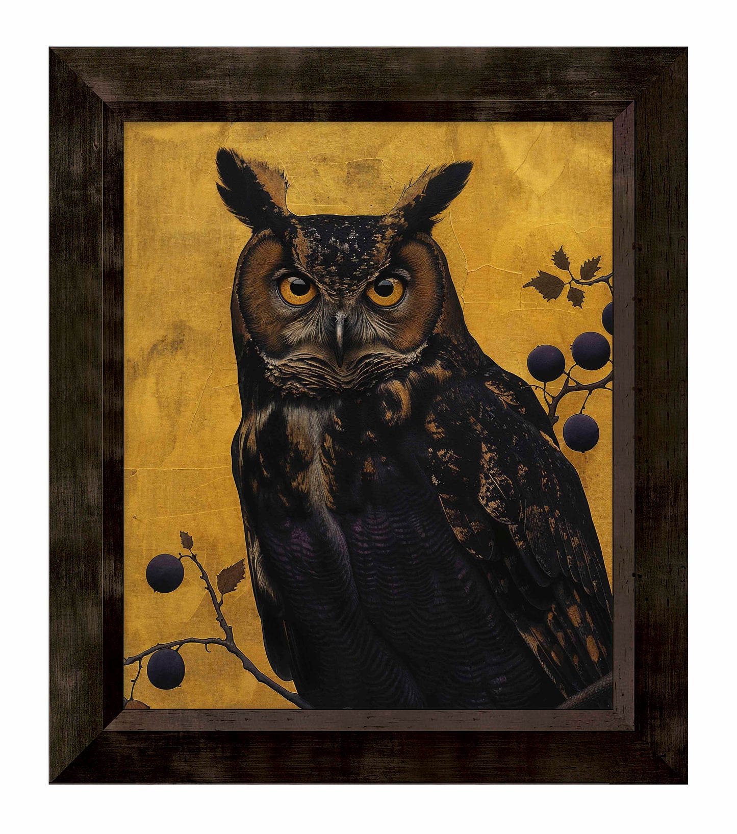 Golden Gaze - Great Horned Owl Among Berries is a captivating masterpiece that combines the majestic presence of the great horned owl with the rich, textured backdrop of golden hues. This painting features a vigilant great horned owl perched amidst a delicate arrangement of branches adorned with dark berries. The owl's intense, piercing eyes and intricate feather patterns are rendered with remarkable detail, creating a striking focal point that draws the viewer in.