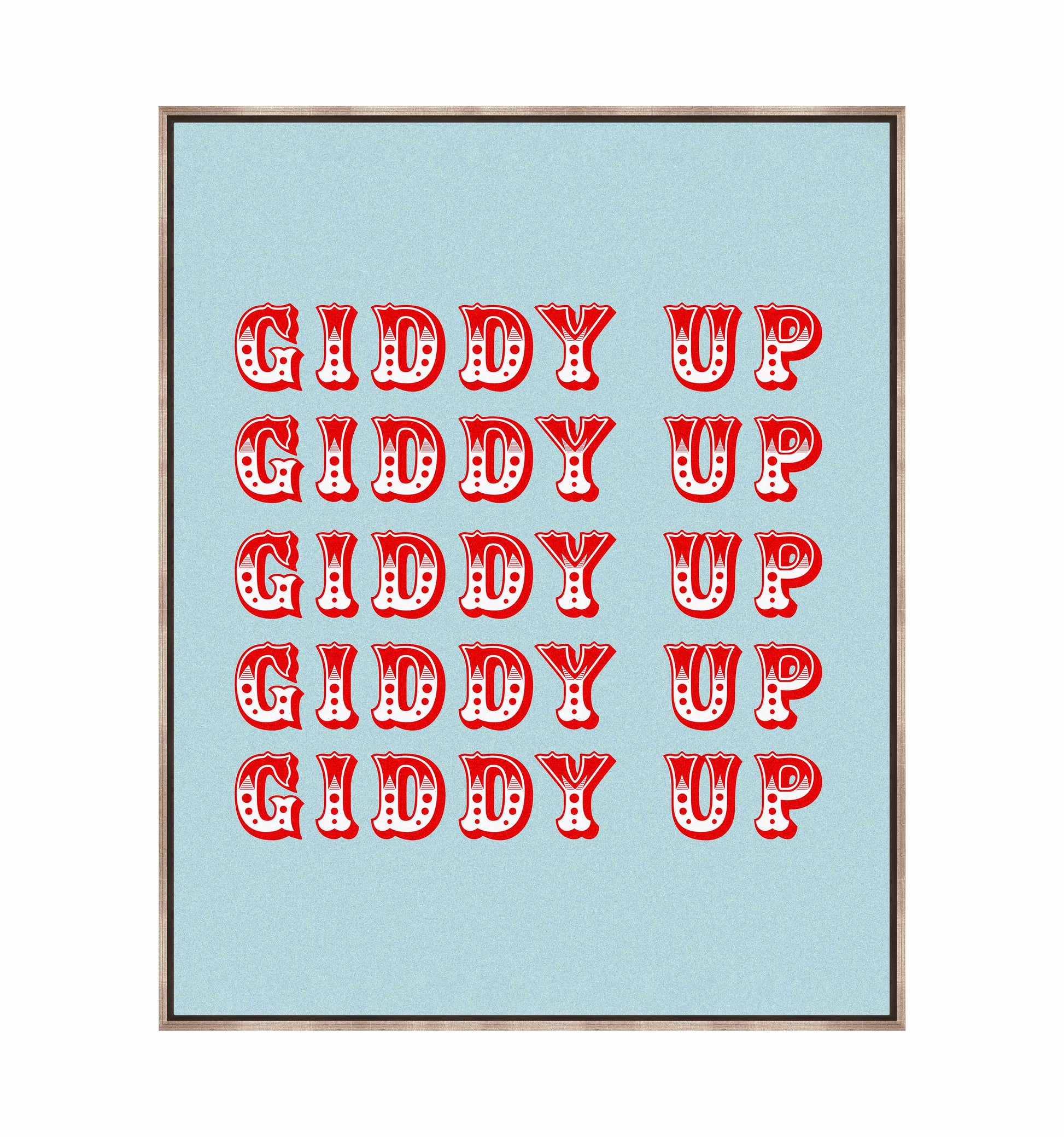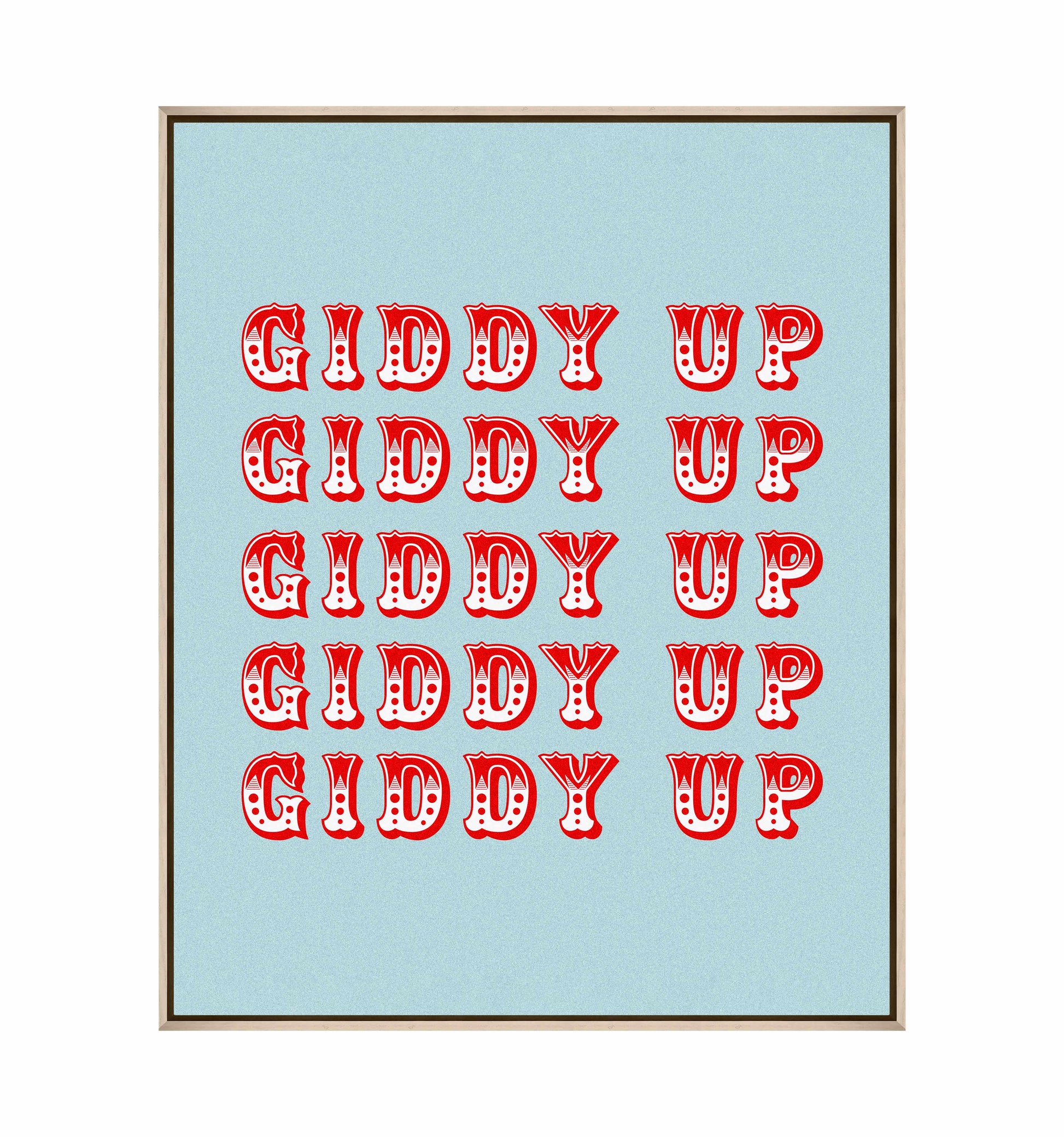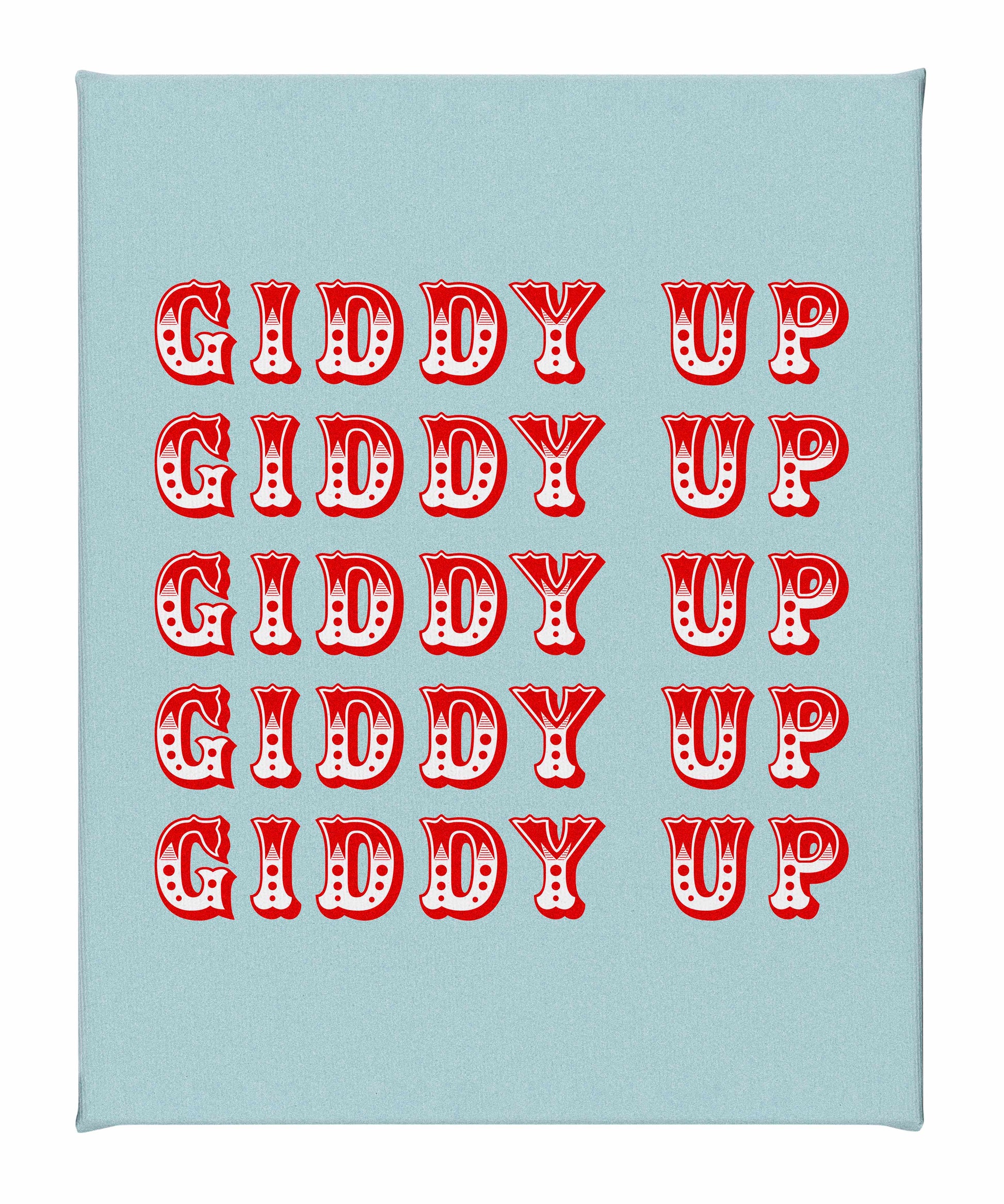 The repetition of the text creates a rhythmic visual pattern, reinforcing the feeling of action and forward momentum—much like the call to "giddy up" in the context of riding horses. Set against a cool, pale blue background, the red typography pops off the canvas, drawing the viewer’s eye in and radiating enthusiasm. The retro, almost carnival-style lettering adds a fun, nostalgic vibe, making the work both visually engaging and lighthearted.