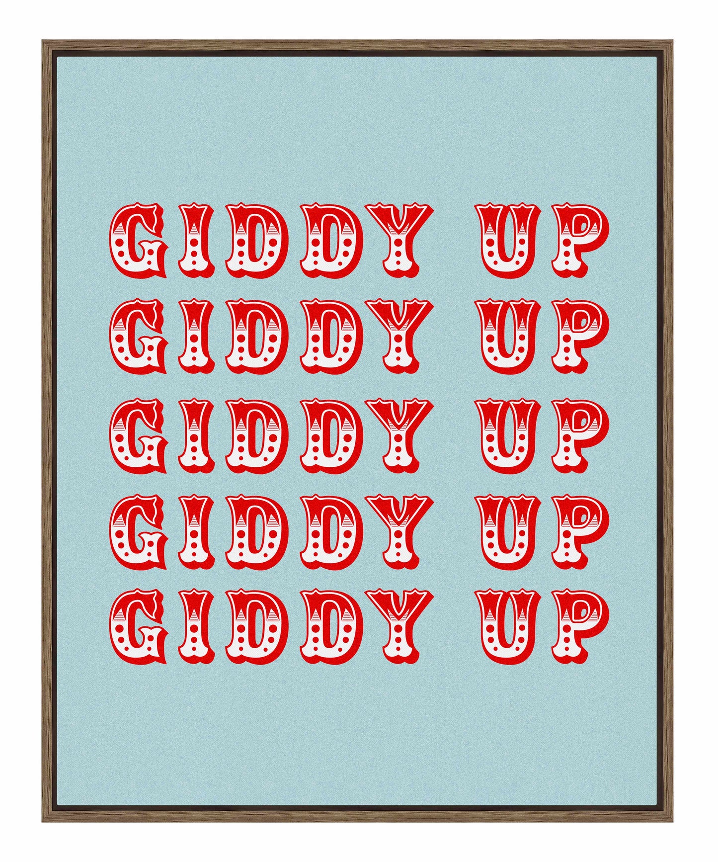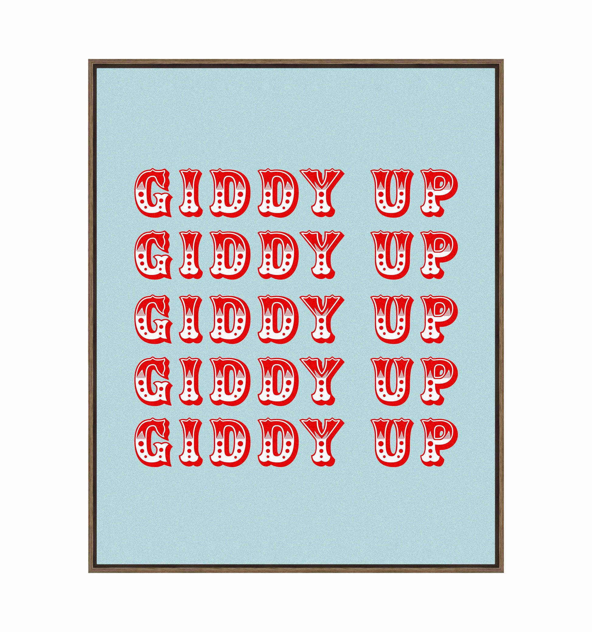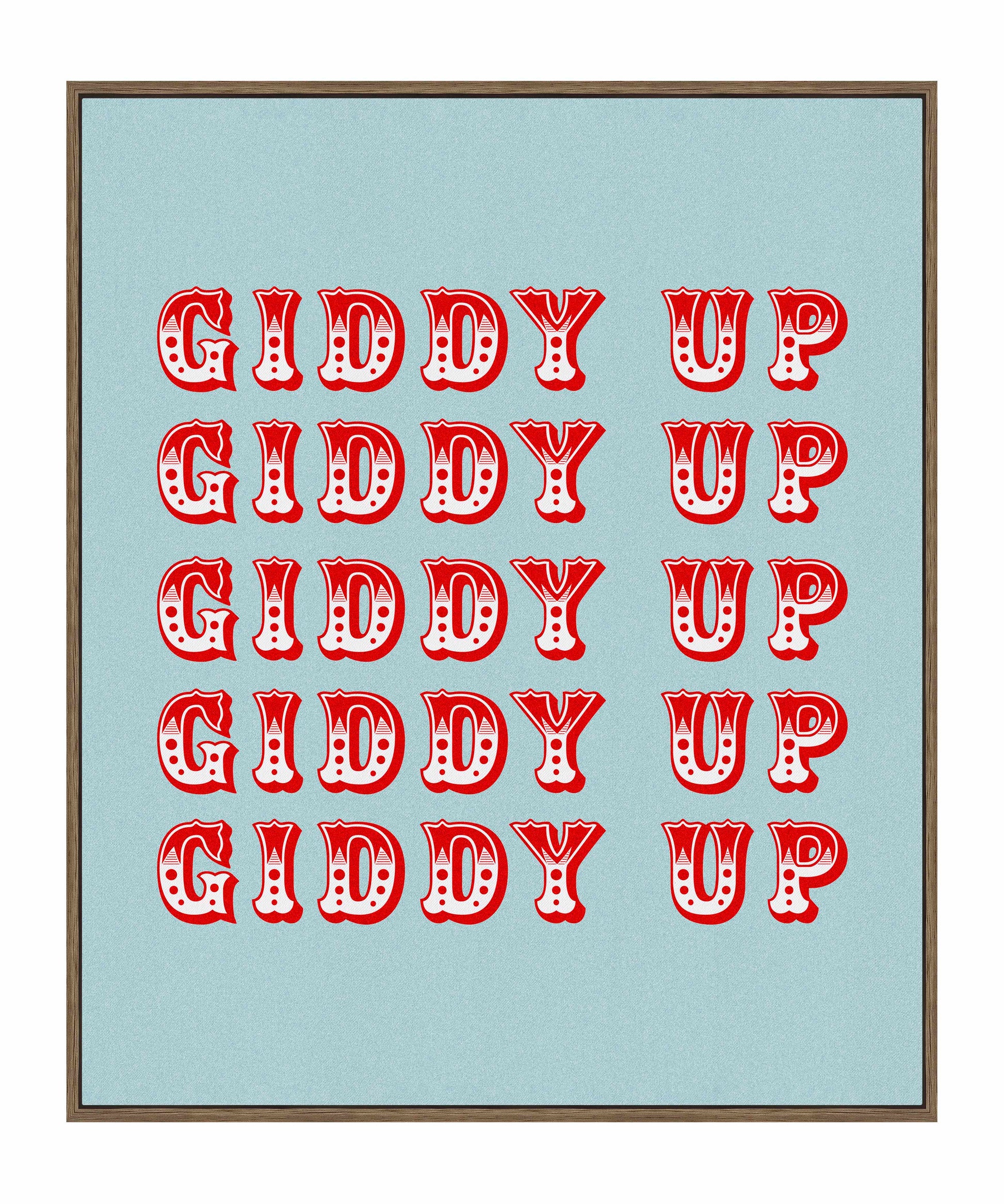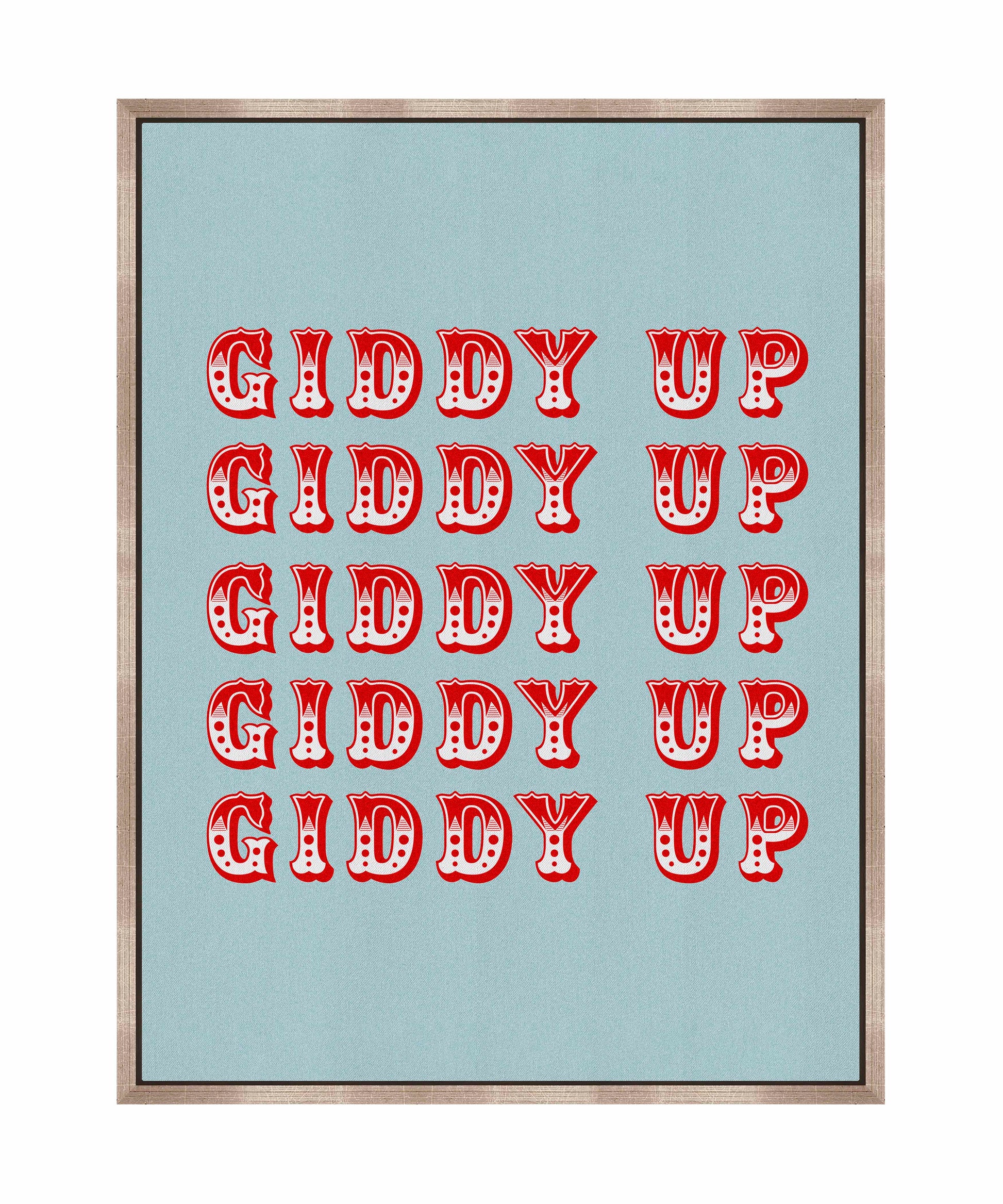 The repetition of the text creates a rhythmic visual pattern, reinforcing the feeling of action and forward momentum—much like the call to "giddy up" in the context of riding horses. Set against a cool, pale blue background, the red typography pops off the canvas, drawing the viewer’s eye in and radiating enthusiasm. The retro, almost carnival-style lettering adds a fun, nostalgic vibe, making the work both visually engaging and lighthearted.