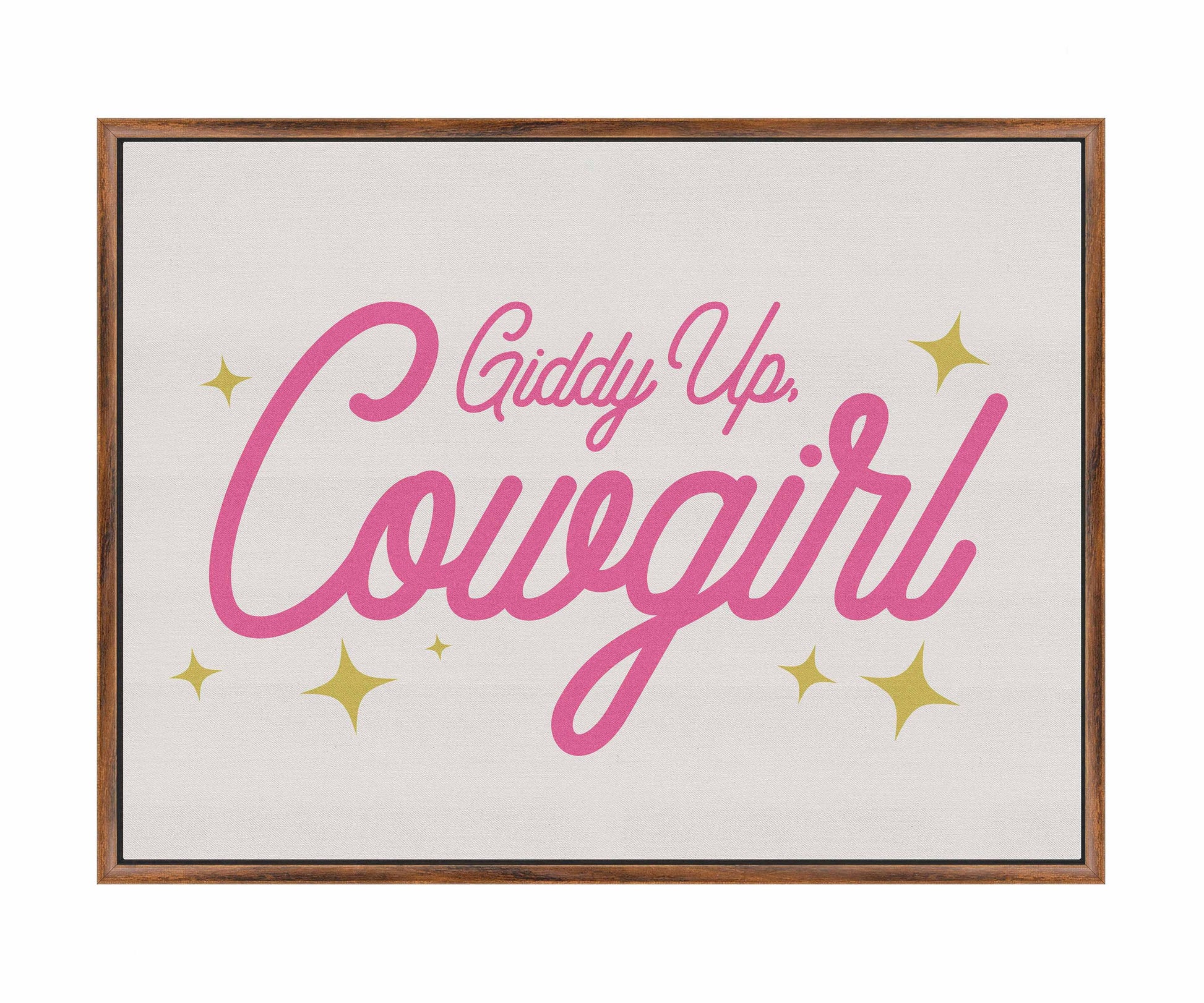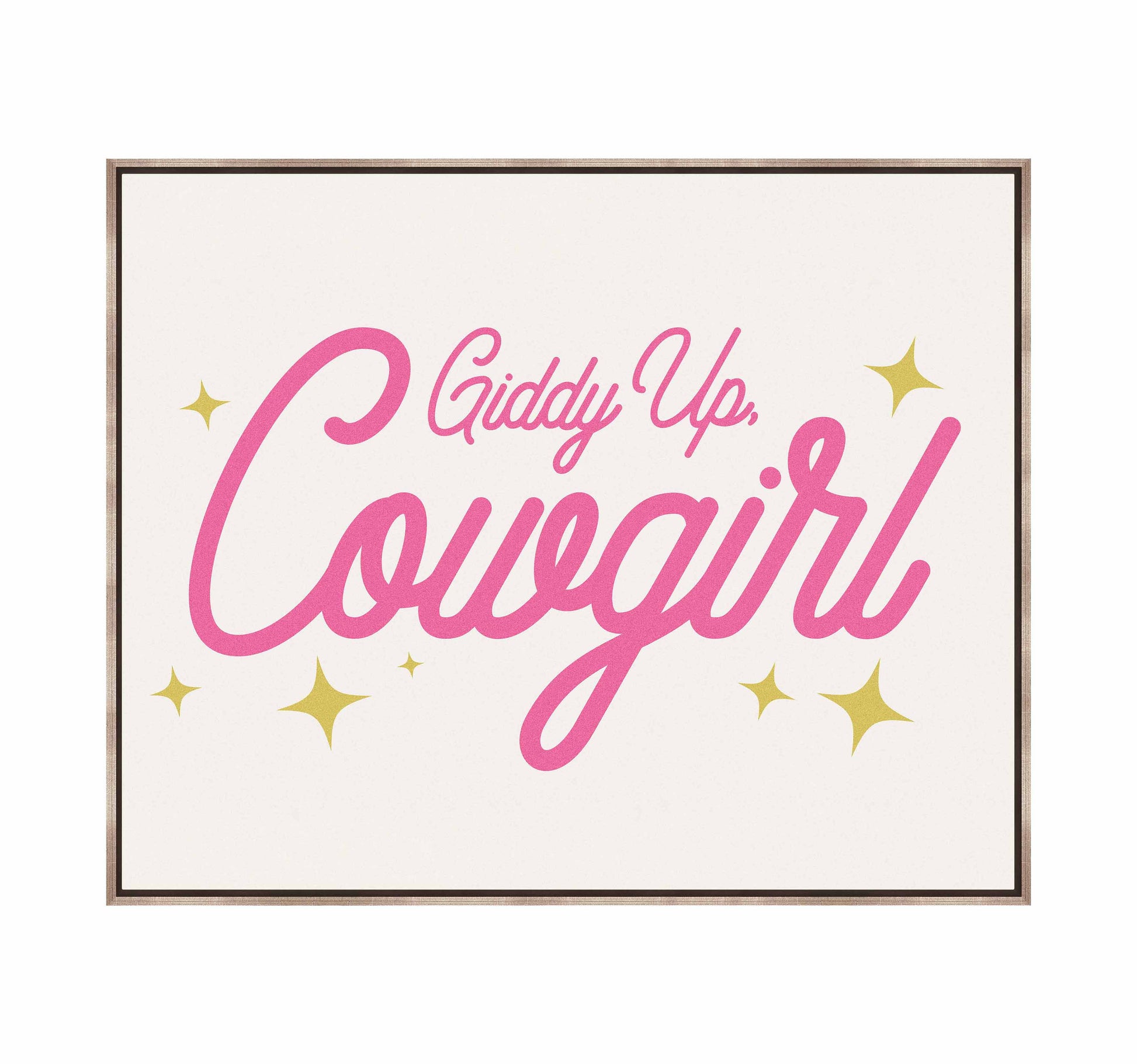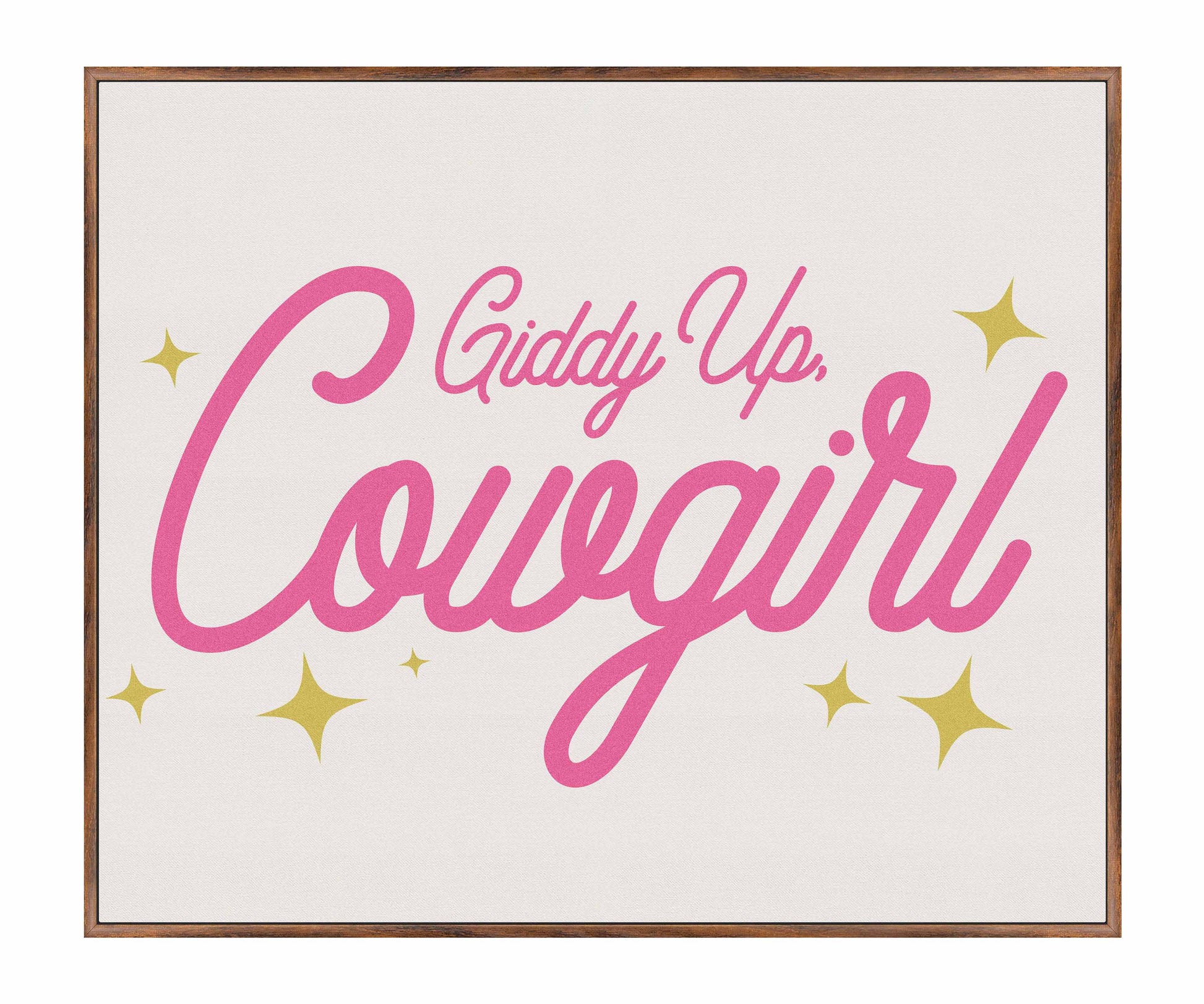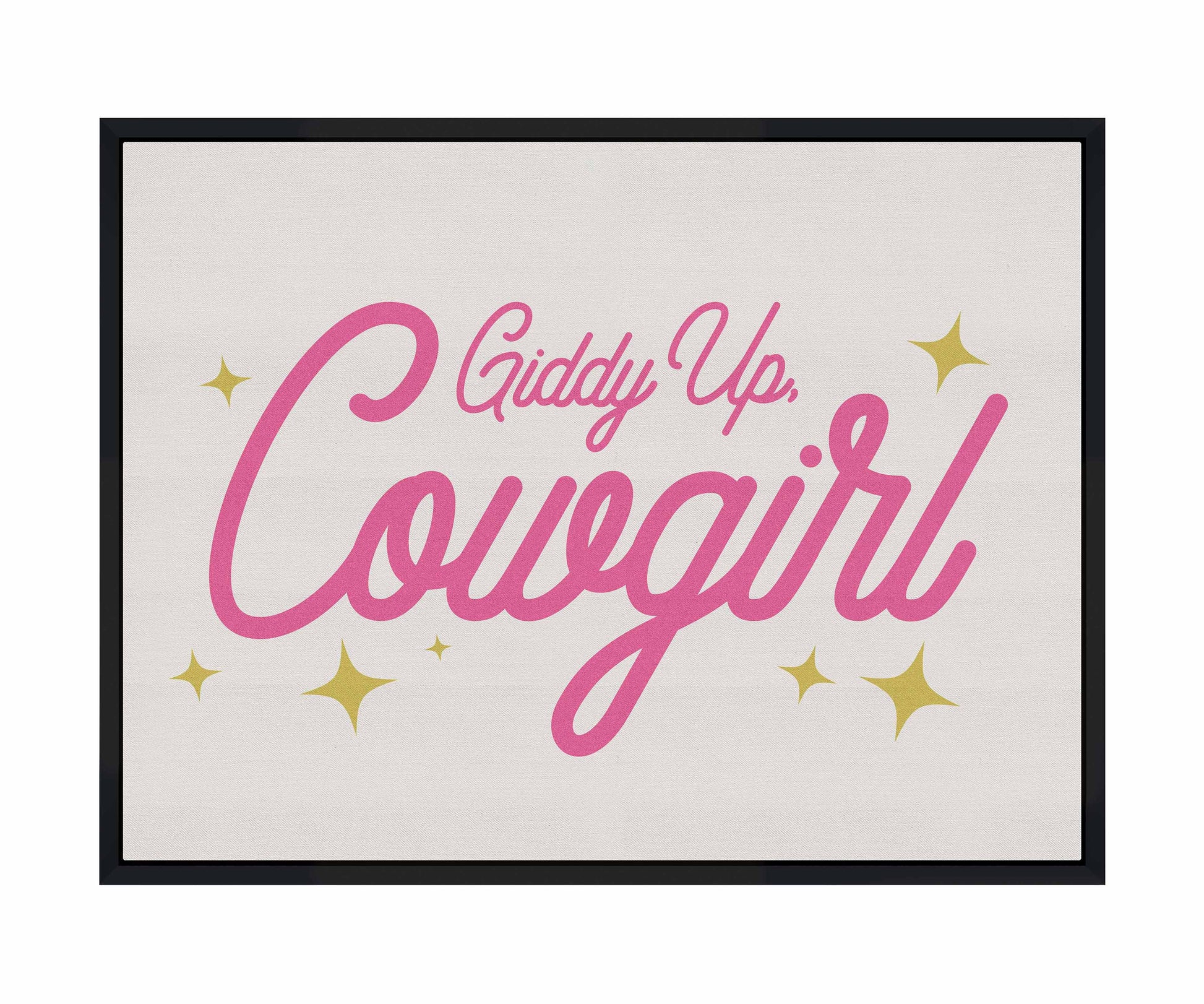 The sparkling star elements create a sense of movement, as though the words are shimmering under the Western sky, reinforcing the sense of freedom and adventure that comes with the cowgirl ethos. The simplicity of the composition, with its bold color contrast and elegant script, gives Giddy Up Cowgirl A a playful yet stylish edge, making it both a modern tribute to the Western lifestyle and a contemporary piece of art with universal appeal.