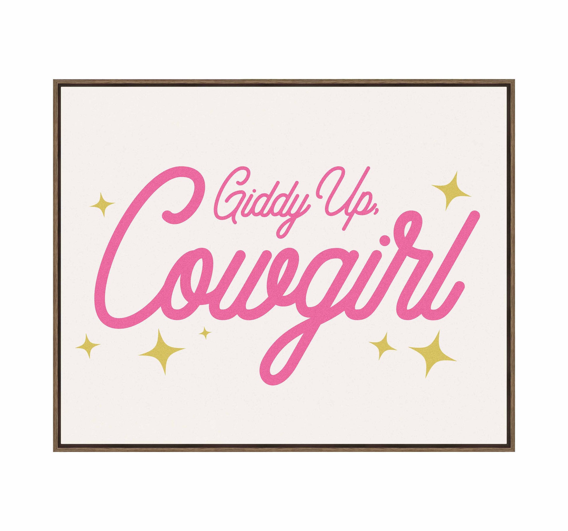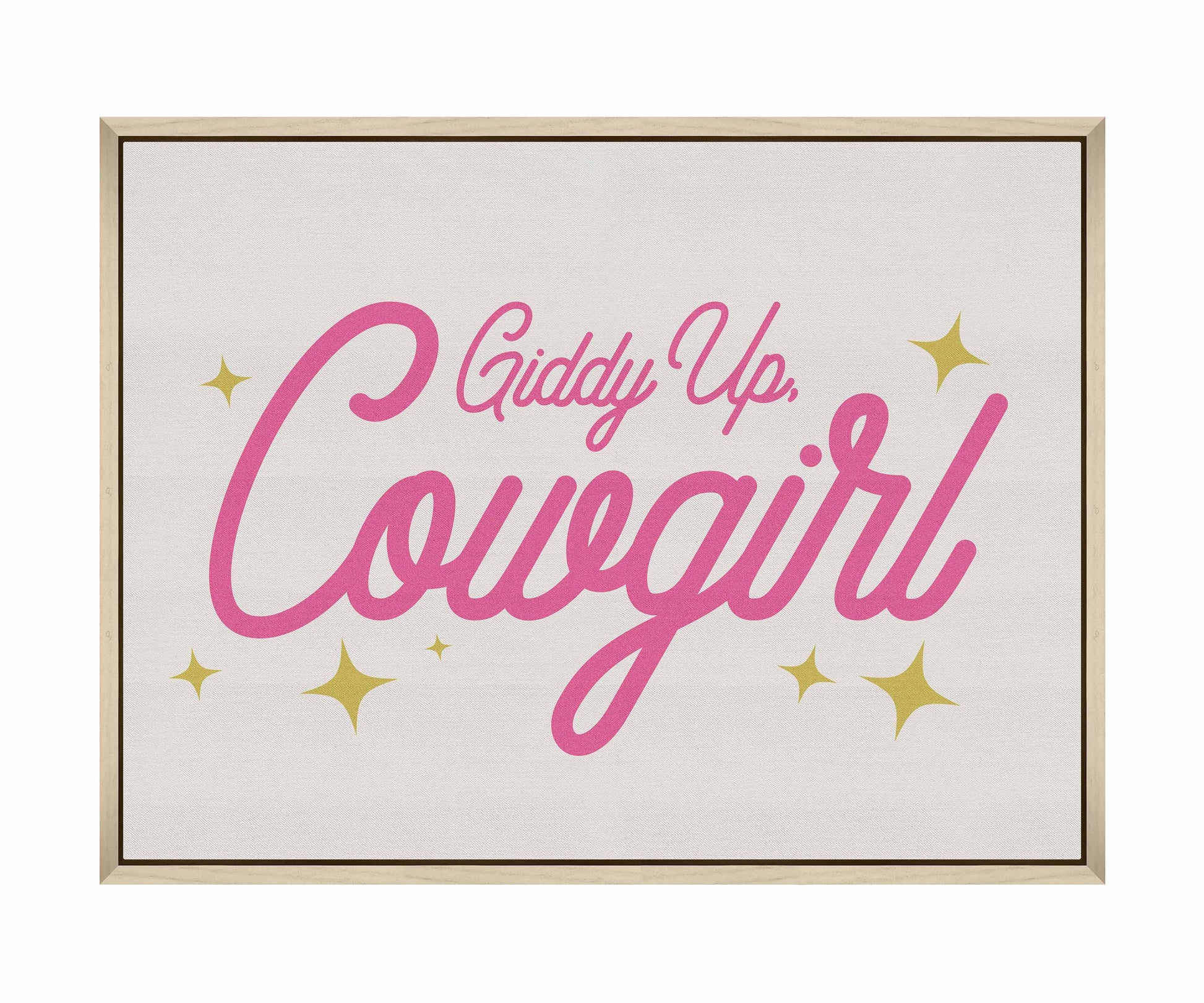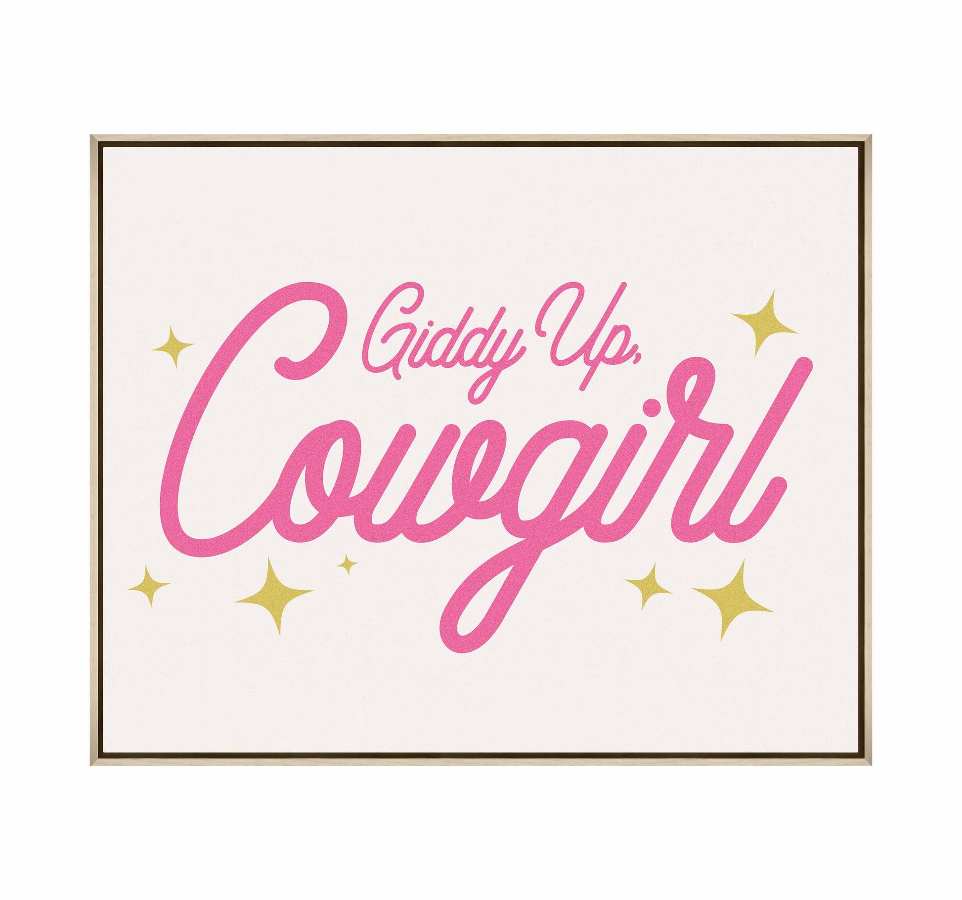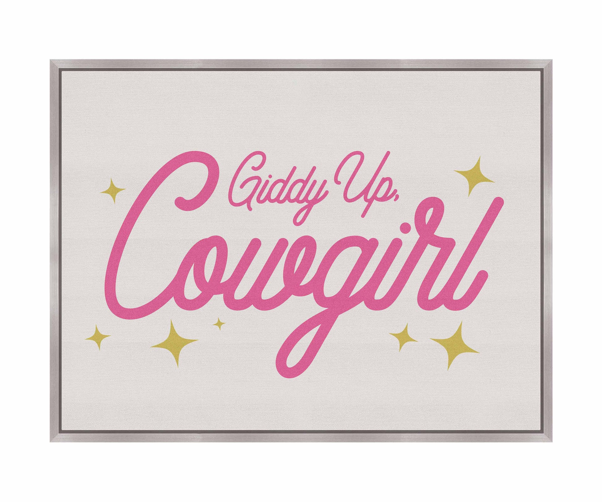 The sparkling star elements create a sense of movement, as though the words are shimmering under the Western sky, reinforcing the sense of freedom and adventure that comes with the cowgirl ethos. The simplicity of the composition, with its bold color contrast and elegant script, gives Giddy Up Cowgirl A a playful yet stylish edge, making it both a modern tribute to the Western lifestyle and a contemporary piece of art with universal appeal.